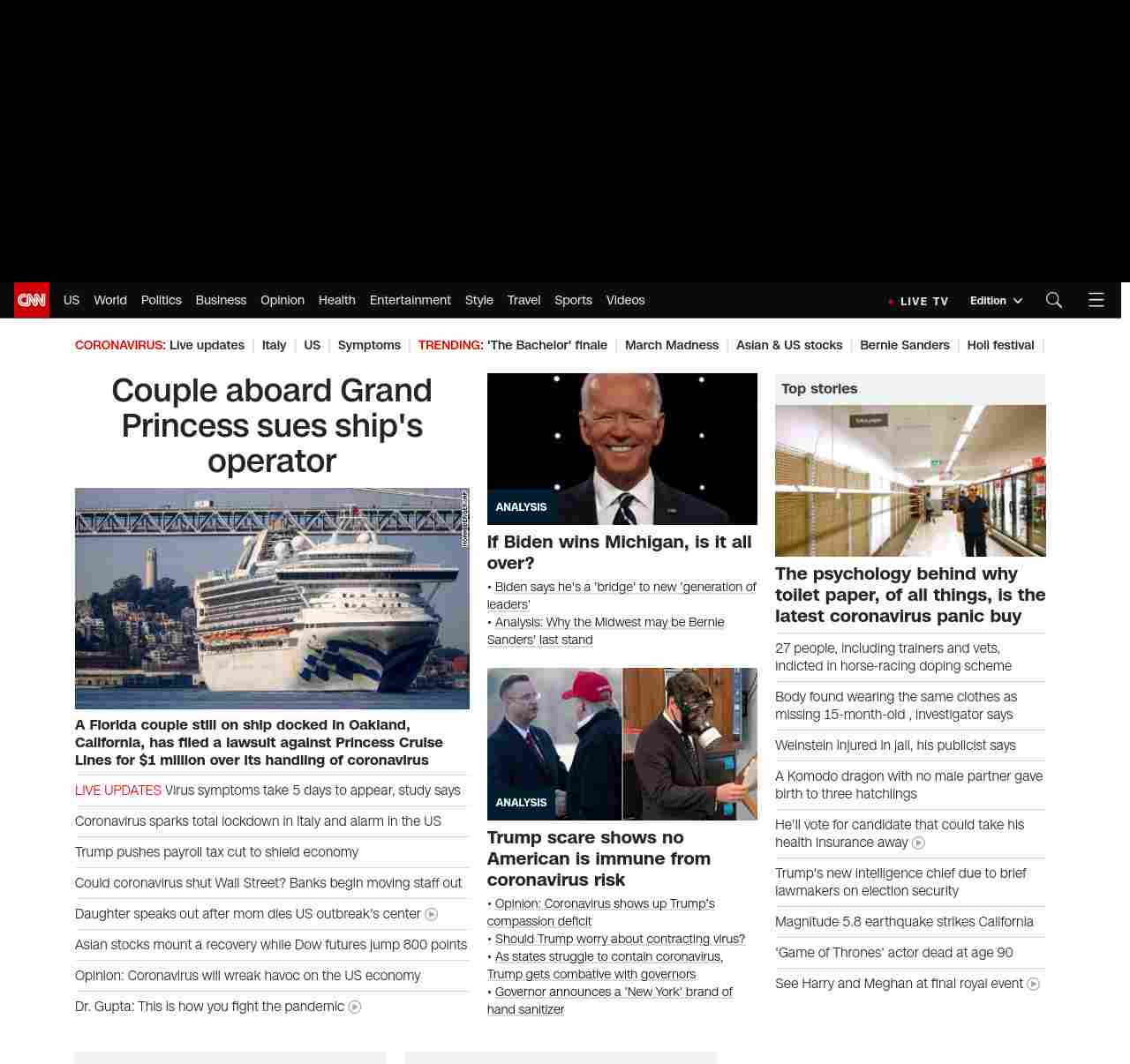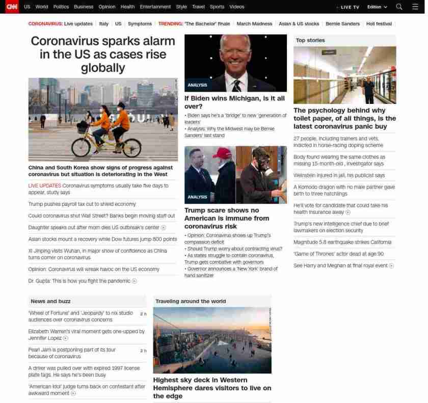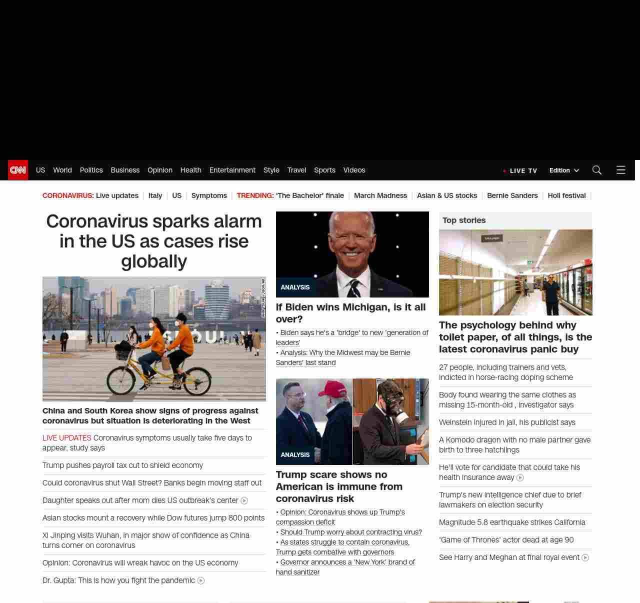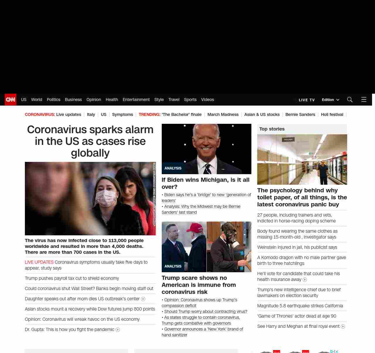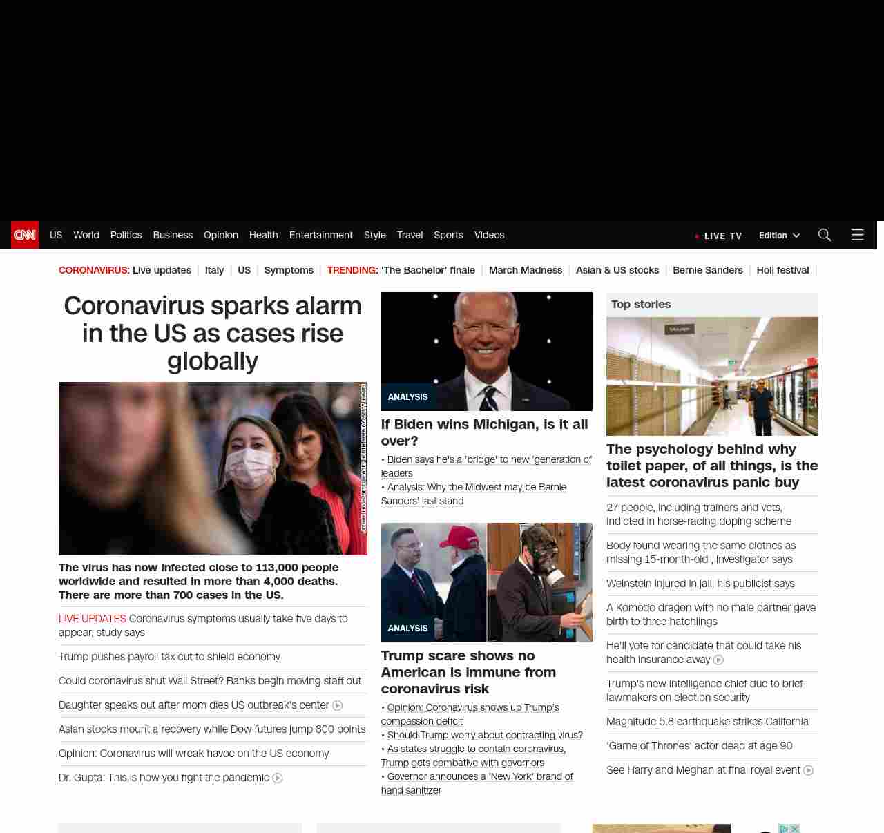 || screaming-banner-text banner-text-size–char-47″ data-analytics=”_list-hierarchical-xs_article_”> Coronavirus sparks alarm in the US as cases rise globally ||” , title: “CNN – Breaking News, Latest News and Videos” , siblings: {“articleList”:[{“uri”:”/2020/03/10/world/coronavirus-covid-19-update-intl-hnk/index.html”,”headline”:”u003cstrong>The virus has now infected close to 113,000 people worldwide and resulted in more than 4,000 deaths. There are more than 700 cases in the US.u003c/strong>”,”thumbnail”:”//cdn.cnn.com/cnnnext/dam/assets/200309220002-pba-coronavirus-miths-small-11.jpg”,”duration”:””,”description”:””,”layout”:””