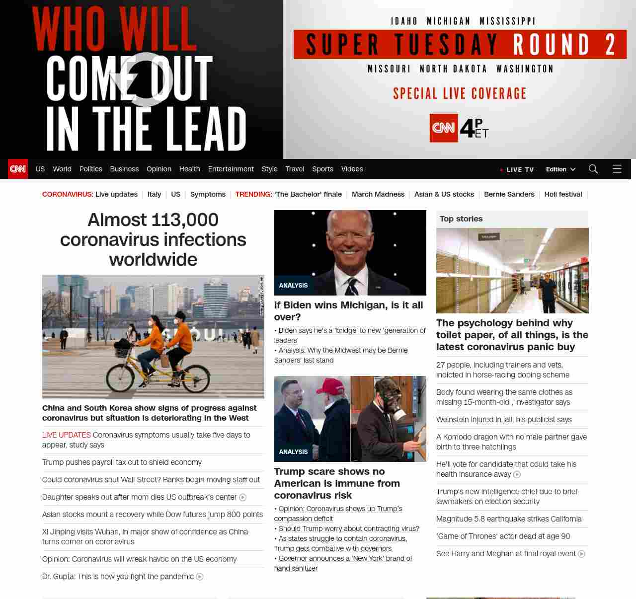 || screaming-banner-text banner-text-size–char-47″ data-analytics=”_list-hierarchical-xs_article_”> Almost 113,000 coronavirus infections worldwide ||” , title: “CNN – Breaking News, Latest News and Videos” , siblings: {“articleList”:[{“uri”:”/2020/03/10/world/coronavirus-covid-19-update-intl-hnk/index.html”,”headline”:”u003cstrong>China and South Korea show signs of progress against coronavirus but situation is deteriorating in the Westu003c/strong>”,”thumbnail”:”//cdn.cnn.com/cnnnext/dam/assets/200309165504-coronavirus-0307-seoul-small-11.jpg”,”duration”:””,”description”:””,”layout”:””