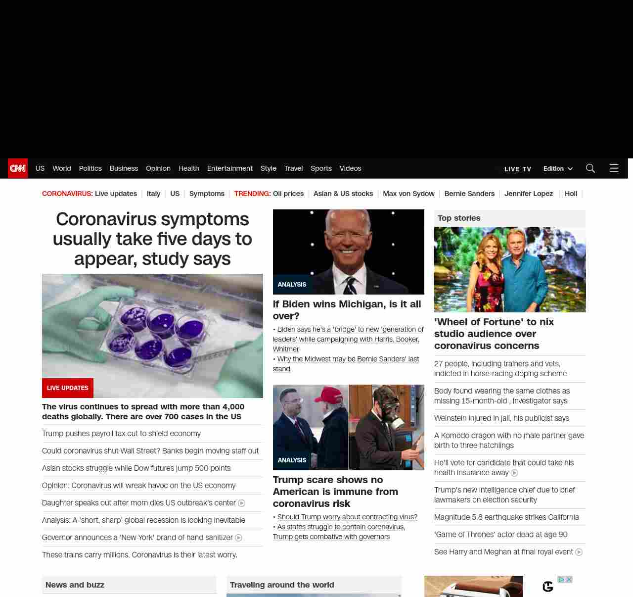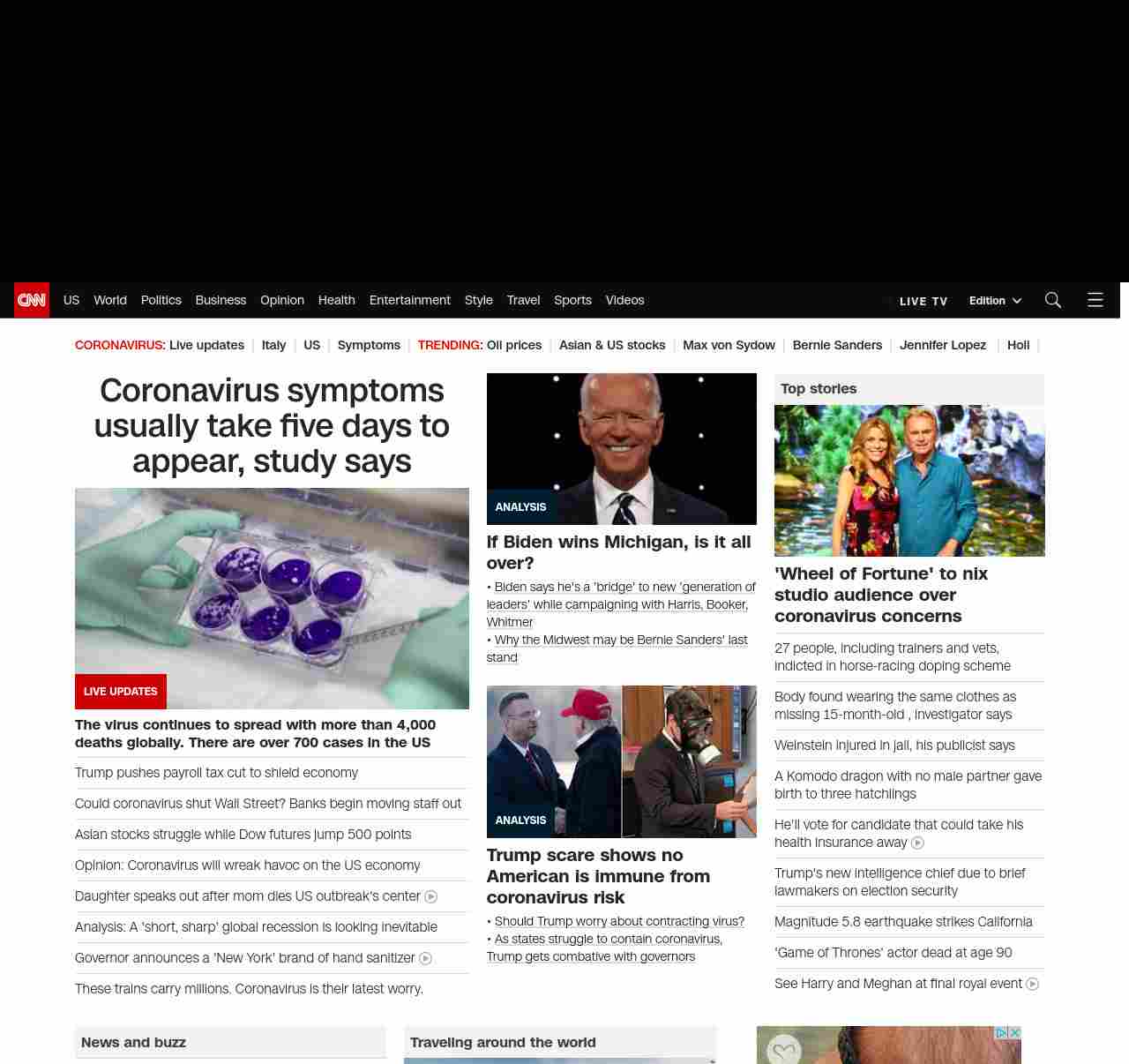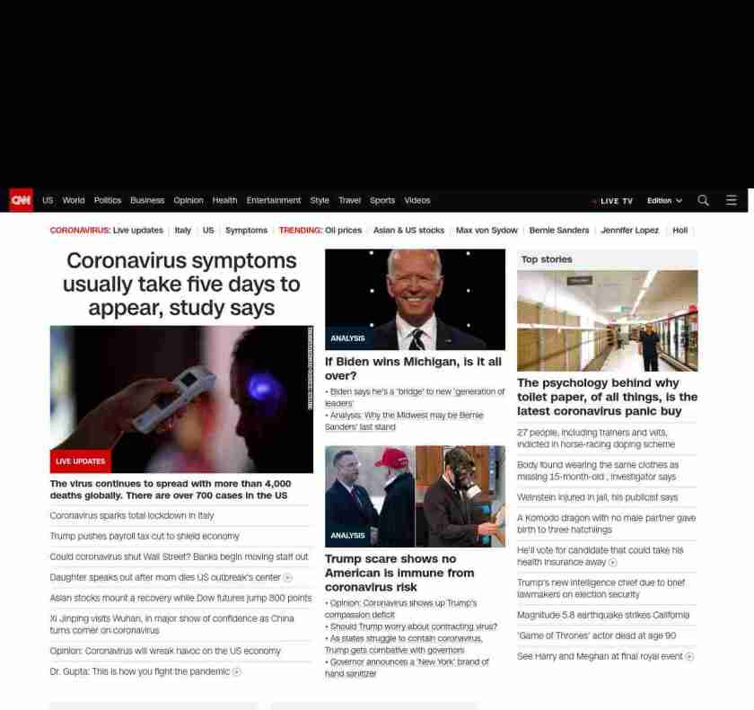 || screaming-banner-text banner-text-size–char-47″ data-analytics=”_list-hierarchical-xs_article_”> Coronavirus symptoms usually take five days to appear, study says ||” , title: “CNN – Breaking News, Latest News and Videos” , siblings: {“articleList”:[{“uri”:”/world/live-news/coronavirus-outbreak-03-10-20-intl-hnk/index.html”,”headline”:”u003cstrong>The virus continues to spread with more than 4,000 deaths globally. There are over 700 cases in the US u003c/strong>”,”thumbnail”:”//cdn.cnn.com/cnnnext/dam/assets/200305094230-coronavirus-guatemala-0302-small-11.jpg”,”duration”:””,”description”:””,”layout”:””
