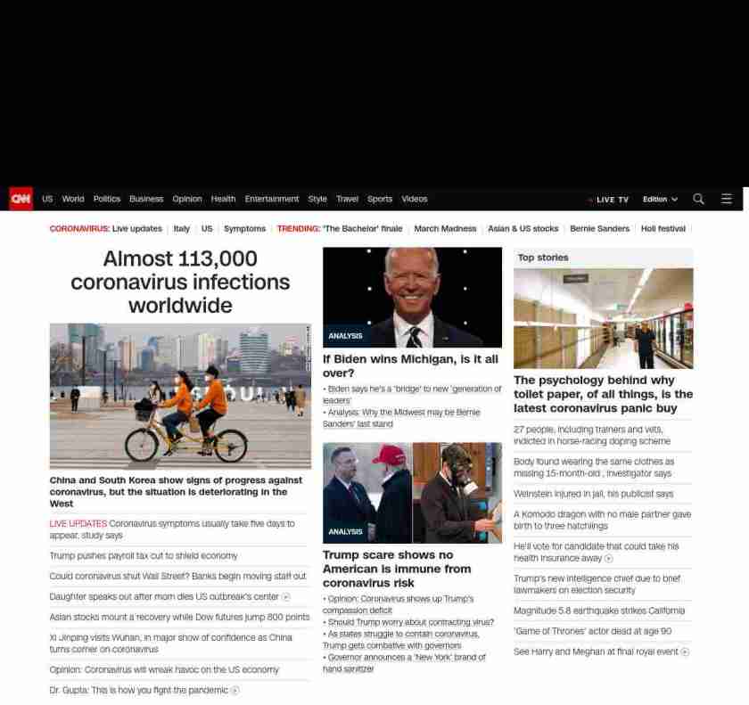 || screaming-banner-text banner-text-size–char-47″ data-analytics=”_list-hierarchical-xs_article_”> Almost 113,000 coronavirus infections worldwide ||” , title: “CNN – Breaking News, Latest News and Videos” , siblings: {“articleList”:[{“uri”:”/2020/03/10/world/coronavirus-covid-19-update-intl-hnk/index.html”,”headline”:”u003cstrong>China and South Korea show signs of progress against coronavirus, but the situation is deteriorating in the Westu003c/strong>”,”thumbnail”:”//cdn.cnn.com/cnnnext/dam/assets/200309165504-coronavirus-0307-seoul-small-11.jpg”,”duration”:””,”description”:””,”layout”:””