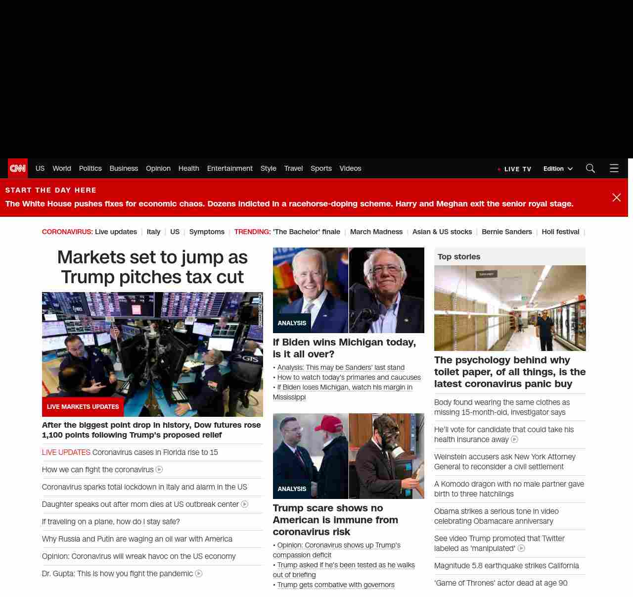 || screaming-banner-text banner-text-size–char-47″ data-analytics=”_list-hierarchical-xs_article_”> Markets set to jump as Trump pitches tax cut ||” , title: “CNN – Breaking News, Latest News and Videos” , siblings: {“articleList”:[{“uri”:”/business/live-news/stock-market-news-today-031020/index.html”,”headline”:”u003cstrong>After the biggest point drop in history, Dow futures rose 1,100 points following Trump’s proposed reliefu003c/strong>”,”thumbnail”:”//cdn.cnn.com/cnnnext/dam/assets/200309153633-25-stock-market-0309-new-york-small-11.jpg”,”duration”:””,”description”:””,”layout”:””