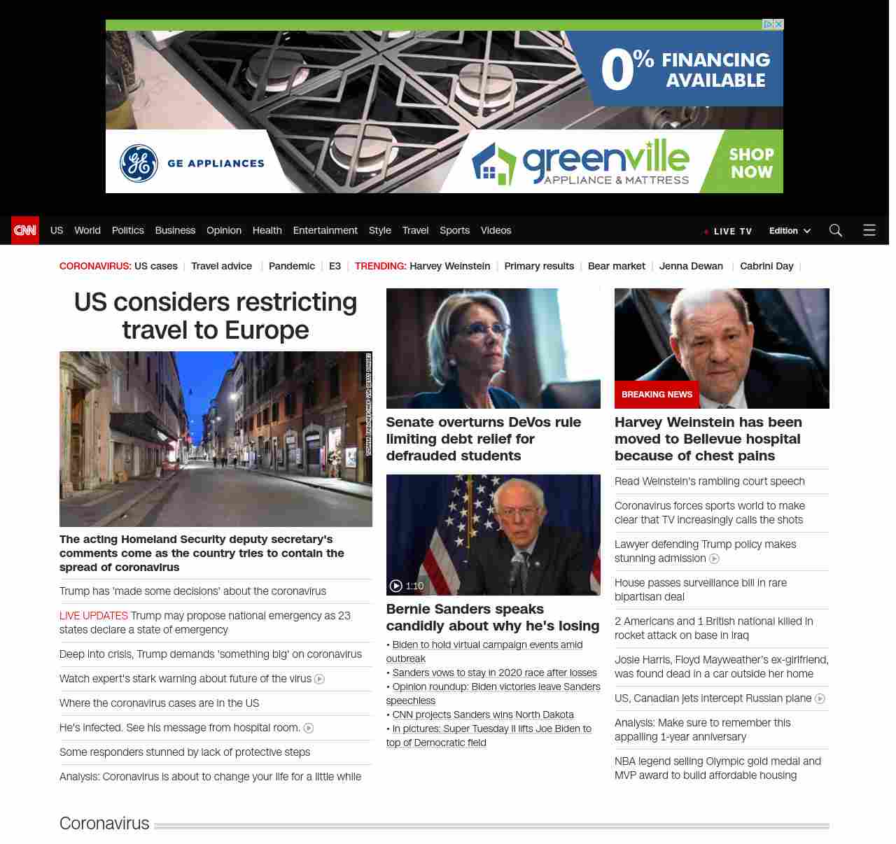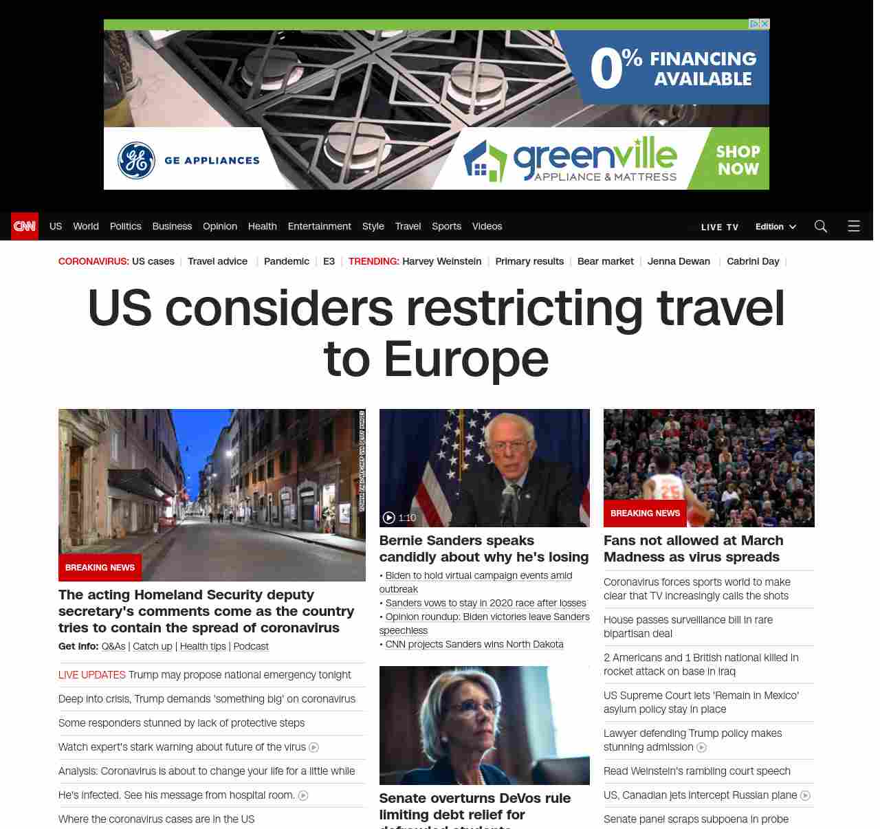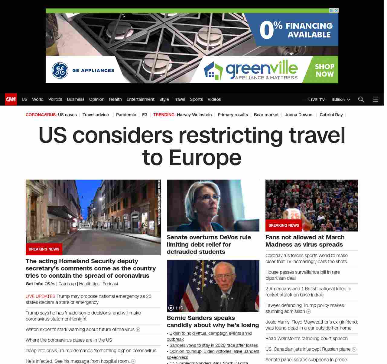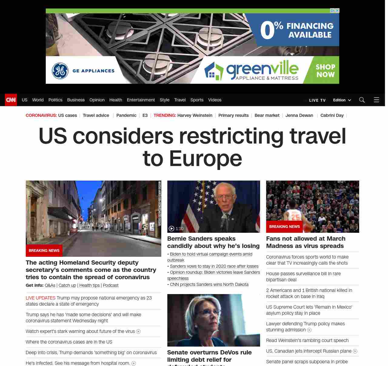 || banner-text–natural”> US considers restricting travel to Europe ||” , title: “CNN – Breaking News, Latest News and Videos” , siblings: {“articleList”:[{“uri”:”/2020/03/11/politics/donald-trump-coronavirus-statement/index.html”,”headline”:”Trump says he has ‘made some decisions’ and will make coronavirus statement tonight”,”thumbnail”:”//cdn.cnn.com/cnnnext/dam/assets/200311155807-01-trump-banking-leaders-0311-small-11.jpg”,”duration”:””,”description”:”u003ca href=”https://www.cnn.com/election/2020/candidate/trump” target=”_blank”>President Donald Trumpu003c/a> said he will be making a statement Wednesday evening to talk about the US response to the u003ca href=”https://www.cnn.com/world/live-news/coronavirus-outbreak-03-11-20-intl-hnk/index.html” target=”_blank”>ongoing novel coronavirus outbreaku003c/a>.”,”layout”:””
