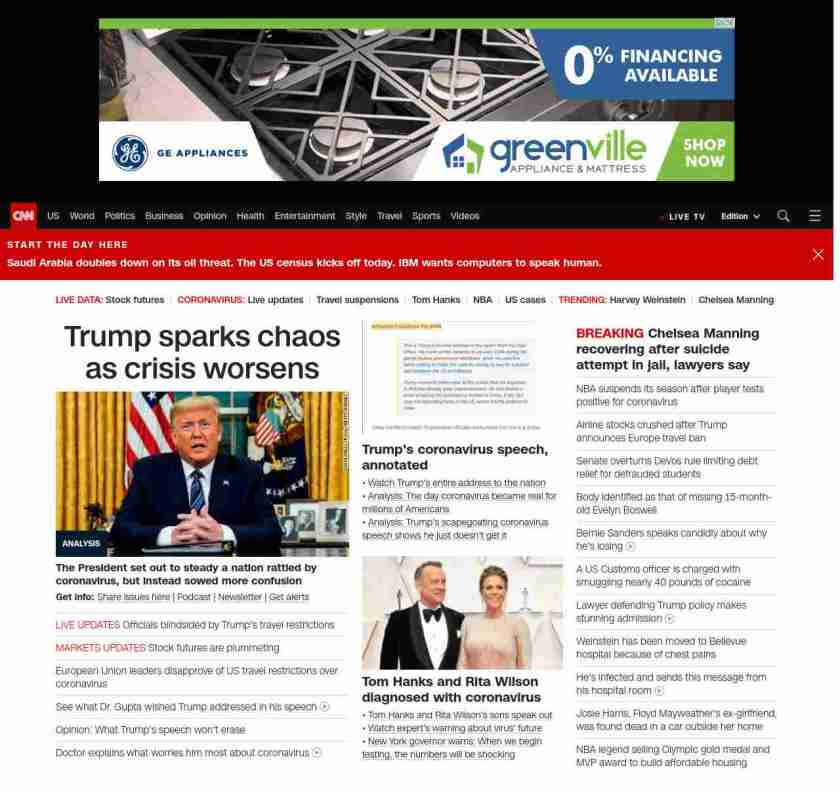 || screaming-banner-text banner-text-size–char-38″ data-analytics=”_list-hierarchical-xs_article_”> Trump sparks chaos as crisis worsens ||” , title: “CNN – Breaking News, Latest News and Videos” , siblings: {“articleList”:[{“uri”:”/2020/03/12/politics/donald-trump-coronavirus-europe-travel/index.html”,”headline”:”u003cstrong>The President set out to steady a nation rattled by coronavirus, but instead sowed more confusionu003c/strong>”,”thumbnail”:”//cdn.cnn.com/cnnnext/dam/assets/200311212014-04-trump-oval-office-address-0311-small-11.jpg”,”duration”:””,”description”:”u003cstrong>Get info: u003c/strong>u003ca href=”https://www.cnn.com/2020/03/11/us/coronavirus-testing-stories-invs/index.html” target=”_blank”>Share issues hereu003c/a> | u003ca href=”https://www.cnn.com/audio/podcasts/corona-virus” target=”_blank”>Podcastu003c/a> | u003ca href=”https://www.cnn.com/specials/coronavirus-newsletter?utm_source=hp&source=hp” target=”_blank”>Newsletteru003c/a> | u003ca href=”https://smart.link/2ogidty6y6mlh” target=”_blank”>Get alertsu003c/a>”,”layout”:””