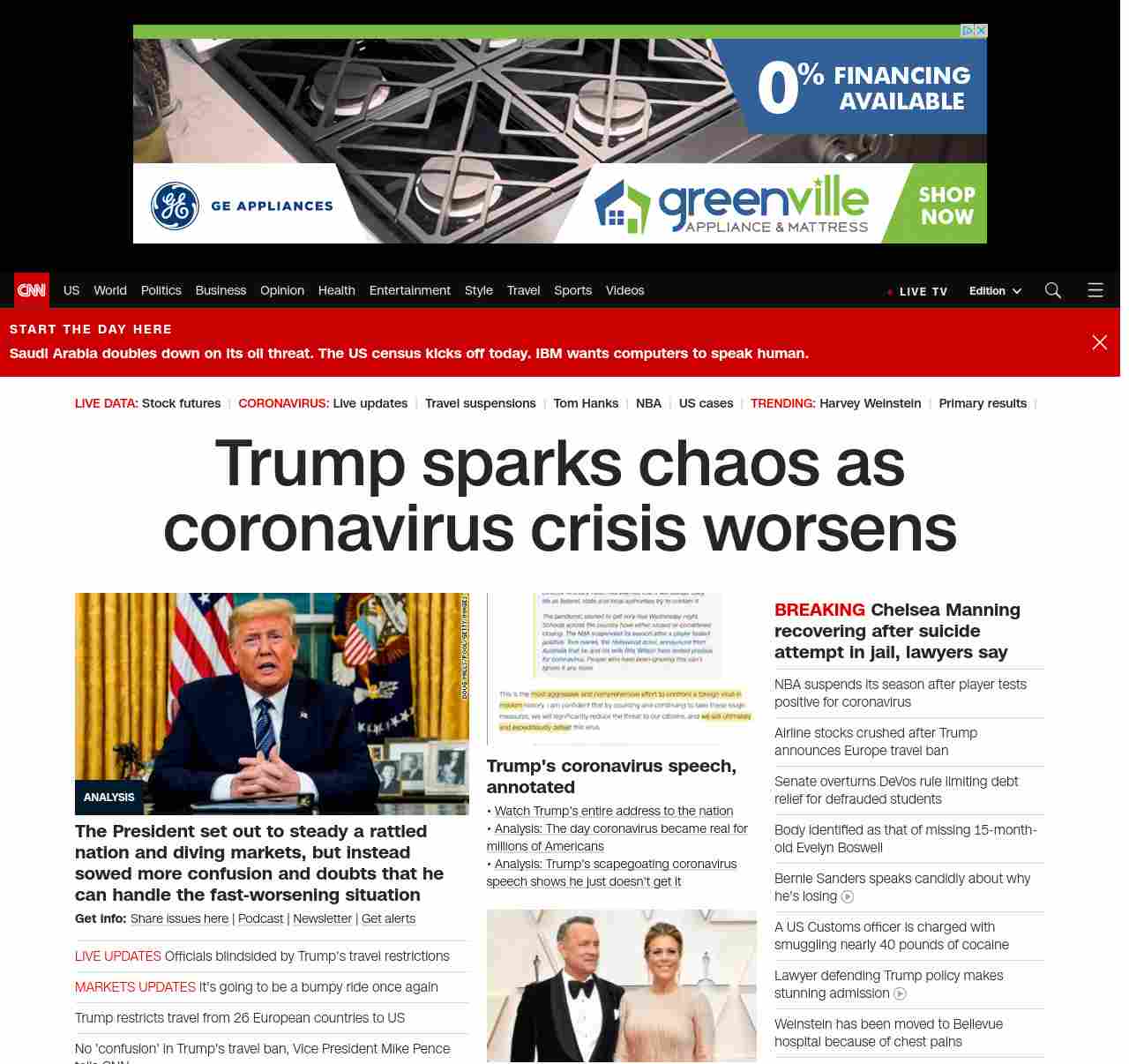 || banner-text–natural”> Trump sparks chaos as coronavirus crisis worsens ||” , title: “CNN – Breaking News, Latest News and Videos” , siblings: {“articleList”:[{“uri”:”/2020/03/12/politics/donald-trump-coronavirus-europe-travel/index.html”,”headline”:”u003cstrong>The President set out to steady a rattled nation and diving markets, but instead sowed more confusion and doubts that he can handle the fast-worsening situationu003c/strong>”,”thumbnail”:”//cdn.cnn.com/cnnnext/dam/assets/200311212014-04-trump-oval-office-address-0311-small-11.jpg”,”duration”:””,”description”:”u003cstrong>Get info: u003c/strong>u003ca href=”https://www.cnn.com/2020/03/11/us/coronavirus-testing-stories-invs/index.html” target=”_blank”>Share issues hereu003c/a> | u003ca href=”https://www.cnn.com/audio/podcasts/corona-virus” target=”_blank”>Podcastu003c/a> | u003ca href=”https://www.cnn.com/specials/coronavirus-newsletter?utm_source=hp&source=hp” target=”_blank”>Newsletteru003c/a> | u003ca href=”https://smart.link/2ogidty6y6mlh” target=”_blank”>Get alertsu003c/a>”,”layout”:””