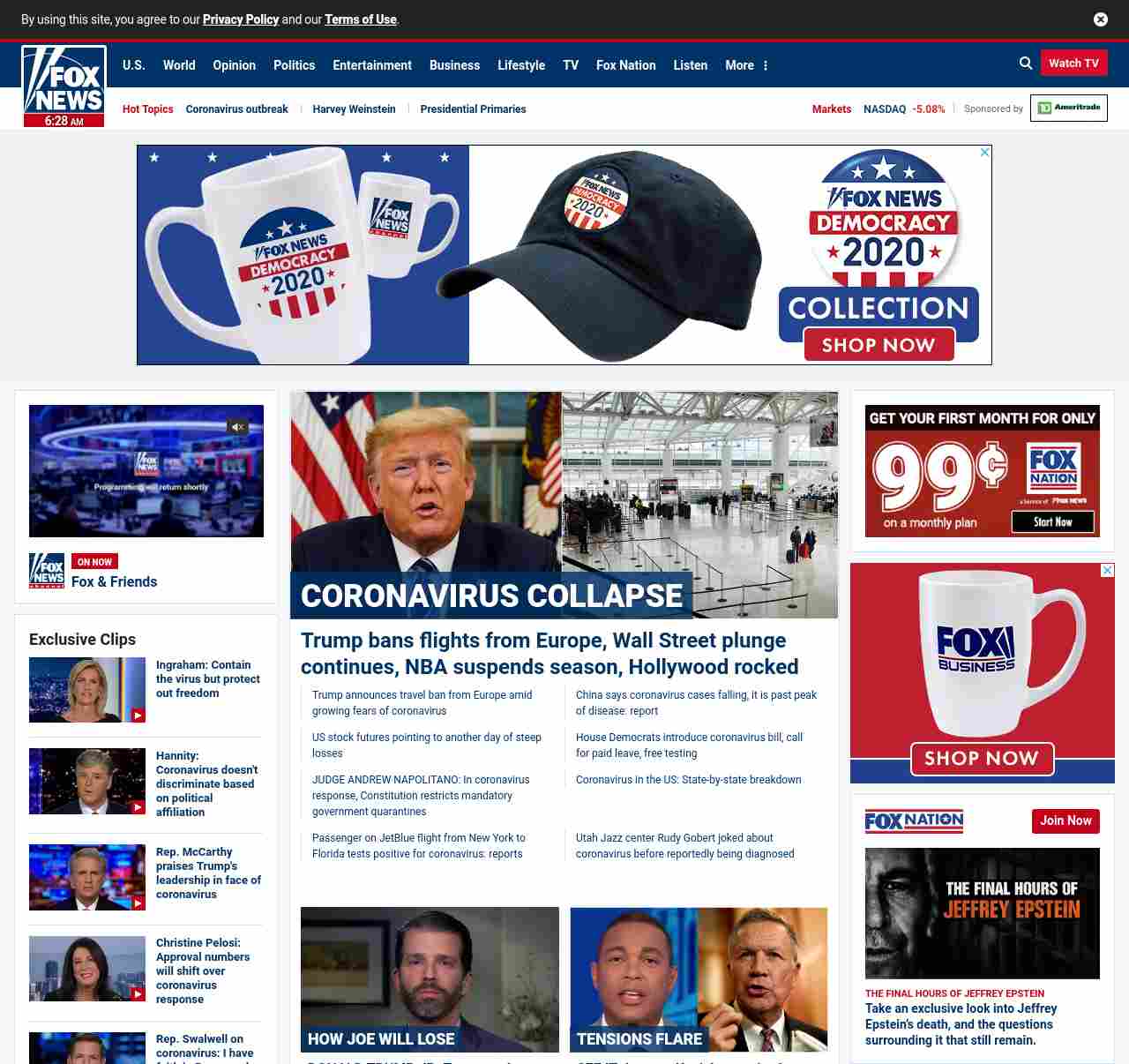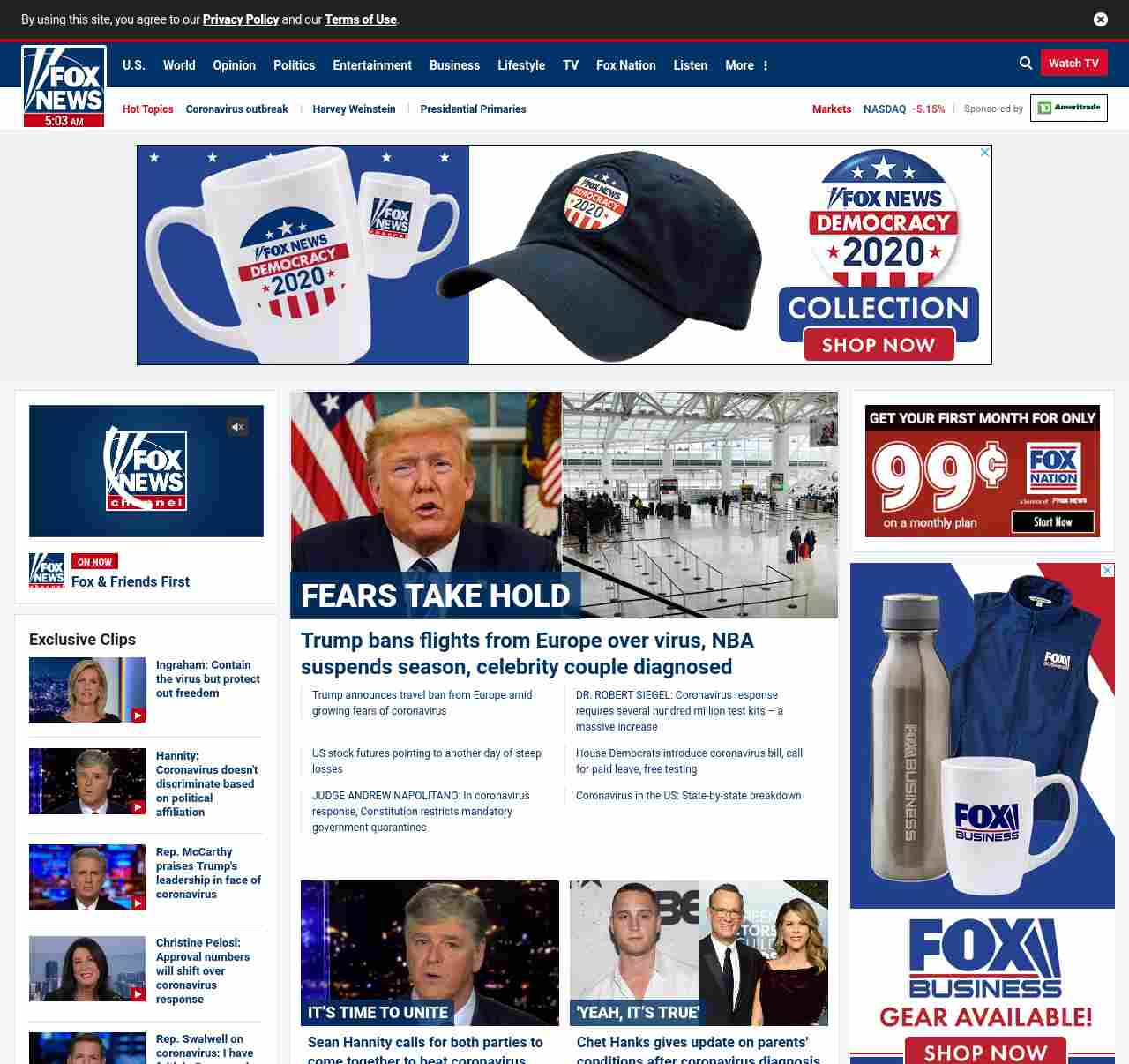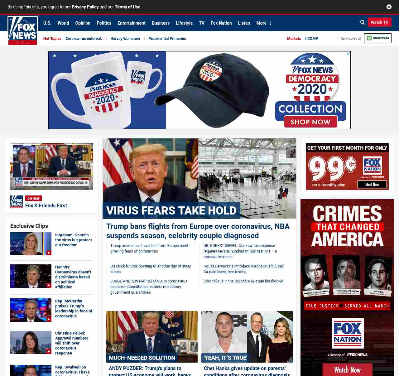 FN: [[VIRUS FEARS TAKE HOLD]] Trump bans flights from Europe over coronavirus, NBA suspends season, celebrity couple diagnosed ((lubuntu at wor3))