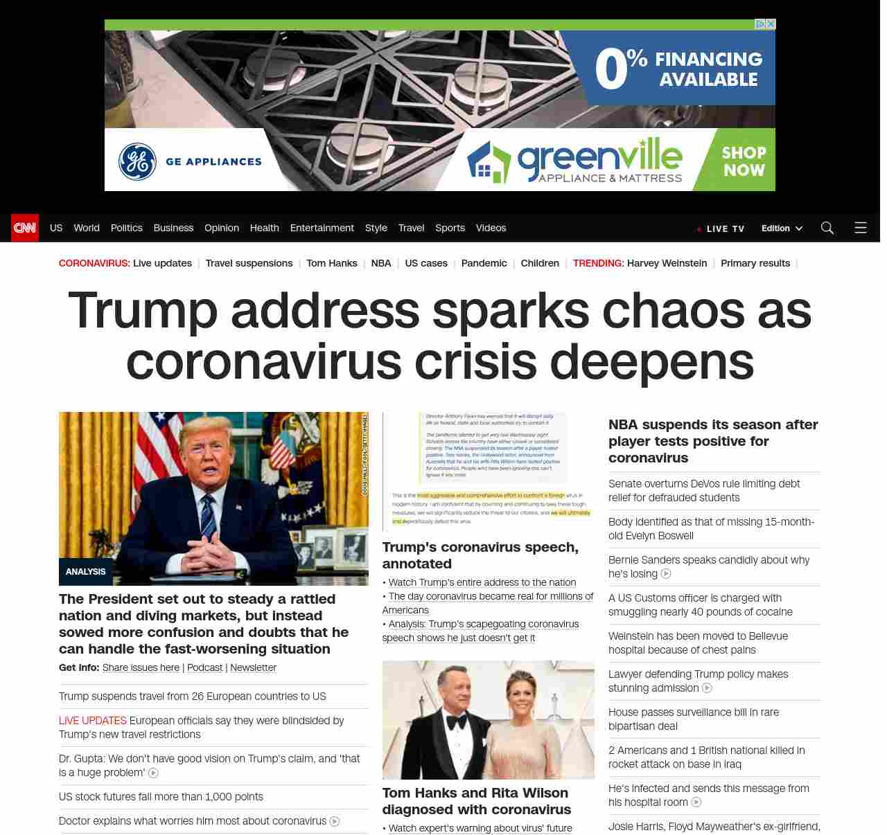 || banner-text–natural”> Trump address sparks chaos as coronavirus crisis deepens ||” , title: “CNN – Breaking News, Latest News and Videos” , siblings: {“articleList”:[{“uri”:”/2020/03/12/politics/donald-trump-coronavirus-europe-travel/index.html”,”headline”:”u003cstrong>The President set out to steady a rattled nation and diving markets, but instead sowed more confusion and doubts that he can handle the fast-worsening situationu003c/strong>”,”thumbnail”:”//cdn.cnn.com/cnnnext/dam/assets/200311212014-04-trump-oval-office-address-0311-small-11.jpg”,”duration”:””,”description”:”u003cstrong>Get info: u003c/strong>u003ca href=”https://www.cnn.com/2020/03/11/us/coronavirus-testing-stories-invs/index.html” target=”_blank”>Share issues hereu003c/a> | u003ca href=”https://www.cnn.com/audio/podcasts/corona-virus” target=”_blank”>Podcastu003c/a> | u003ca href=”https://www.cnn.com/specials/coronavirus-newsletter?utm_source=hp&source=hp” target=”_blank”>Newsletteru003c/a>”,”layout”:””