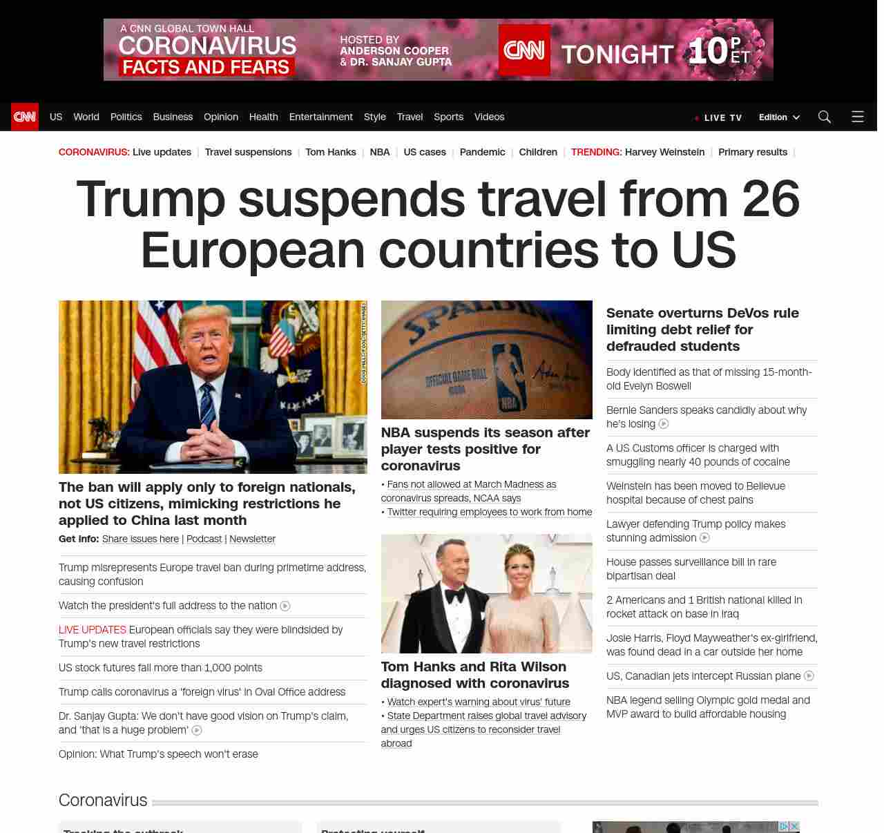|| banner-text–natural”> Trump suspends travel from 26 European countries to US ||” , title: “CNN – Breaking News, Latest News and Videos” , siblings: {“articleList”:[{“uri”:”/videos/politics/2020/03/12/donald-trump-coronavirus-address-march-11-2020-sot-vpx.cnn”,”headline”:”Watch the president’s full address to the nation”,”thumbnail”:”//cdn.cnn.com/cnnnext/dam/assets/200311211631-donald-trump-oval-office-march-11-2020-04-small-11.jpg”,”duration”:”09:30″,”description”:”President Donald Trump addressed the nation about the growing coronavirus pandemic, where he announced a u003ca href=”http://www.cnn.com/2020/03/11/politics/donald-trump-coronavirus-statement/index.html” target=”_blank”>temporary travel ban on travel from Europeu003c/a> and provide low-interest loans to small businesses.”,”layout”:””,”iconType”:”video”