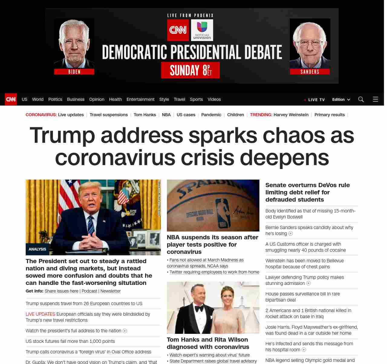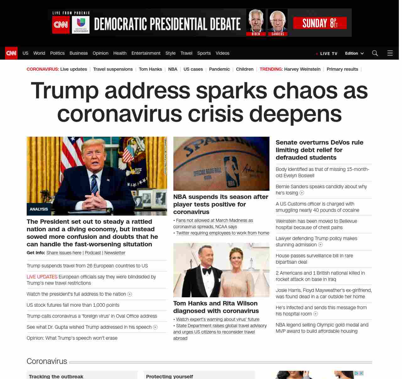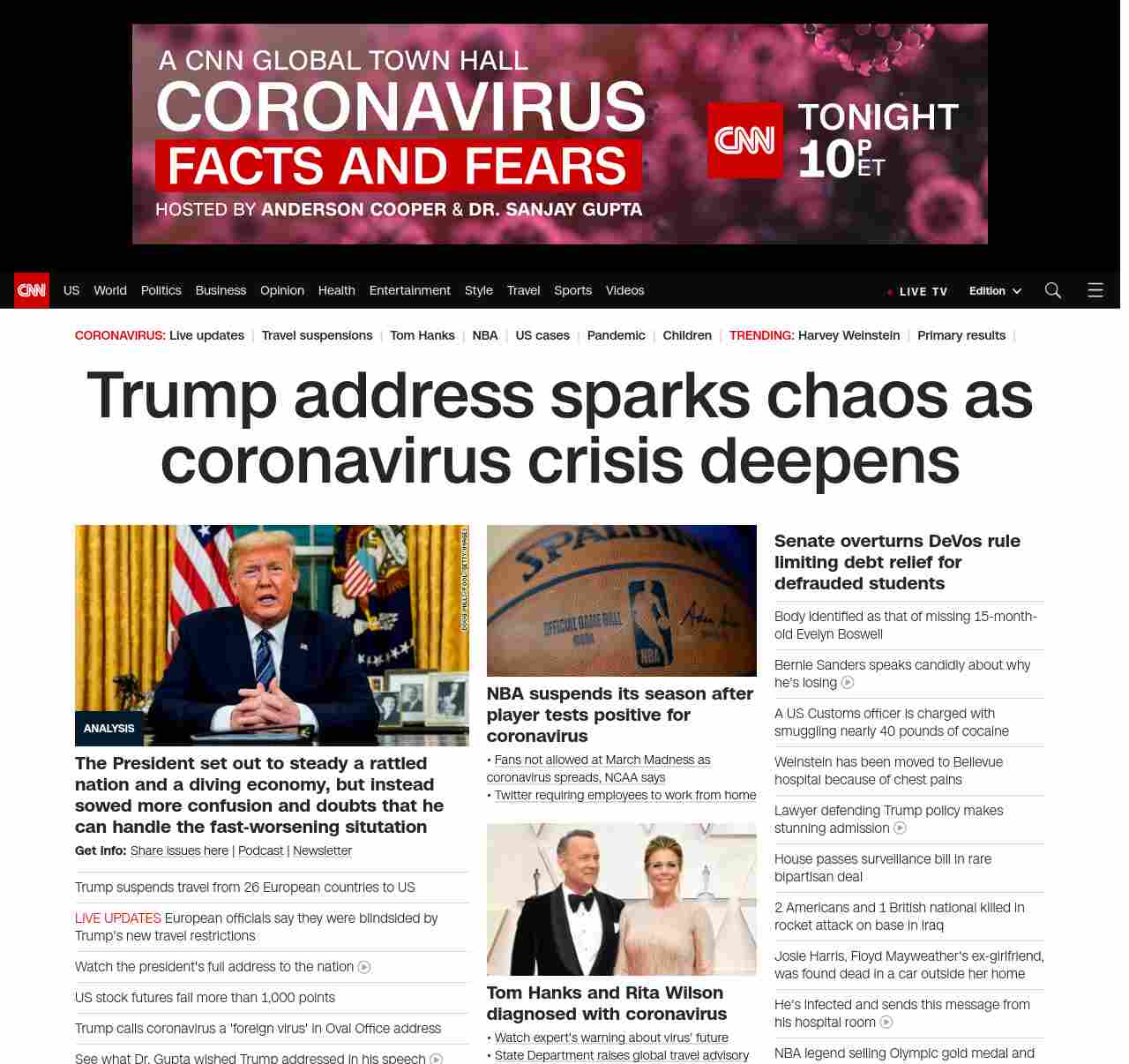 || banner-text–natural”> Trump address sparks chaos as coronavirus crisis deepens ||” , title: “CNN – Breaking News, Latest News and Videos” , siblings: {“articleList”:[{“uri”:”/2020/03/12/politics/donald-trump-coronavirus-europe-travel/index.html”,”headline”:”u003cstrong>The President set out to steady a rattled nation and a diving economy, but instead sowed more confusion and doubts that he can handle the fast-worsening situtationu003c/strong>”,”thumbnail”:”//cdn.cnn.com/cnnnext/dam/assets/200311212014-04-trump-oval-office-address-0311-small-11.jpg”,”duration”:””,”description”:”u003cstrong>Get info: u003c/strong>u003ca href=”https://www.cnn.com/2020/03/11/us/coronavirus-testing-stories-invs/index.html” target=”_blank”>Share issues hereu003c/a> | u003ca href=”https://www.cnn.com/audio/podcasts/corona-virus” target=”_blank”>Podcastu003c/a> | u003ca href=”https://www.cnn.com/specials/coronavirus-newsletter?utm_source=hp&source=hp” target=”_blank”>Newsletteru003c/a>”,”layout”:””