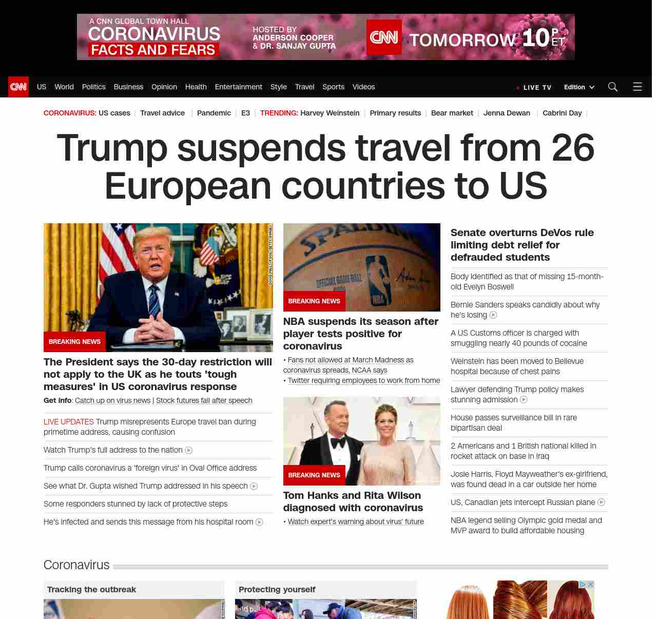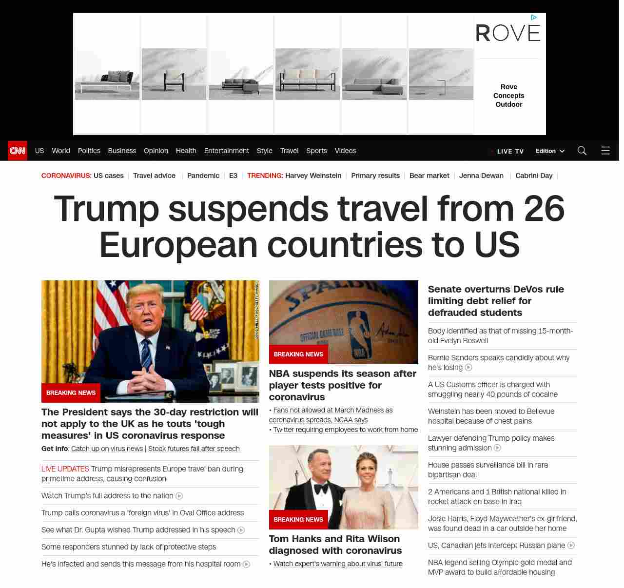 || banner-text–natural”> Trump suspends travel from Europe to US ||” , title: “CNN – Breaking News, Latest News and Videos” , siblings: {“articleList”:[{“uri”:”/videos/politics/2020/03/12/donald-trump-coronavirus-address-march-11-2020-sot-vpx.cnn”,”headline”:”Watch Trump’s full address to the nation”,”thumbnail”:”//cdn.cnn.com/cnnnext/dam/assets/200311211631-donald-trump-oval-office-march-11-2020-04-small-11.jpg”,”duration”:”09:30″,”description”:”President Donald Trump addressed the nation about the growing coronavirus pandemic, where he announced a u003ca href=”http://www.cnn.com/2020/03/11/politics/donald-trump-coronavirus-statement/index.html” target=”_blank”>temporary travel ban on travel from Europeu003c/a> and provide low-interest loans to small businesses.”,”layout”:””,”iconType”:”video”