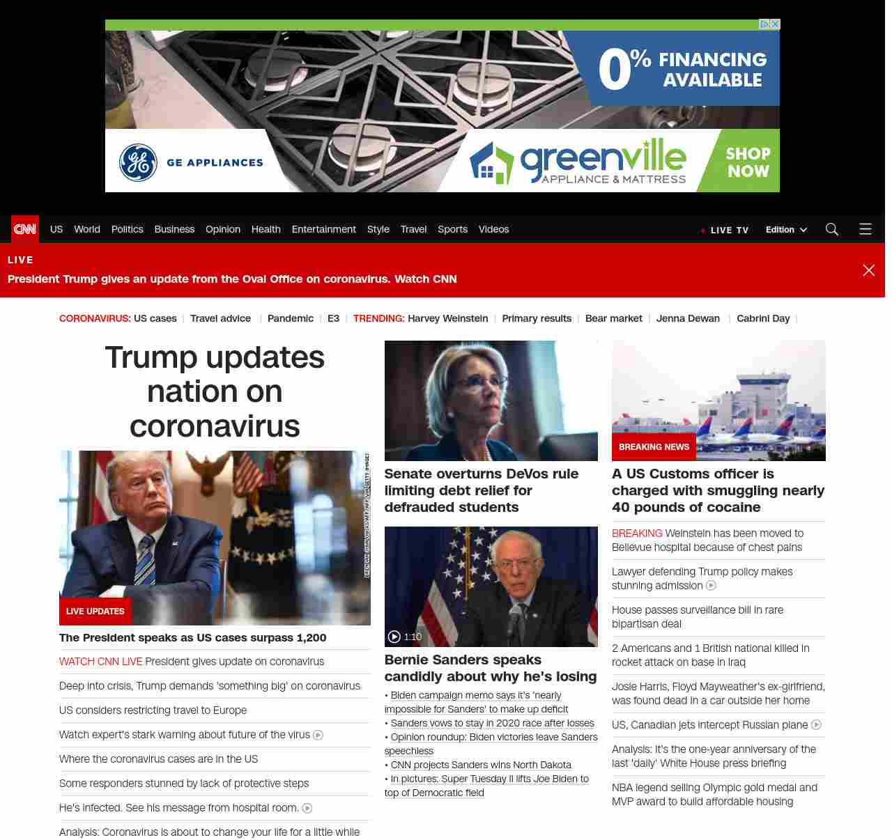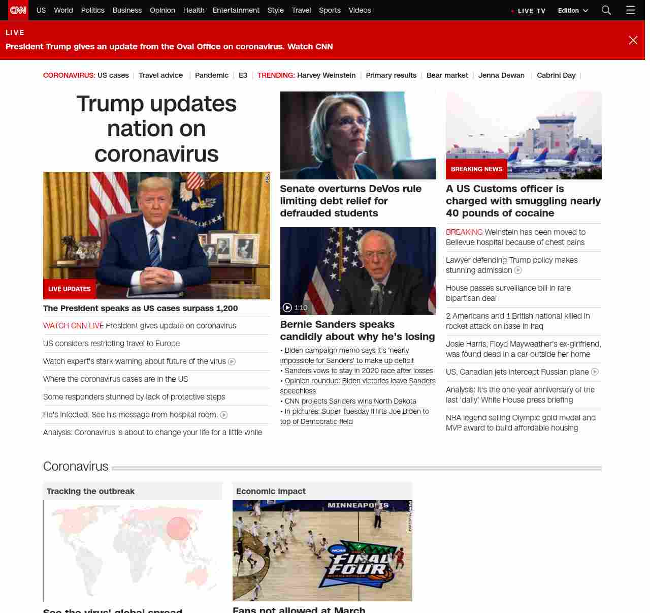 || screaming-banner-text banner-text-size–char-38″ data-analytics=”_list-hierarchical-xs_hyperlink_”> Trump updates nation on coronavirus ||” , title: “CNN – Breaking News, Latest News and Videos” , siblings: {“articleList”:[{“uri”:”/videos/politics/2020/03/11/coronavirus-worse-sot-fauci-lead-vpx.cnn”,”headline”:”Watch expert’s stark warning about future of the virus”,”thumbnail”:”//cdn.cnn.com/cnnnext/dam/assets/200311162725-fauci-capitol-hill-3-11-small-11.jpg”,”duration”:”02:51″,”description”:”Dr. Anthony Fauci, director of NIH’s National Institute of Allergy and Infectious Diseases, told lawmakers that he expects the situation with the novel coronavirus to get worse in the US in the coming days. “,”layout”:””,”iconType”:”video”