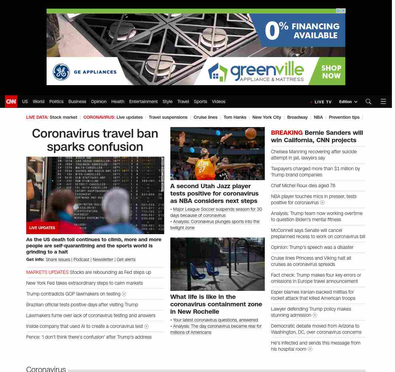 || screaming-banner-text banner-text-size–char-41″ data-analytics=”_list-hierarchical-xs_hyperlink_”> Coronavirus travel ban sparks confusion ||” , title: “CNN – Breaking News, Latest News and Videos” , siblings: {“articleList”:[{“uri”:”/business/live-news/stock-market-news-today-031220/index.html”,”headline”:”Stocks are rebounding as Fed steps up”,”thumbnail”:”//cdn.cnn.com/cnnnext/dam/assets/200311161934-nyse-floor-0311-small-11.jpg”,”duration”:””,”description”:”u003cstrong>Get info: u003c/strong>u003ca href=”https://www.cnn.com/2020/03/11/us/coronavirus-testing-stories-invs/index.html” target=”_blank”>Share issues hereu003c/a> | u003ca href=”https://www.cnn.com/audio/podcasts/corona-virus” target=”_blank”>Podcastu003c/a> | u003ca href=”https://www.cnn.com/specials/coronavirus-newsletter?utm_source=hp&source=hp” target=”_blank”>Newsletteru003c/a> | u003ca href=”https://smart.link/2ogidty6y6mlh” target=”_blank”>Get alertsu003c/a>”,”layout”:””