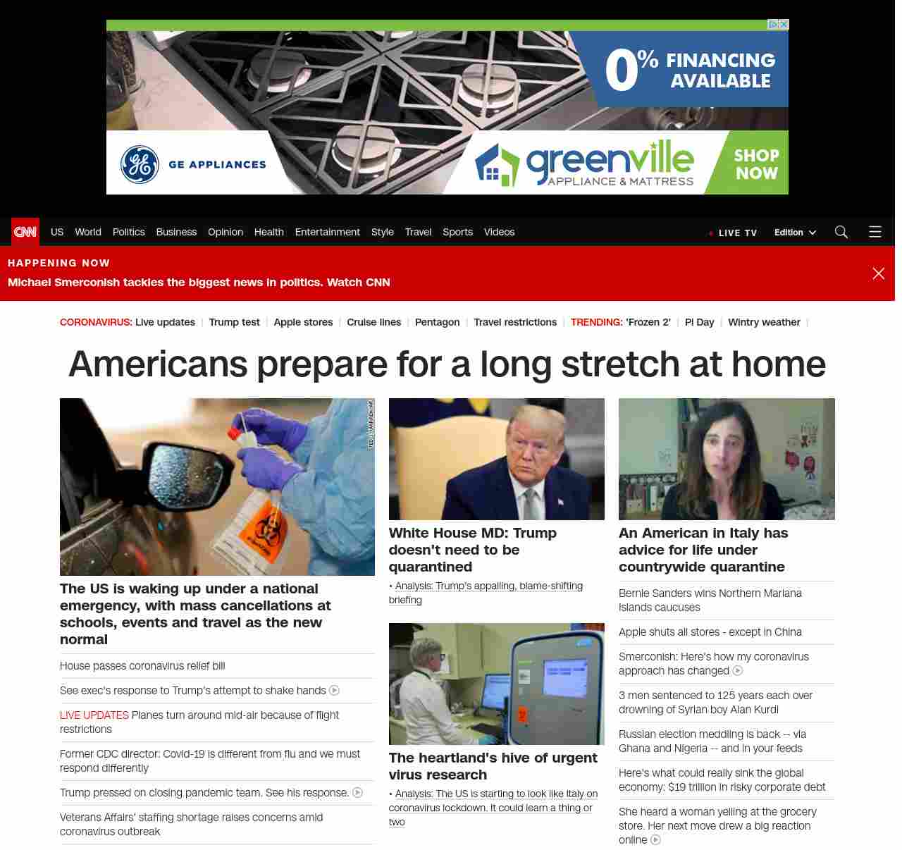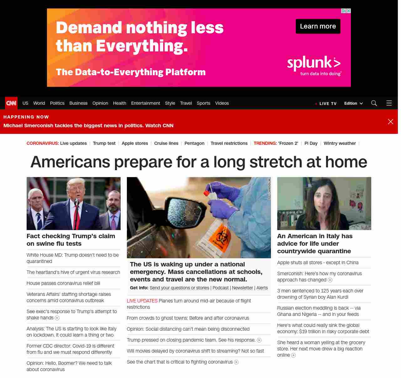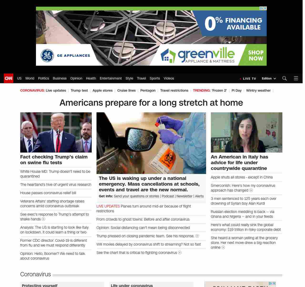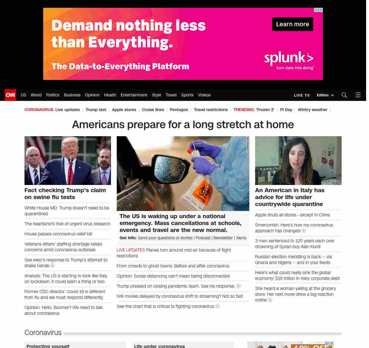 || banner-text–maximized banner-text-size–char-41″> America adapts to life with coronavirus ||” , title: “CNN – Breaking News, Latest News and Videos” , siblings: {“articleList”:[{“uri”:”/2020/03/13/politics/fact-checking-trumps-claim-on-swine-flu-tests/index.html”,”headline”:”Fact checking Trump’s claim on swine flu tests”,”thumbnail”:”//cdn.cnn.com/cnnnext/dam/assets/200313153802-03-trump-coronavirus-presser-0313-small-11.jpg”,”duration”:””,”description”:”During his press conference Friday u003ca href=”https://www.cnn.com/2020/03/13/politics/donald-trump-emergency/index.html” target=”_blank”>declaring a national emergencyu003c/a> to address the coronavirus and release $50 billion in federal funding, President Donald Trumpu003ca href=”https://www.cnn.com/world/live-news/coronavirus-outbreak-03-13-20-intl-hnk/h_ef47b931c089dee1ab18f33885e717e4″ target=”_blank”> criticized President Barack Obama’s u003c/a>administration for its handling of the swine flu (H1N1 virus) in 2009.”,”layout”:””