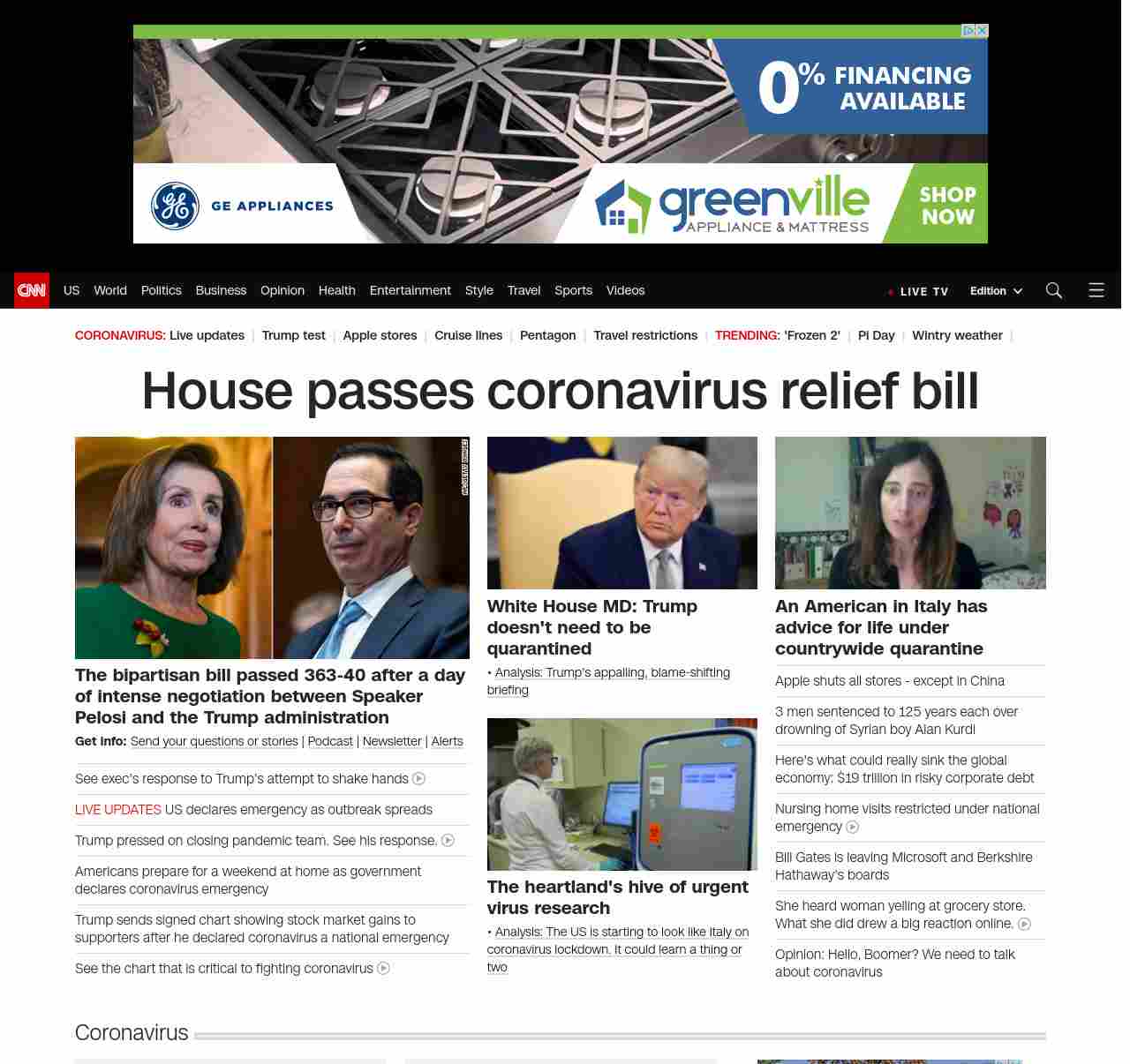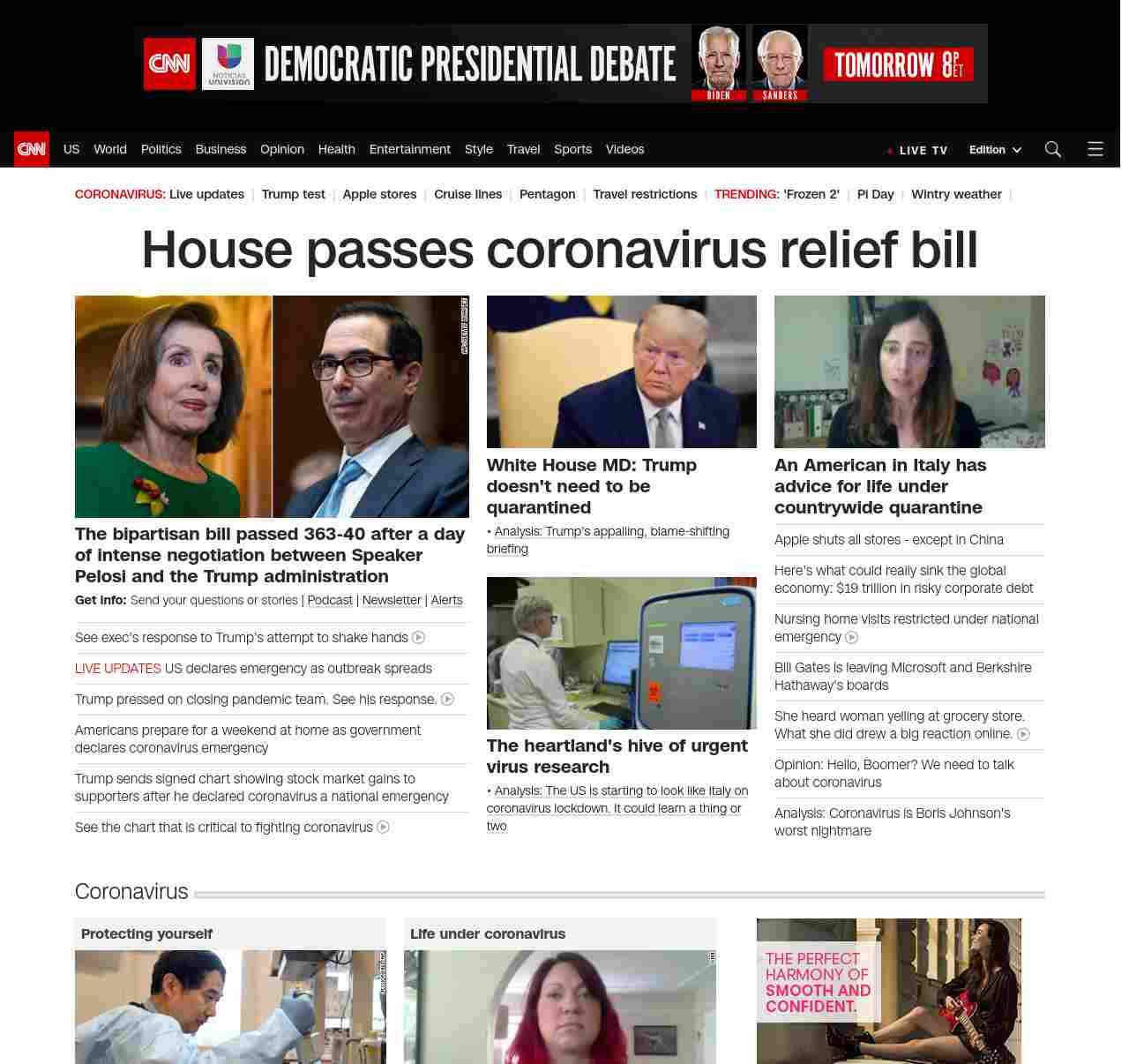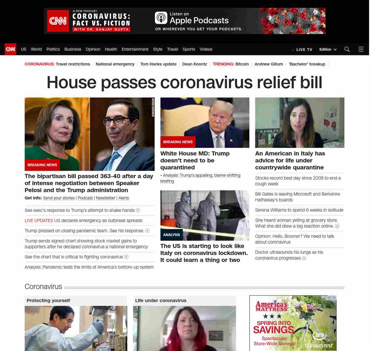 || banner-text–maximized banner-text-size–char-38″> House passes coronavirus relief bill ||” , title: “CNN – Breaking News, Latest News and Videos” , siblings: {“articleList”:[{“uri”:”/2020/03/13/politics/coronavirus-relief-congress/index.html”,”headline”:”u003cstrong>The bipartisan bill passed 363-40 after a day of intense negotiation between Speaker Pelosi and the Trump administrationu003c/strong>”,”thumbnail”:”//cdn.cnn.com/cnnnext/dam/assets/190715084321-nancy-pelosi-steven-mnuchin-split-small-11.jpg”,”duration”:””,”description”:”u003cstrong>Get info: u003c/strong>u003ca href=”https://www.cnn.com/2020/03/11/us/coronavirus-testing-stories-invs/index.html” target=”_blank”>Send your storiesu003c/a> | u003ca href=”https://www.cnn.com/audio/podcasts/corona-virus” target=”_blank”>Podcastu003c/a> | u003ca href=”https://www.cnn.com/specials/coronavirus-newsletter?utm_source=hp&source=hp” target=”_blank”>Newsletteru003c/a> | u003ca href=”https://www.cnn.com/specials/mobile-apps” target=”_blank”>Alertsu003c/a>”,”layout”:””
