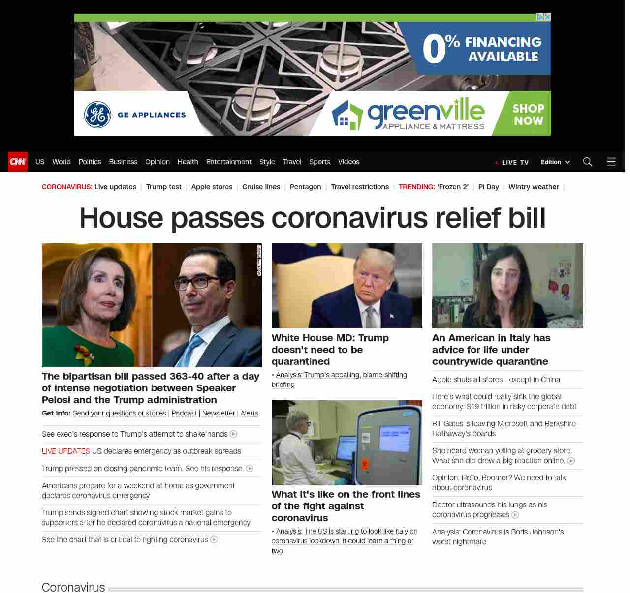 || banner-text–maximized banner-text-size–char-38″> House passes coronavirus relief bill ||” , title: “CNN – Breaking News, Latest News and Videos” , siblings: {“articleList”:[{“uri”:”/2020/03/13/politics/coronavirus-relief-congress/index.html”,”headline”:”u003cstrong>The bipartisan bill passed 363-40 after a day of intense negotiation between Speaker Pelosi and the Trump administrationu003c/strong>”,”thumbnail”:”//cdn.cnn.com/cnnnext/dam/assets/190715084321-nancy-pelosi-steven-mnuchin-split-small-11.jpg”,”duration”:””,”description”:”u003cstrong>Get info: u003c/strong>u003ca href=”https://www.cnn.com/2020/03/04/us/coronavirus-town-hall-questions/index.html” target=”_blank”>Send your questions or storiesu003c/a> | u003ca href=”https://www.cnn.com/audio/podcasts/corona-virus” target=”_blank”>Podcastu003c/a> | u003ca href=”https://www.cnn.com/specials/coronavirus-newsletter?utm_source=hp&source=hp” target=”_blank”>Newsletteru003c/a> | u003ca href=”https://www.cnn.com/specials/mobile-apps” target=”_blank”>Alertsu003c/a>”,”layout”:””