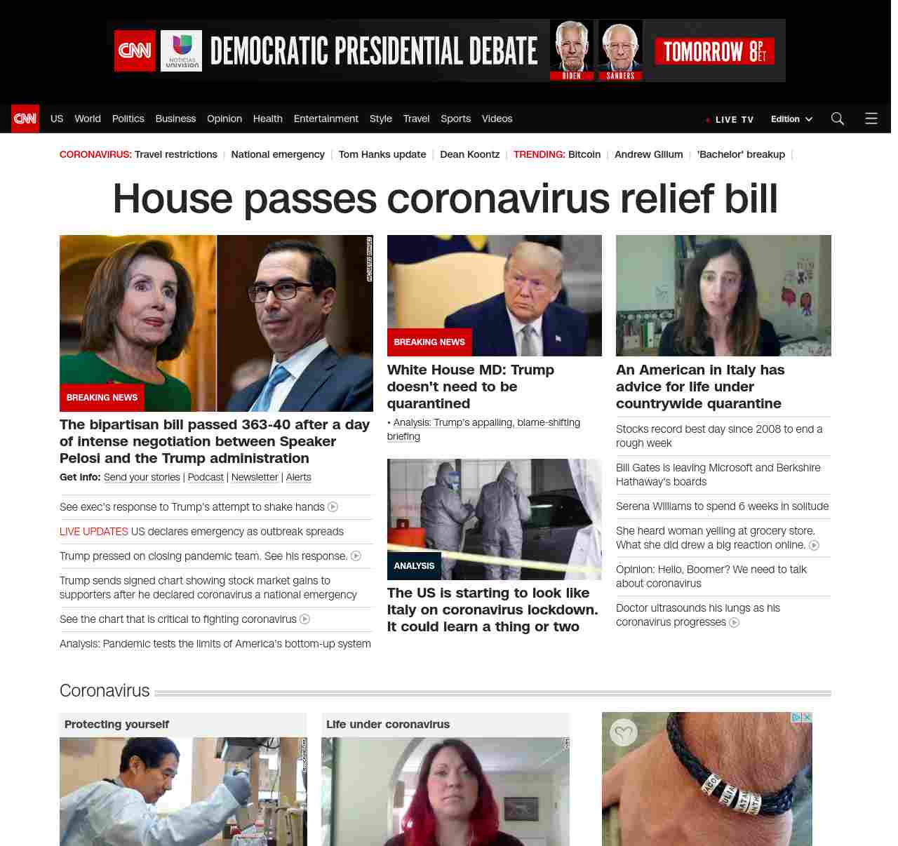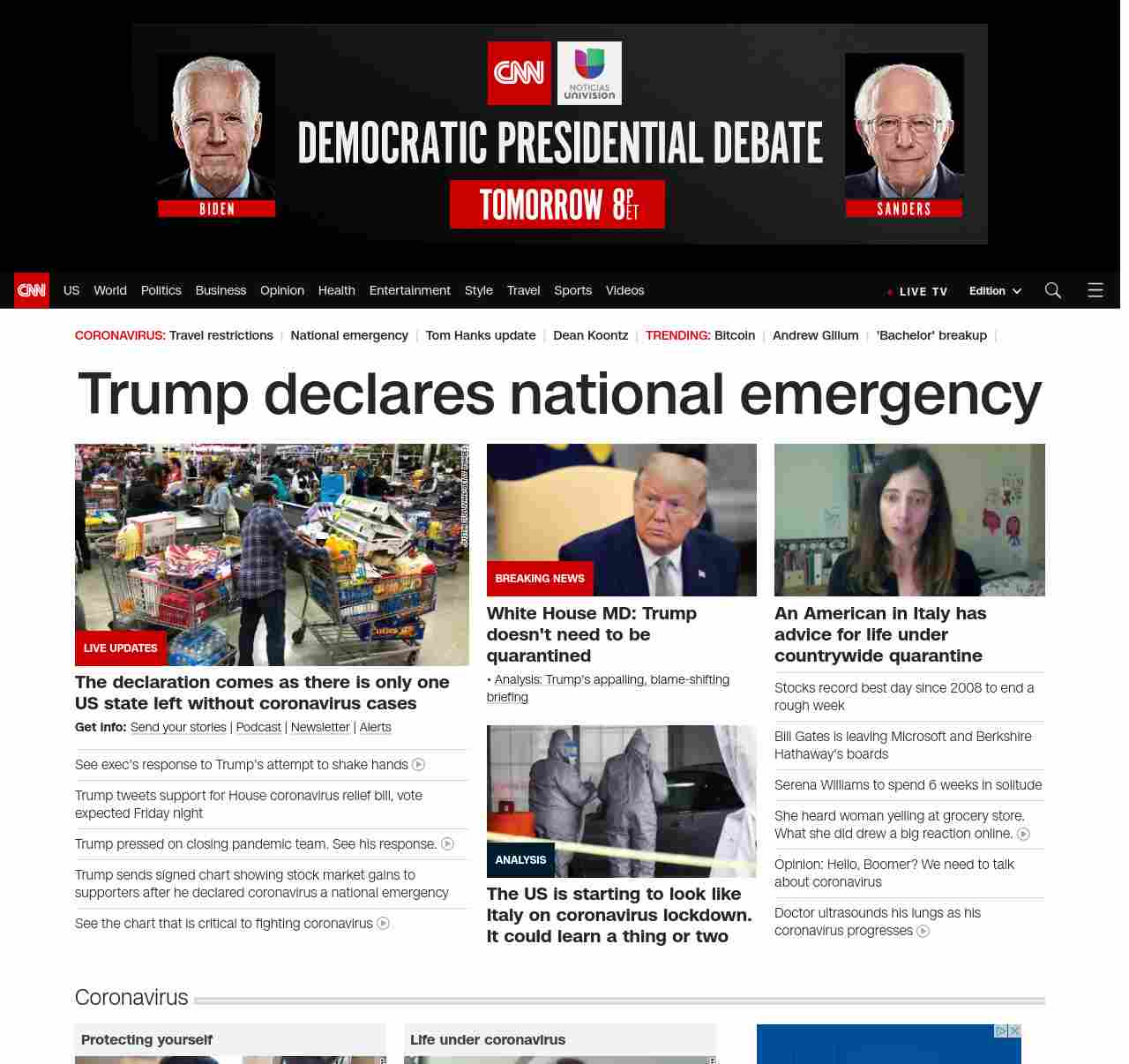 || banner-text–maximized banner-text-size–char-35″> Trump declares national emergency ||” , title: “CNN – Breaking News, Latest News and Videos” , siblings: {“articleList”:[{“uri”:”/2020/03/13/politics/coronavirus-relief-congress/index.html”,”headline”:”u003cstrong>The House passes a bipartisan coronavirus relief bill after Trump announces his supportu003c/strong>”,”thumbnail”:”//cdn.cnn.com/cnnnext/dam/assets/190715084321-nancy-pelosi-steven-mnuchin-split-small-11.jpg”,”duration”:””,”description”:”u003cstrong>Get info: u003c/strong>u003ca href=”https://www.cnn.com/2020/03/11/us/coronavirus-testing-stories-invs/index.html” target=”_blank”>Send your storiesu003c/a> | u003ca href=”https://www.cnn.com/audio/podcasts/corona-virus” target=”_blank”>Podcastu003c/a> | u003ca href=”https://www.cnn.com/specials/coronavirus-newsletter?utm_source=hp&source=hp” target=”_blank”>Newsletteru003c/a> | u003ca href=”https://www.cnn.com/specials/mobile-apps” target=”_blank”>Alertsu003c/a>”,”layout”:””