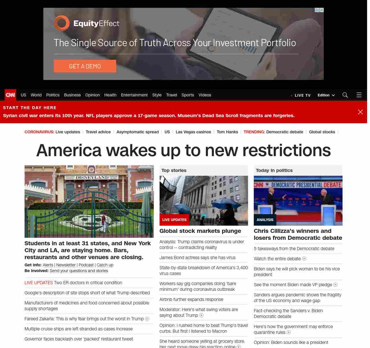 || banner-text–maximized banner-text-size–char-38″> America wakes up to new restrictions ||” , title: “CNN – Breaking News, Latest News and Videos” , siblings: {“articleList”:[{“uri”:”/2020/03/16/health/us-coronavirus-monday-updates/index.html”,”headline”:”u003cstrong>Students in at least 31 states, and New York City and LA, are staying home. Bars, restaurants and other venues are closing.u003c/strong>”,”thumbnail”:”//cdn.cnn.com/cnnnext/dam/assets/200316023052-03-coronavirus-us-closures-small-11.jpg”,”duration”:””,”description”:”u003cstrong>Get info: u003c/strong>u003ca href=”https://www.cnn.com/specials/mobile-apps” target=”_blank”>Alertsu003c/a> | u003ca href=”https://www.cnn.com/specials/coronavirus-newsletter?utm_source=hp&source=hp” target=”_blank”>Newsletteru003c/a> | u003ca href=”https://www.cnn.com/audio/podcasts/corona-virus” target=”_blank”>Podcastu003c/a> | u003ca href=”https://www.cnn.com/2020/03/16/world/newsletter-coronavirus-03-16-20-intl/index.html” target=”_blank”>Catch upu003c/a>u003cbr />u003cstrong>Be involved: u003c/strong>u003ca href=”https://www.cnn.com/2020/03/04/us/coronavirus-town-hall-questions/index.html” target=”_blank”>Send your questions and storiesu003c/a>”,”layout”:””
