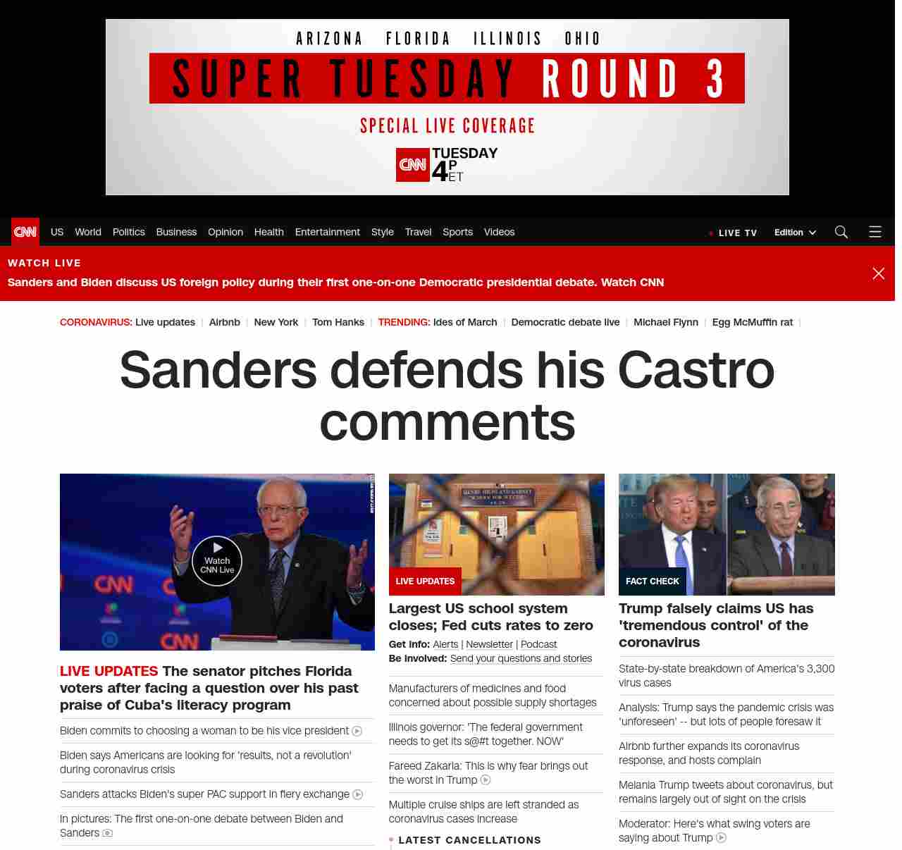 || banner-text–natural”> Sanders defends his Castro comments ||” , title: “CNN – Breaking News, Latest News and Videos” , siblings: {“articleList”:[{“uri”:”/politics/live-news/2020-democratic-debate-live-updates/index.html”,”headline”:”u003cstrong>The senator pitches Florida voters after facing a question over his past praise of Cuba’s literacy programu003c/strong> “,”thumbnail”:”//cdn.cnn.com/cnnnext/dam/assets/200315203848-24-cnn-debate-0315-small-11.jpg”,”duration”:””,”description”:””,”layout”:””
