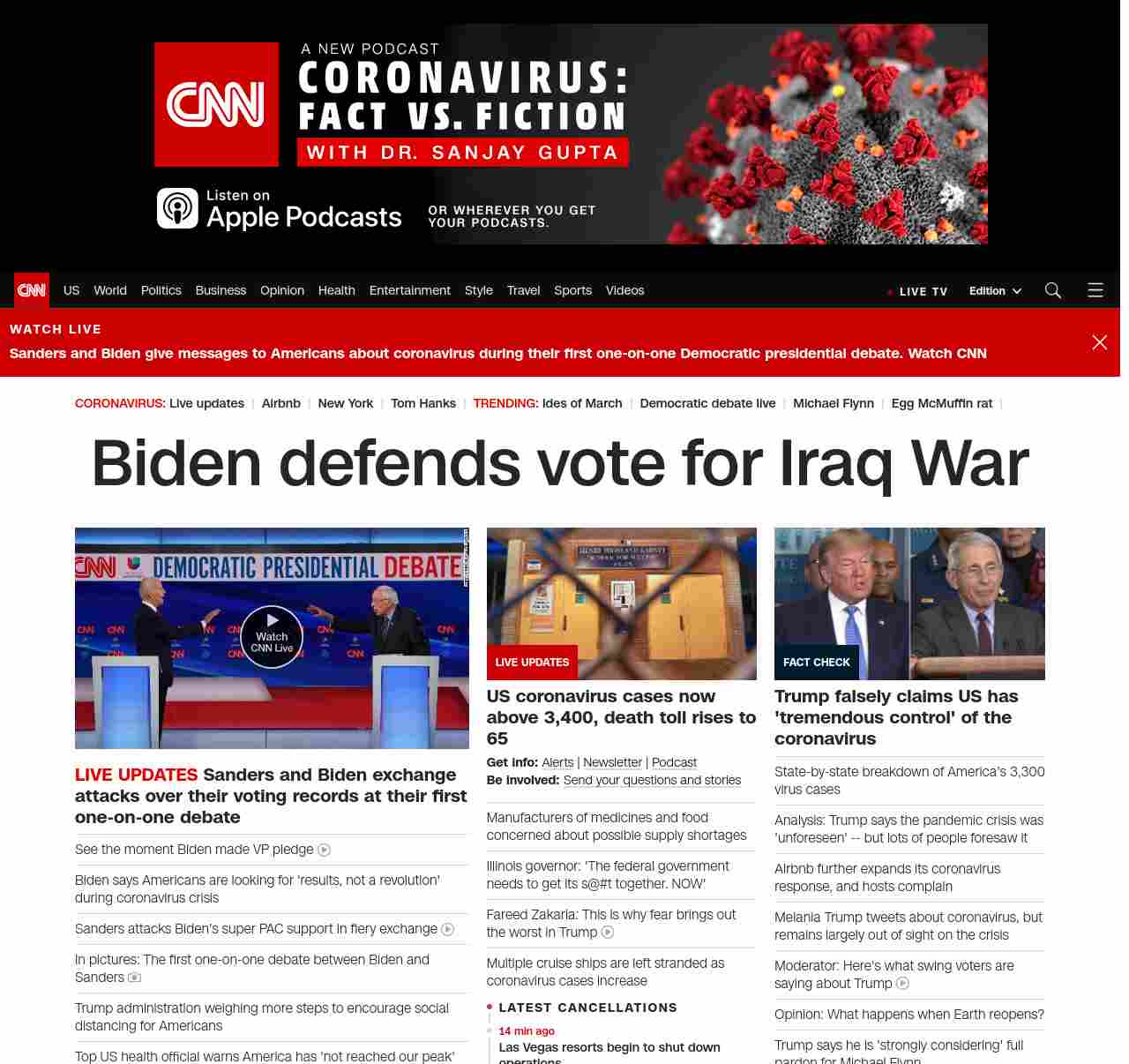 || banner-text–natural”> Biden defends vote for Iraq War ||” , title: “CNN – Breaking News, Latest News and Videos” , siblings: {“articleList”:[{“uri”:”/politics/live-news/2020-democratic-debate-live-updates/index.html”,”headline”:”u003cstrong>As America reels from a pandemic, the first one-on-one debate between Biden and Sanders was heated and divisive u003c/strong>”,”thumbnail”:”//cdn.cnn.com/cnnnext/dam/assets/200315210949-33-cnn-debate-0315-small-11.jpg”,”duration”:””,”description”:””,”layout”:””