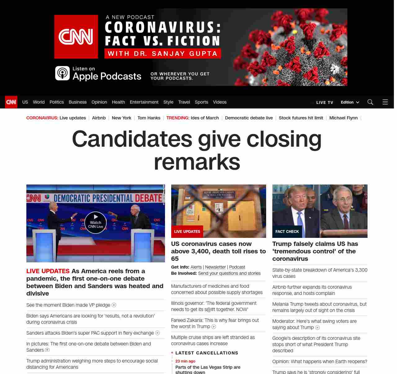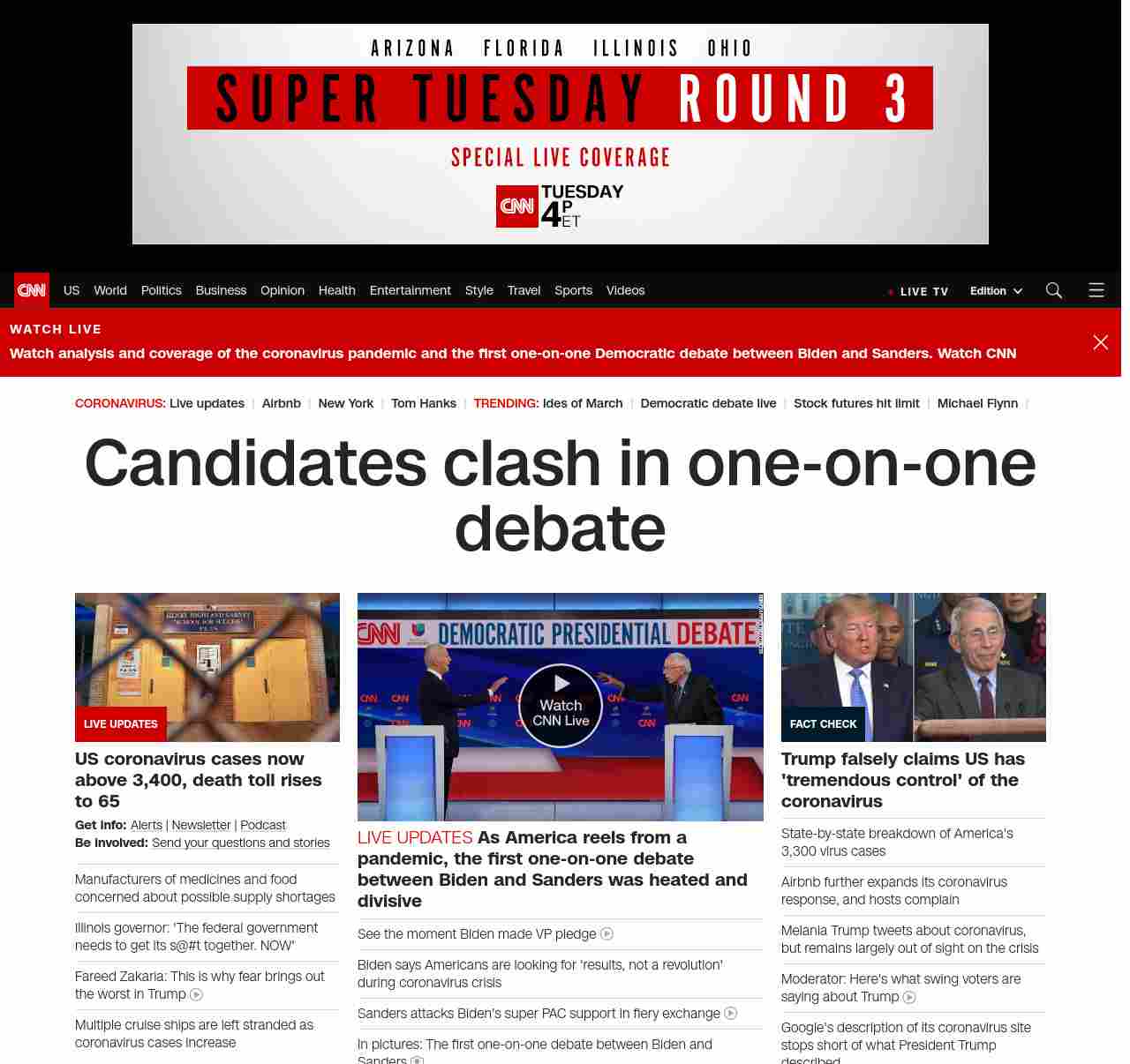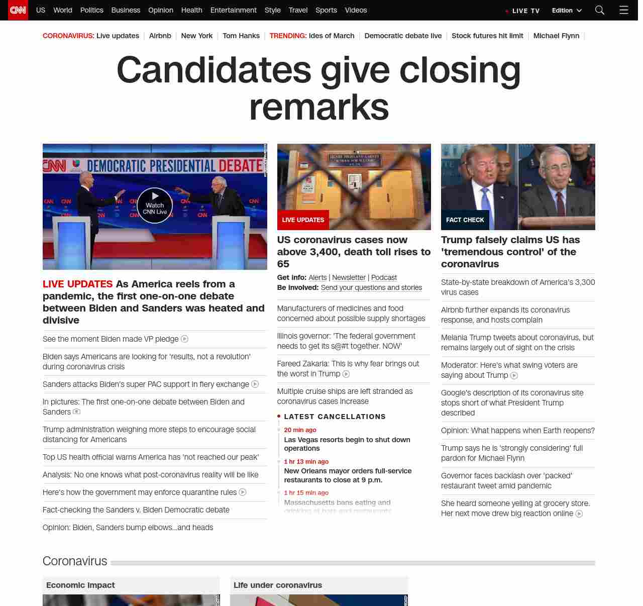 || banner-text–natural”> Candidates give closing remarks ||” , title: “CNN – Breaking News, Latest News and Videos” , siblings: {“articleList”:[{“uri”:”/2020/03/15/politics/supply-chain-shortages-coronavirus-pandemic/index.html”,”headline”:”Manufacturers of medicines and food concerned about possible supply shortages”,”thumbnail”:”//cdn.cnn.com/cnnnext/dam/assets/200314102508-01-coronavirus-virginia-0313-small-11.jpg”,”duration”:””,”description”:”u003cstrong>Get info: u003c/strong>u003ca href=”https://www.cnn.com/specials/mobile-apps” target=”_blank”>Alertsu003c/a> | u003ca href=”https://www.cnn.com/specials/coronavirus-newsletter?utm_source=hp&source=hp” target=”_blank”>Newsletteru003c/a> | u003ca href=”https://www.cnn.com/audio/podcasts/corona-virus” target=”_blank”>Podcastu003c/a> u003cbr />u003cstrong>Be involved: u003c/strong>u003ca href=”https://www.cnn.com/2020/03/04/us/coronavirus-town-hall-questions/index.html” target=”_blank”>Send your questions and storiesu003c/a>”,”layout”:””