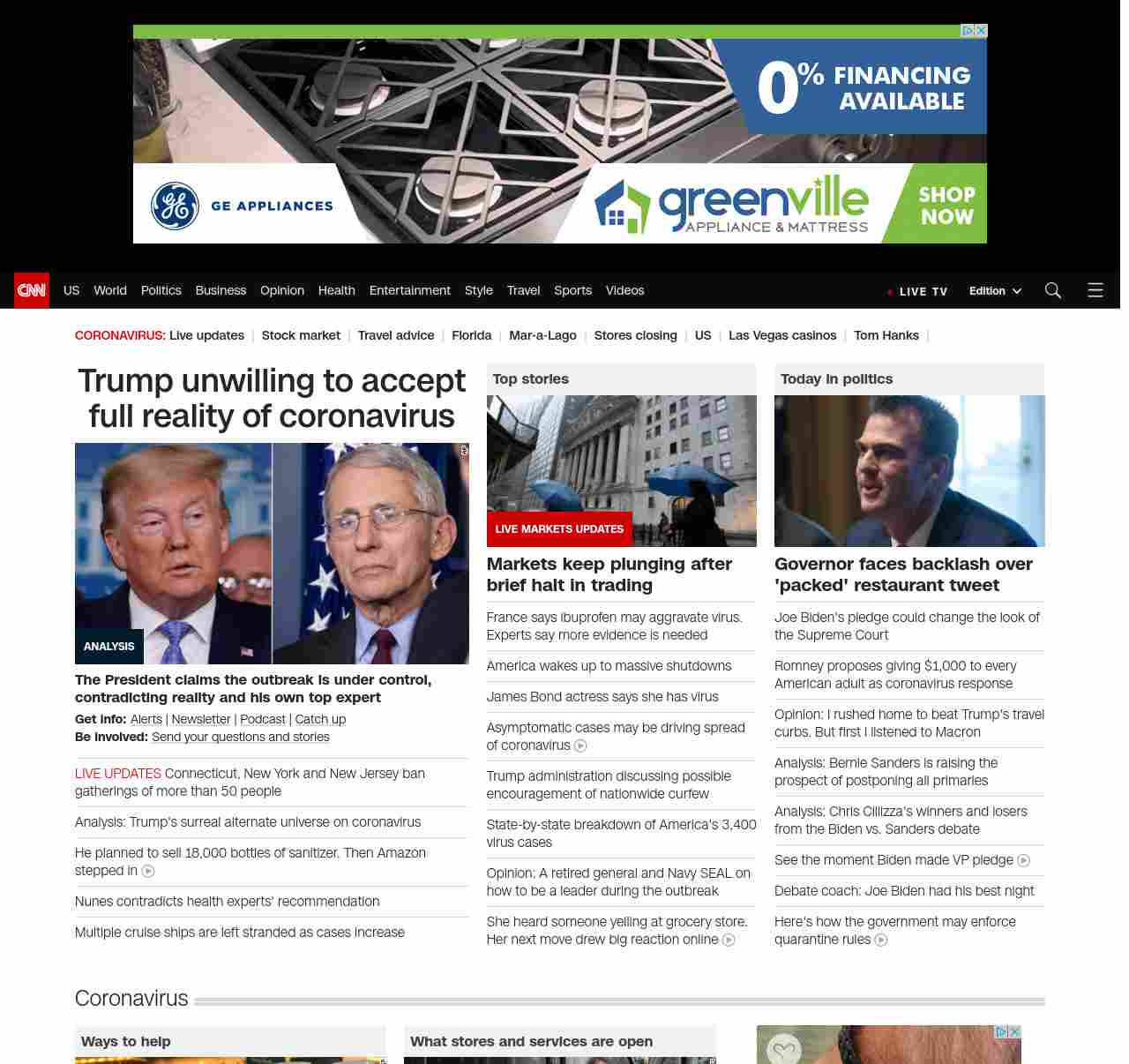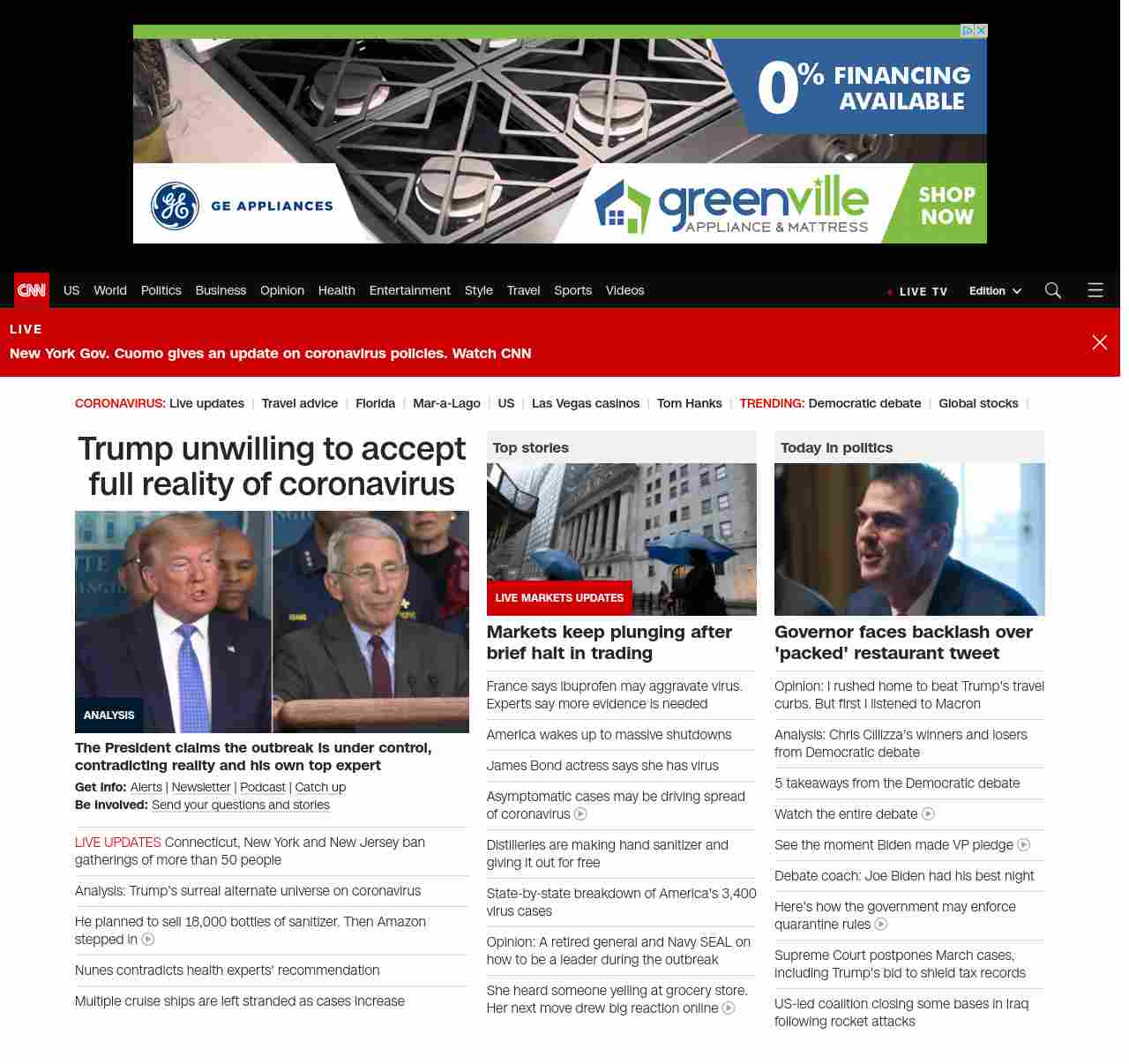 || screaming-banner-text banner-text-size–char-47″ data-analytics=”_list-hierarchical-xs_article_”> Trump unwilling to accept full reality of coronavirus ||” , title: “CNN – Breaking News, Latest News and Videos” , siblings: {“articleList”:[{“uri”:”/2020/03/16/politics/coronavirus-us-president-donald-trump-fauci-politics/index.html”,”headline”:”u003cstrong>The President claims the outbreak is under control, contradicting reality and his own top expertu003c/strong>”,”thumbnail”:”//cdn.cnn.com/cnnnext/dam/assets/200316122053-trump-anthony-fauci-split-small-11.jpg”,”duration”:””,”description”:”u003cstrong>Get info: u003c/strong>u003ca href=”https://www.cnn.com/specials/mobile-apps” target=”_blank”>Alertsu003c/a> | u003ca href=”https://www.cnn.com/specials/coronavirus-newsletter?utm_source=hp&source=hp” target=”_blank”>Newsletteru003c/a> | u003ca href=”https://www.cnn.com/audio/podcasts/corona-virus” target=”_blank”>Podcastu003c/a> | u003ca href=”https://www.cnn.com/2020/03/16/world/newsletter-coronavirus-03-16-20-intl/index.html” target=”_blank”>Catch upu003c/a>u003cbr />u003cstrong>Be involved: u003c/strong>u003ca href=”https://www.cnn.com/2020/03/11/us/coronavirus-testing-stories-invs/index.html” target=”_blank”>Send your questions and storiesu003c/a>”,”layout”:””