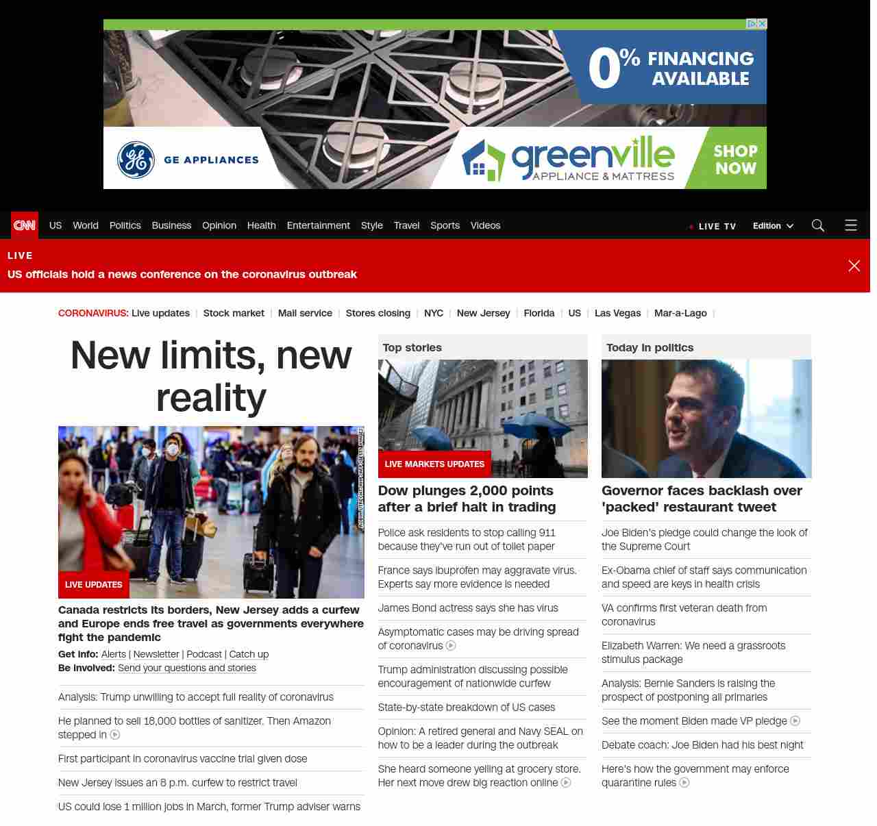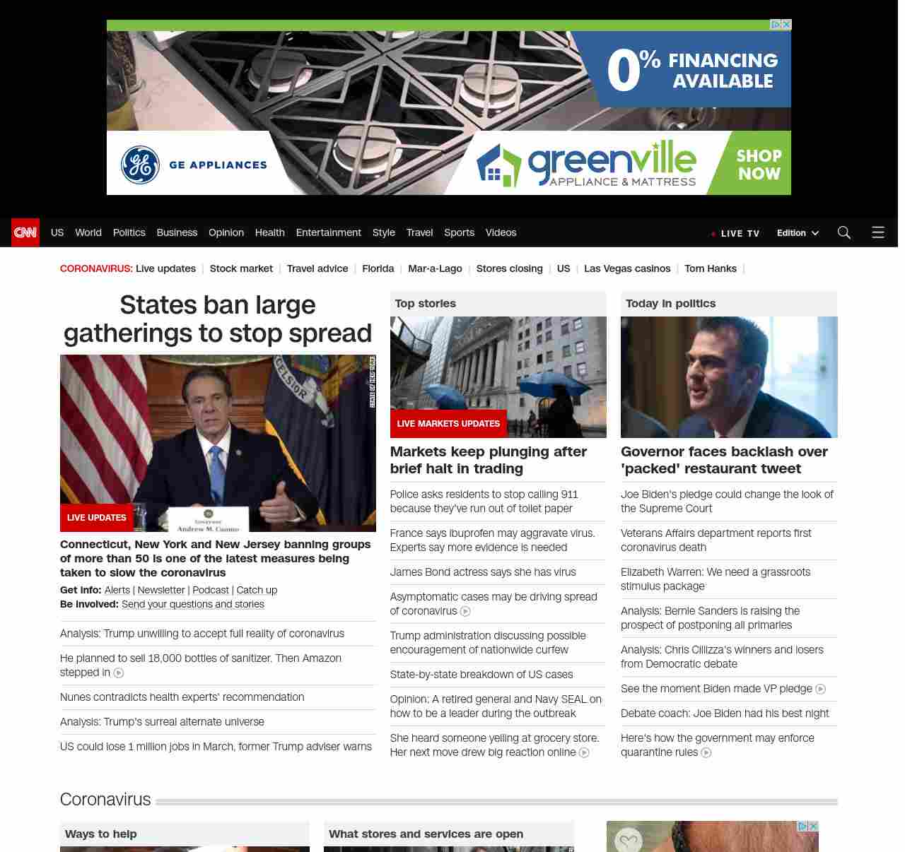 || screaming-banner-text banner-text-size–char-44″ data-analytics=”_list-hierarchical-xs_hyperlink_”> States ban large gatherings to stop spread ||” , title: “CNN – Breaking News, Latest News and Videos” , siblings: {“articleList”:[{“uri”:”/2020/03/16/politics/coronavirus-us-president-donald-trump-fauci-politics/index.html”,”headline”:”Analysis: Trump unwilling to accept full reality of coronavirus”,”thumbnail”:”//cdn.cnn.com/cnnnext/dam/assets/200316122053-trump-anthony-fauci-split-small-11.jpg”,”duration”:””,”description”:”u003cstrong>Get info: u003c/strong>u003ca href=”https://www.cnn.com/specials/mobile-apps” target=”_blank”>Alertsu003c/a> | u003ca href=”https://www.cnn.com/specials/coronavirus-newsletter?utm_source=hp&source=hp” target=”_blank”>Newsletteru003c/a> | u003ca href=”https://www.cnn.com/audio/podcasts/corona-virus” target=”_blank”>Podcastu003c/a> | u003ca href=”https://www.cnn.com/2020/03/16/world/newsletter-coronavirus-03-16-20-intl/index.html” target=”_blank”>Catch upu003c/a>u003cbr />u003cstrong>Be involved: u003c/strong>u003ca href=”https://www.cnn.com/2020/03/11/us/coronavirus-testing-stories-invs/index.html” target=”_blank”>Send your questions and storiesu003c/a>”,”layout”:””