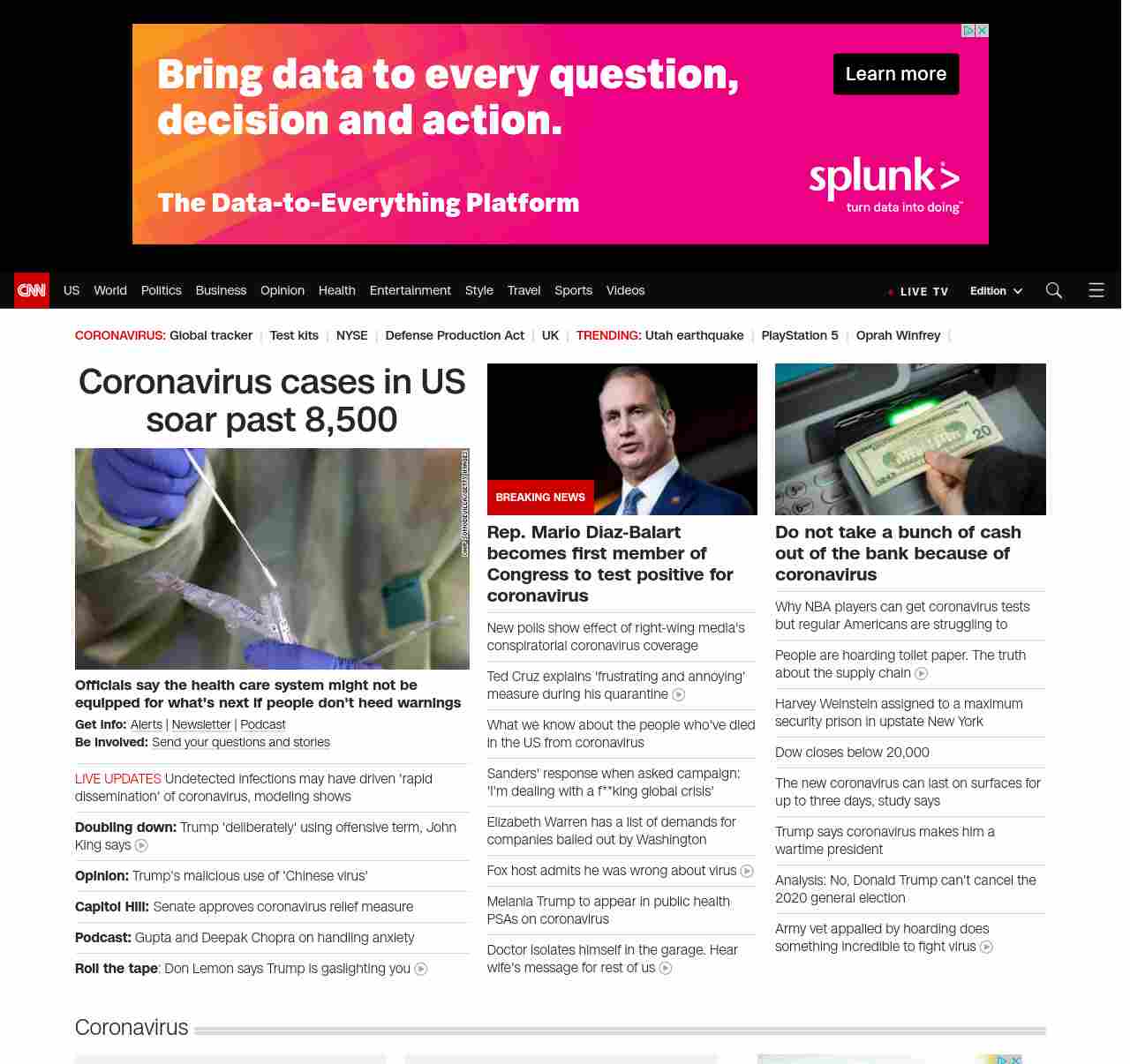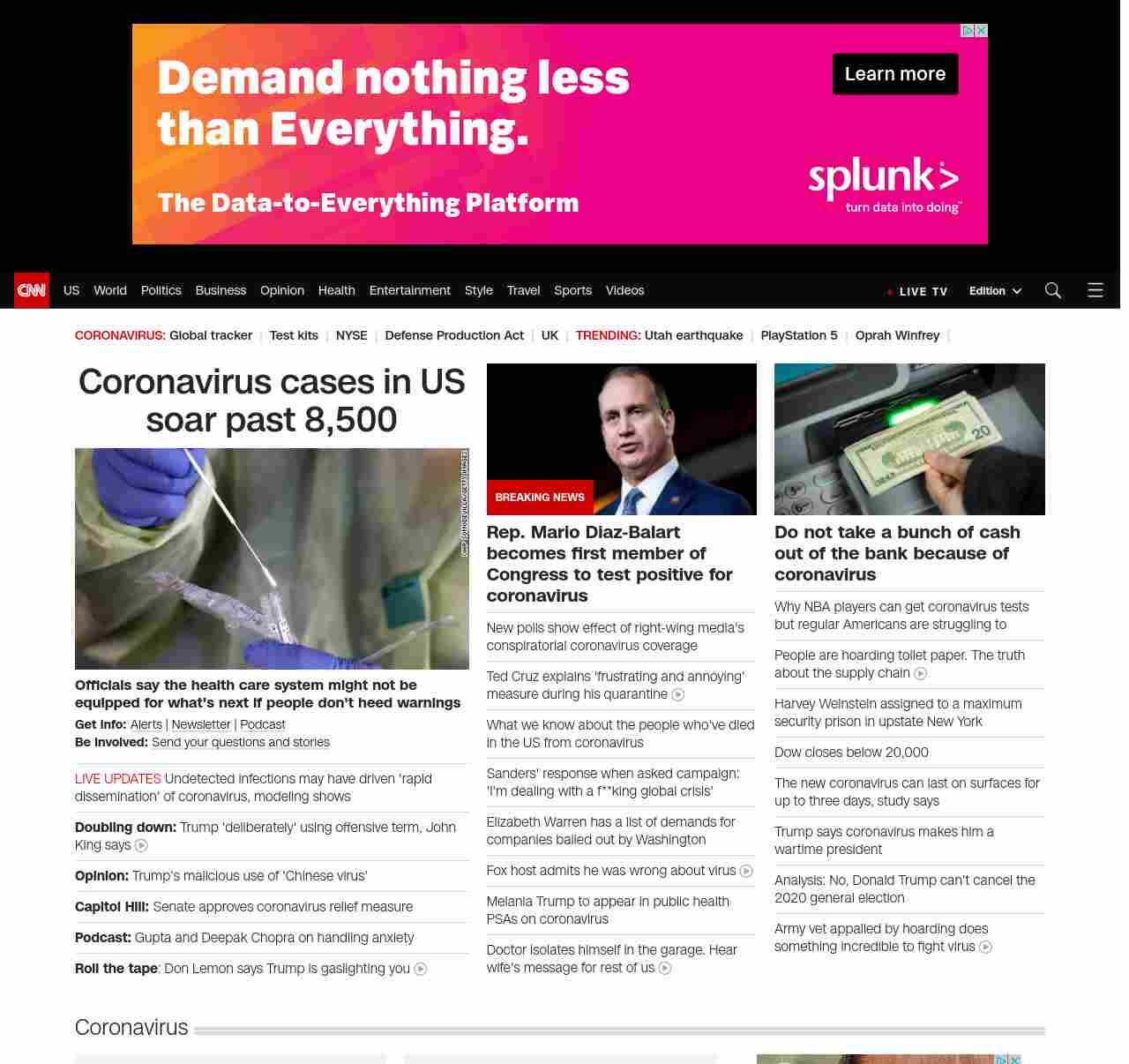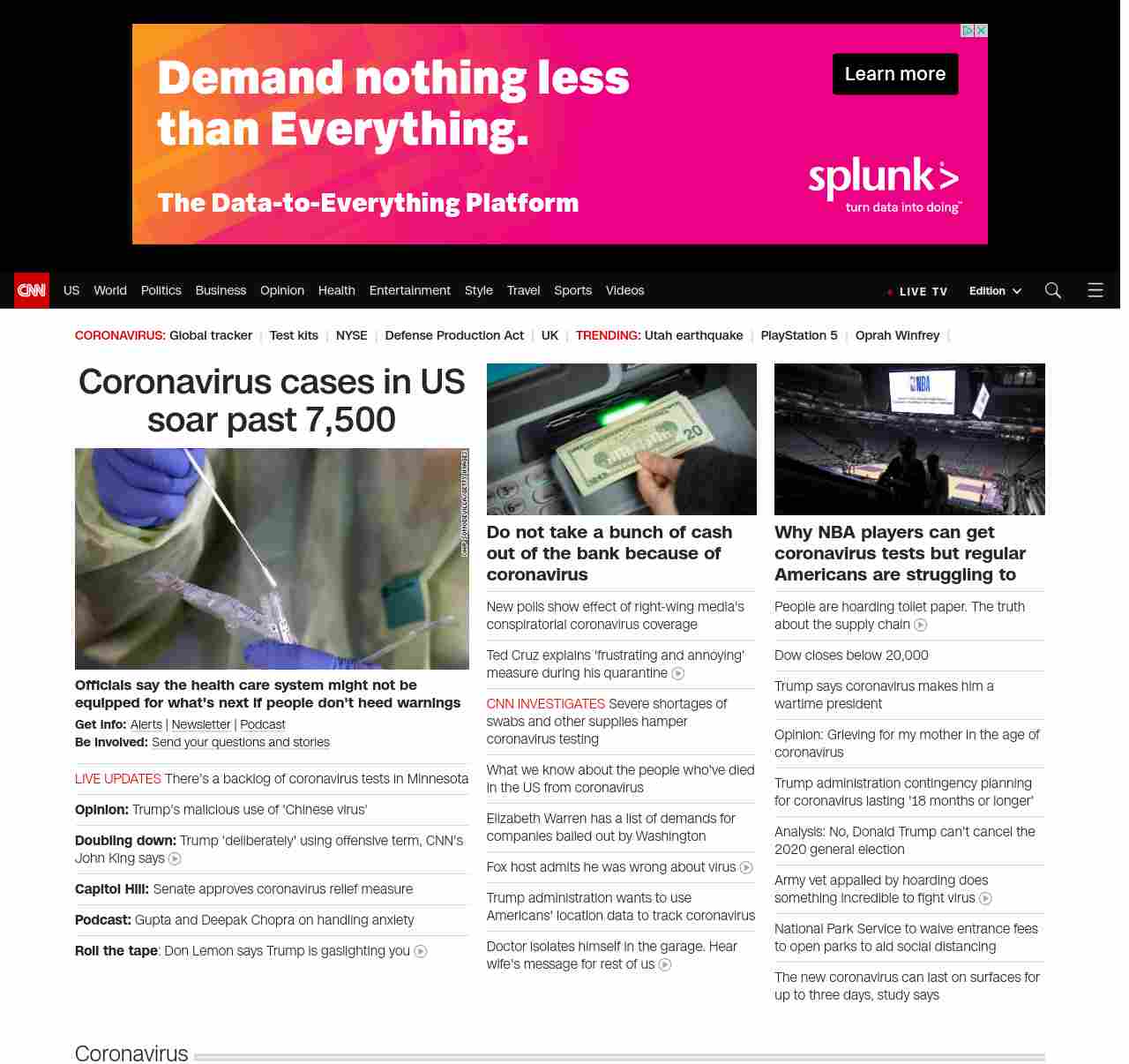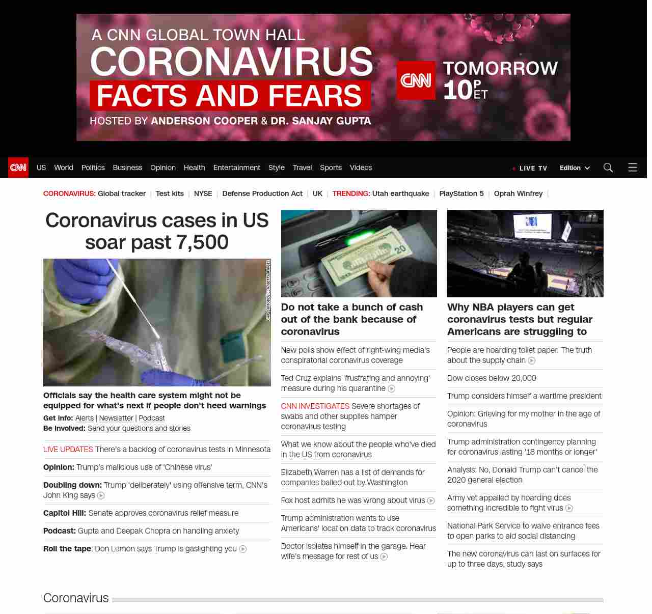 || screaming-banner-text banner-text-size–char-41″ data-analytics=”_list-hierarchical-xs_article_”> Coronavirus cases in US soar past 7,500 ||” , title: “CNN – Breaking News, Latest News and Videos” , siblings: {“articleList”:[{“uri”:”/2020/03/18/health/us-coronavirus-case-updates-wednesday/index.html”,”headline”:”u003cstrong>Officials say the health care system might not be equipped for what’s next if people don’t heed warningsu003c/strong>”,”thumbnail”:”//cdn.cnn.com/cnnnext/dam/assets/200318021832-coronavirus-testing-united-states-0316-small-11.jpg”,”duration”:””,”description”:”u003cstrong>Get info: u003c/strong>u003ca href=”https://www.cnn.com/specials/mobile-apps” target=”_blank”>Alertsu003c/a> | u003ca href=”https://www.cnn.com/specials/coronavirus-newsletter?utm_source=hp&source=hp” target=”_blank”>Newsletteru003c/a> | u003ca href=”https://www.cnn.com/audio/podcasts/corona-virus”>Podcastu003c/a> u003cbr />u003cstrong>Be involved: u003c/strong>u003ca href=”https://www.cnn.com/2020/03/11/us/coronavirus-testing-stories-invs/index.html” target=”_blank”>Send your questions and storiesu003c/a>”,”layout”:””