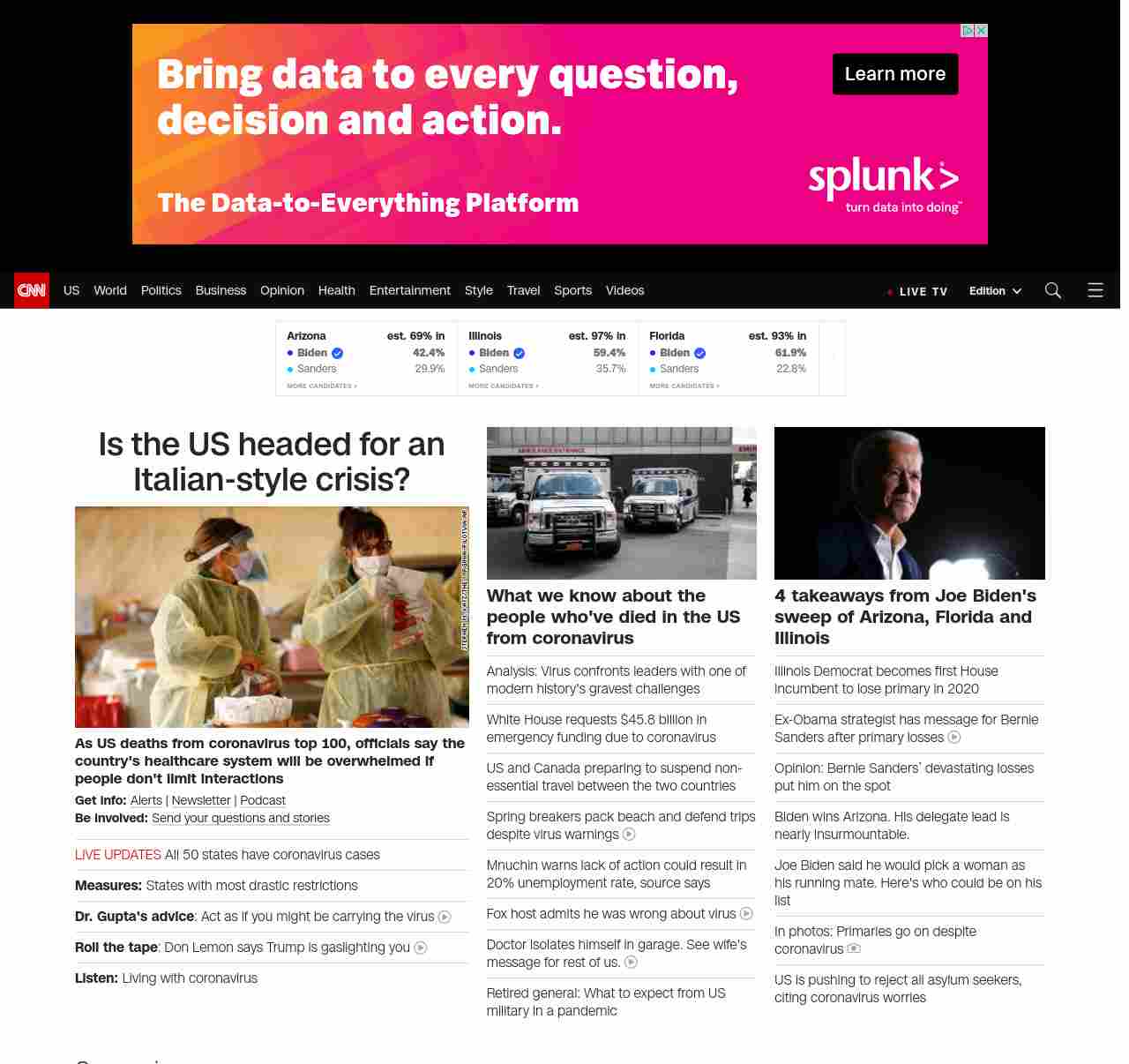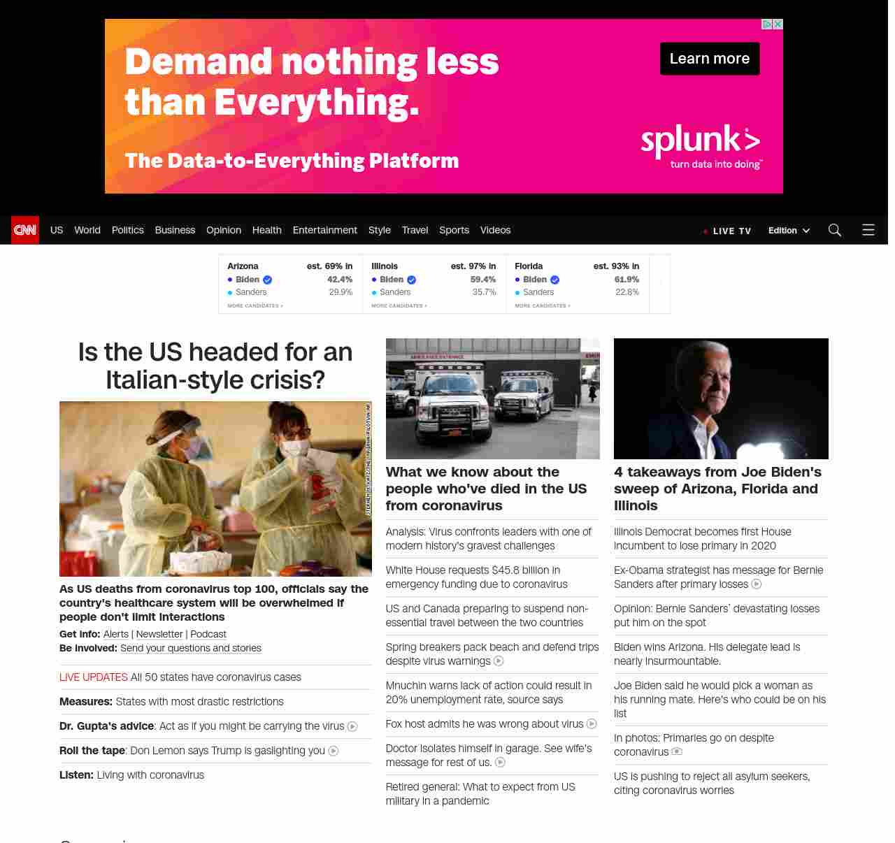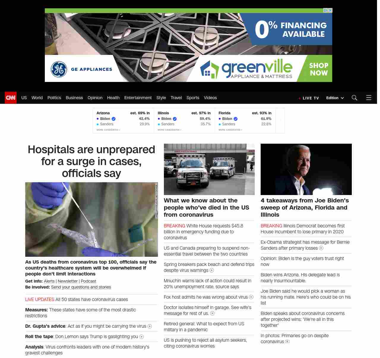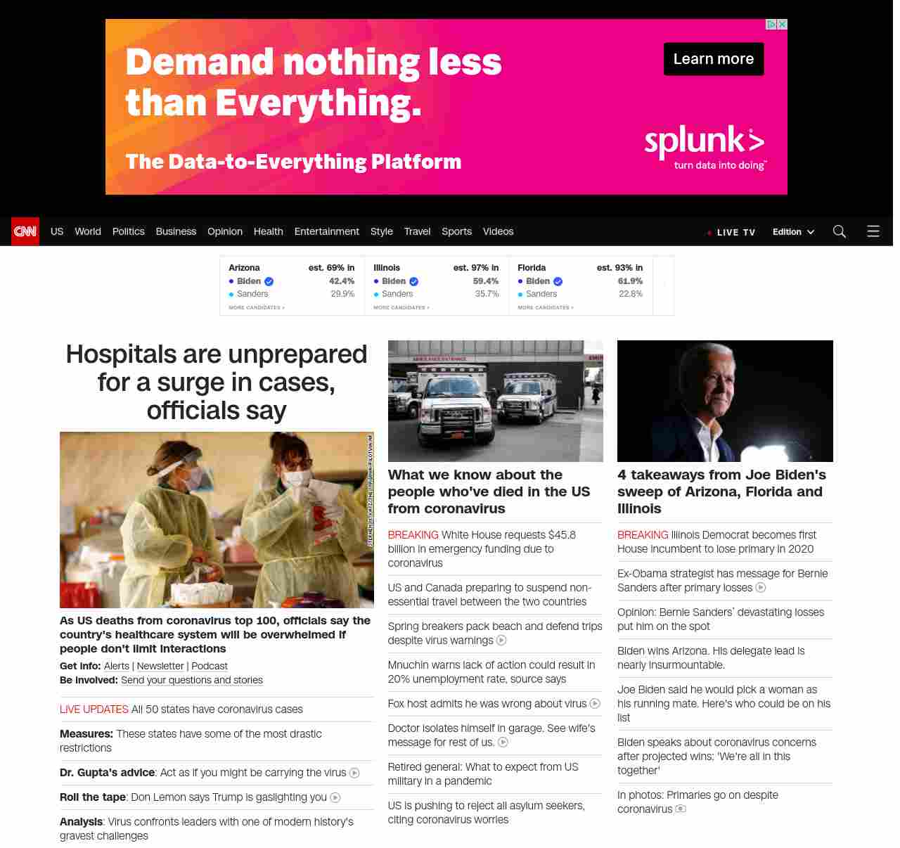 || screaming-banner-text banner-text-size–char-47″ data-analytics=”_list-hierarchical-xs_article_”> Hospitals are unprepared for a surge in cases, officials say ||” , title: “CNN – Breaking News, Latest News and Videos” , siblings: {“articleList”:[{“uri”:”/2020/03/18/health/us-coronavirus-case-updates-wednesday/index.html”,”headline”:”u003cstrong>As US deaths from coronavirus top 100, officials say the country’s healthcare system will be overwhelmed if people don’t limit interactionsu003c/strong>”,”thumbnail”:”//cdn.cnn.com/cnnnext/dam/assets/200318030645-01-coronavirus-virginia-0316-small-11.jpg”,”duration”:””,”description”:”u003cstrong>Get info: u003c/strong>u003ca href=”https://www.cnn.com/specials/mobile-apps” target=”_blank”>Alertsu003c/a> | u003ca href=”https://www.cnn.com/specials/coronavirus-newsletter?utm_source=hp&source=hp” target=”_blank”>Newsletteru003c/a> | u003ca href=”https://www.cnn.com/audio/podcasts/corona-virus”>Podcastu003c/a> u003cbr />u003cstrong>Be involved: u003c/strong>u003ca href=”https://www.cnn.com/2020/03/11/us/coronavirus-testing-stories-invs/index.html” target=”_blank”>Send your questions and storiesu003c/a>”,”layout”:””