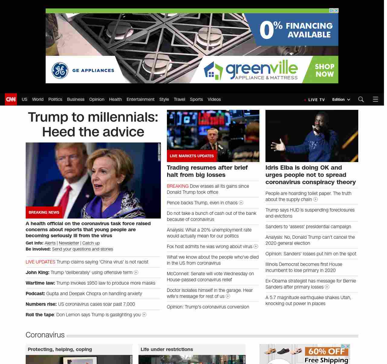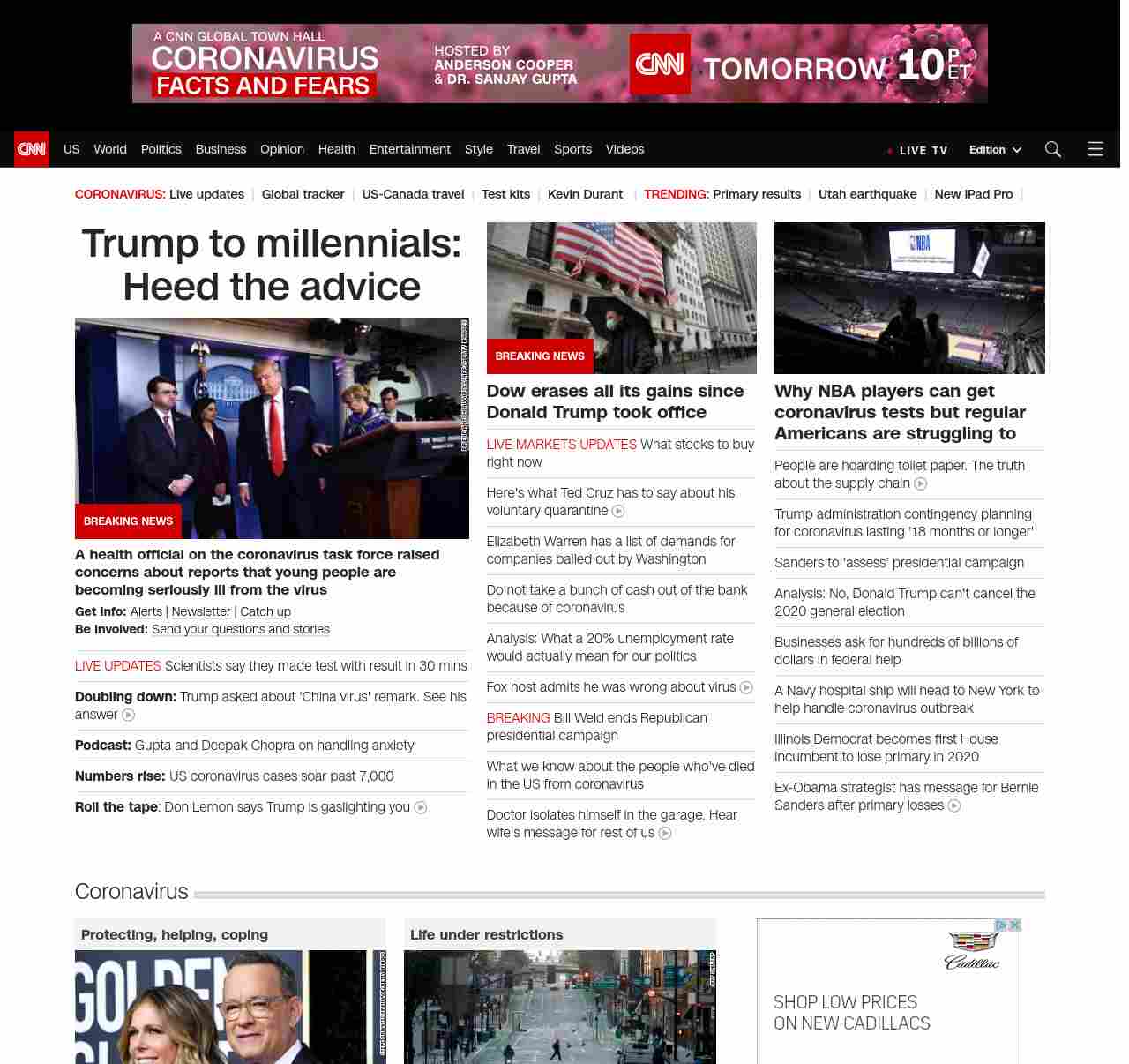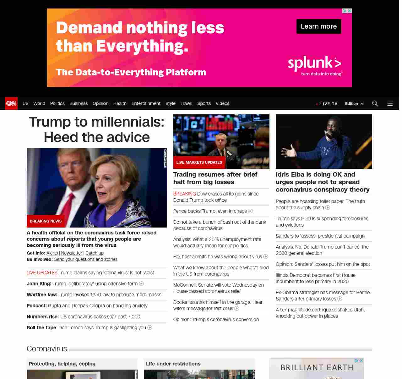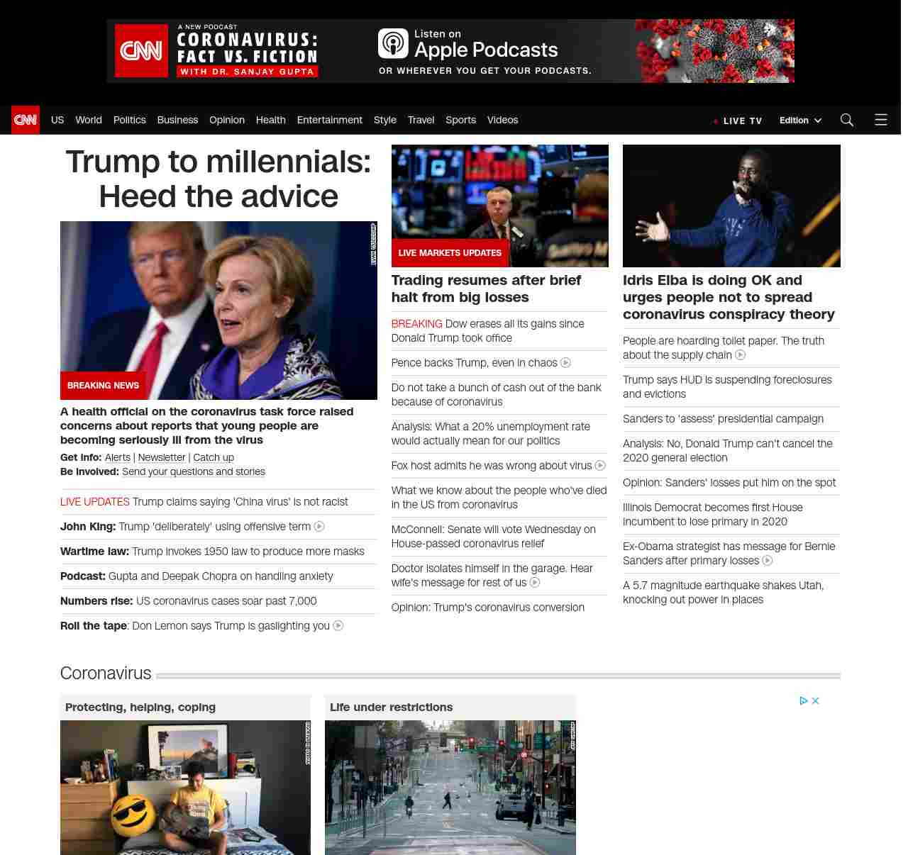 || screaming-banner-text banner-text-size–char-38″ data-analytics=”_list-hierarchical-xs_article_”> Trump to millennials: Heed the advice ||” , title: “CNN – Breaking News, Latest News and Videos” , siblings: {“articleList”:[{“uri”:”/2020/03/18/politics/young-people-coronavirus-caution-white-house/index.html”,”headline”:”u003cstrong>A health official on the coronavirus task force raised concerns about reports that young people are becoming seriously ill from the virusu003c/strong>”,”thumbnail”:”//cdn.cnn.com/cnnnext/dam/assets/200318134320-birx-0318-small-11.jpg”,”duration”:””,”description”:”u003cstrong>Get info: u003c/strong>u003ca href=”https://www.cnn.com/specials/mobile-apps” target=”_blank”>Alertsu003c/a> | u003ca href=”https://www.cnn.com/specials/coronavirus-newsletter?utm_source=hp&source=hp” target=”_blank”>Newsletteru003c/a> | u003ca href=”https://www.cnn.com/2020/03/18/world/coronavirus-newsletter-03-18-20/index.html” target=”_blank”>Catch upu003c/a>u003cbr />u003cstrong>Be involved: u003c/strong>u003ca href=”https://www.cnn.com/2020/03/11/us/coronavirus-testing-stories-invs/index.html” target=”_blank”>Send your questions and storiesu003c/a>”,”layout”:””