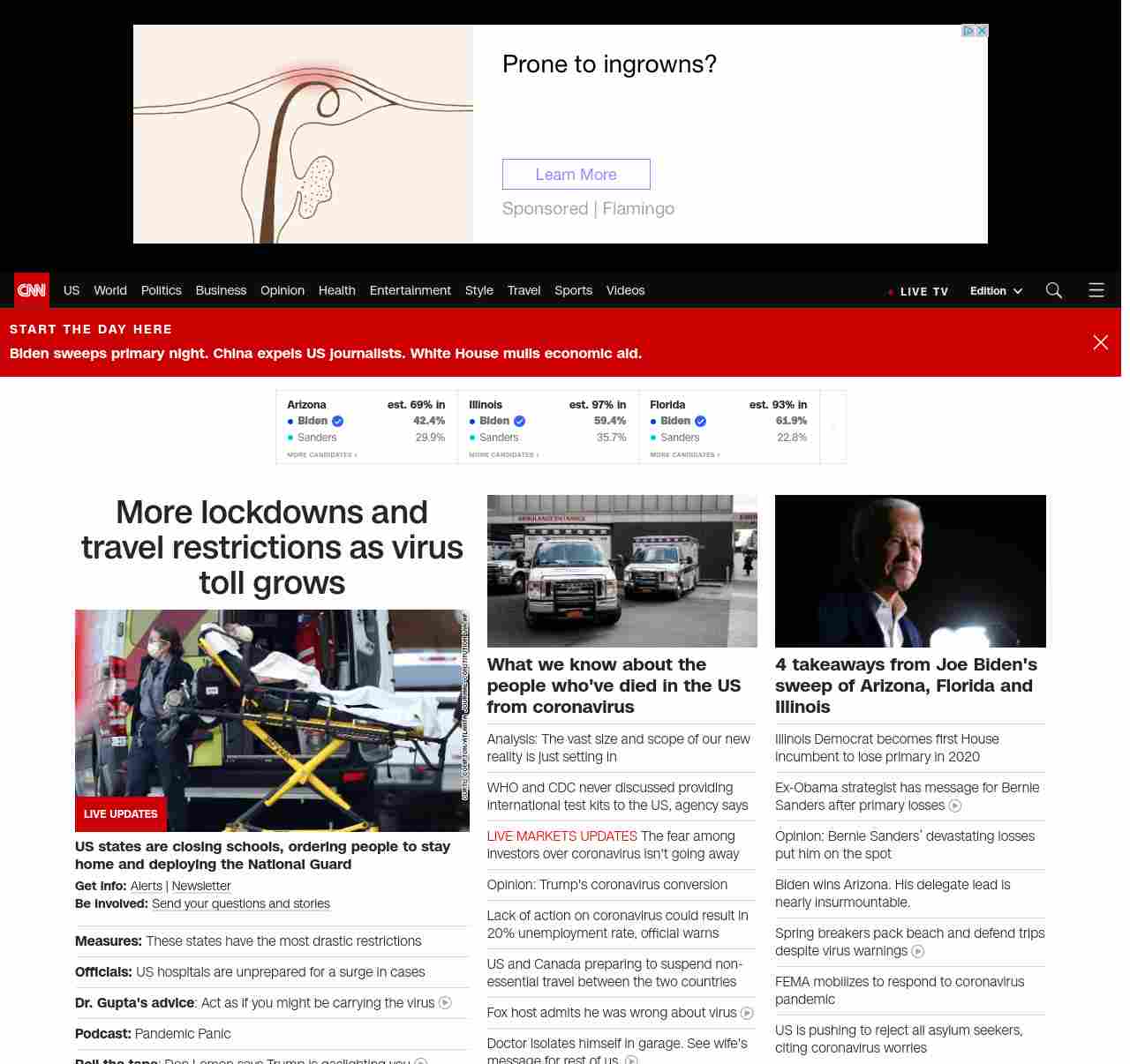 || screaming-banner-text banner-text-size–char-47″ data-analytics=”_list-hierarchical-xs_article_”> More lockdowns and travel restrictions as virus toll grows ||” , title: “CNN – Breaking News, Latest News and Videos” , siblings: {“articleList”:[{“uri”:”/world/live-news/coronavirus-outbreak-03-18-20-intl-hnk/index.html”,”headline”:”u003cstrong>US states are closing schools, ordering people to stay home and deploying the National Guardu003c/strong>”,”thumbnail”:”//cdn.cnn.com/cnnnext/dam/assets/200318030835-01-coronavirus-georgia-0316-small-11.jpg”,”duration”:””,”description”:”u003cstrong>Get info: u003c/strong>u003ca href=”https://www.cnn.com/specials/mobile-apps” target=”_blank”>Alertsu003c/a> | u003ca href=”https://www.cnn.com/specials/coronavirus-newsletter?utm_source=hp&source=hp” target=”_blank”>Newsletteru003c/a> u003cbr />u003cstrong>Be involved: u003c/strong>u003ca href=”https://www.cnn.com/2020/03/11/us/coronavirus-testing-stories-invs/index.html” target=”_blank”>Send your questions and storiesu003c/a>”,”layout”:””