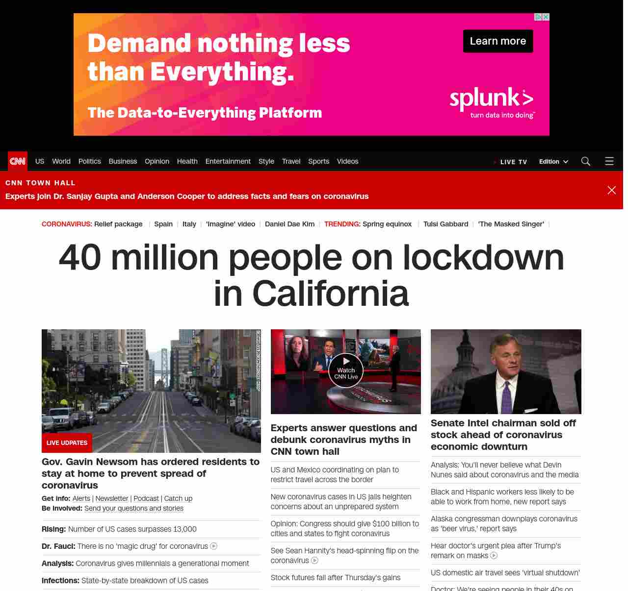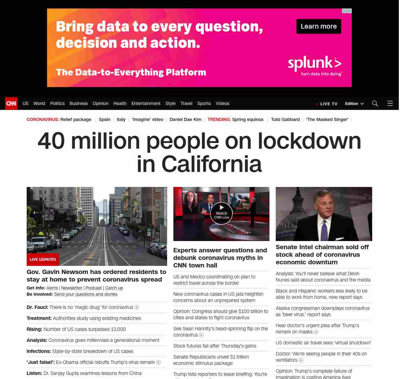 || banner-text–natural”> 40 million people on lockdown in California ||” , title: “CNN – Breaking News, Latest News and Videos” , siblings: {“articleList”:[{“uri”:”/videos/health/2020/03/20/anthony-fauci-coronavirus-no-magic-drug-sot-vpx.cnn”,”headline”:”u003cstrong>Dr. Fauci:u003c/strong> There is no ‘magic drug’ for coronavirus”,”thumbnail”:”//cdn.cnn.com/cnnnext/dam/assets/200319204643-dr-anthony-fauci-coronavirus-town-hall-03192020-small-11.jpg”,”duration”:”01:52″,”description”:”In a press conference, President Donald Trump said a drug called chloroquine could be a “game-changer” in treating coronavirus. Dr. Anthony Fauci, National Institute of Allergy and Infectious Diseases Director, says he doesn’t think it was described that way.”,”layout”:””,”iconType”:”video”
