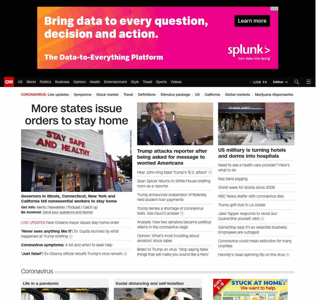 || screaming-banner-text banner-text-size–char-38″ data-analytics=”_list-hierarchical-xs_article_”> More states issue orders to stay home ||” , title: “CNN – Breaking News, Latest News and Videos” , siblings: {“articleList”:[{“uri”:”/2020/03/20/health/us-coronavirus-friday/index.html”,”headline”:”Governors in Illinois, Connecticut, New York and California tell nonessential workers to stay home”,”thumbnail”:”//cdn.cnn.com/cnnnext/dam/assets/200320032821-02-california-shutdown-0319-small-11.jpg”,”duration”:””,”description”:”u003cstrong>Get info: u003c/strong>u003ca href=”https://www.cnn.com/specials/mobile-apps” target=”_blank”>Alertsu003c/a> | u003ca href=”https://www.cnn.com/specials/coronavirus-newsletter?utm_source=hp&source=hp” target=”_blank”>Newsletteru003c/a> | u003ca href=”https://www.cnn.com/audio/podcasts/corona-virus”>Podcastu003c/a> | u003ca href=”https://www.cnn.com/2020/03/20/world/coronavirus-newsletter-03-20-20/index.html” target=”_blank”>Catch upu003c/a>u003cbr />u003cstrong>Be involved: u003c/strong>u003ca href=”http://www.cnn.com/2020/03/20/us/coronavirus-healthcare-worker-callout/index.html” target=”_blank”>Send your questions and storiesu003c/a>”,”layout”:””