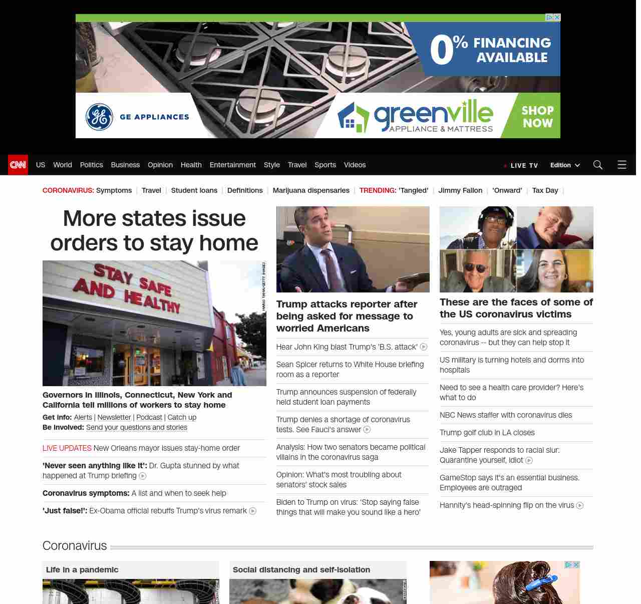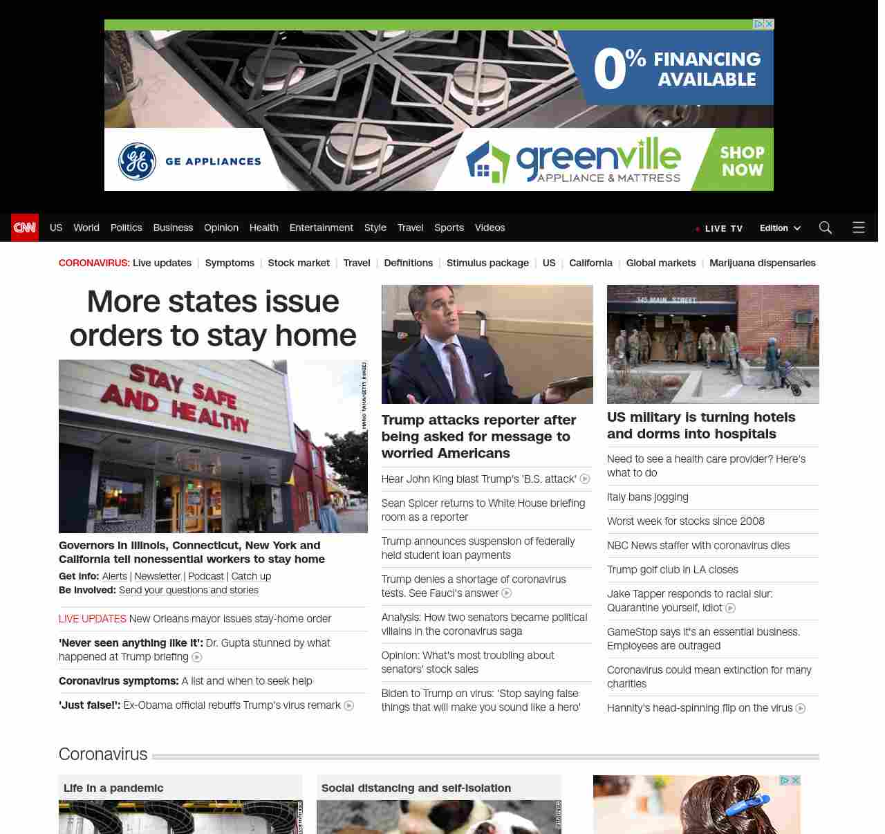 || screaming-banner-text banner-text-size–char-38″ data-analytics=”_list-hierarchical-xs_article_”> More states issue orders to stay home ||” , title: “CNN – Breaking News, Latest News and Videos” , siblings: {“articleList”:[{“uri”:”/2020/03/20/health/us-coronavirus-friday/index.html”,”headline”:”Governors in Illinois, Connecticut, New York and California tell millions of workers to stay home”,”thumbnail”:”//cdn.cnn.com/cnnnext/dam/assets/200320032821-02-california-shutdown-0319-small-11.jpg”,”duration”:””,”description”:”u003cstrong>Get info: u003c/strong>u003ca href=”https://www.cnn.com/specials/mobile-apps” target=”_blank”>Alertsu003c/a> | u003ca href=”https://www.cnn.com/specials/coronavirus-newsletter?utm_source=hp&source=hp” target=”_blank”>Newsletteru003c/a> | u003ca href=”https://www.cnn.com/audio/podcasts/corona-virus”>Podcastu003c/a> | u003ca href=”https://www.cnn.com/2020/03/20/world/coronavirus-newsletter-03-20-20/index.html” target=”_blank”>Catch upu003c/a>u003cbr />u003cstrong>Be involved: u003c/strong>u003ca href=”http://www.cnn.com/2020/03/20/us/coronavirus-healthcare-worker-callout/index.html” target=”_blank”>Send your questions and storiesu003c/a>”,”layout”:””