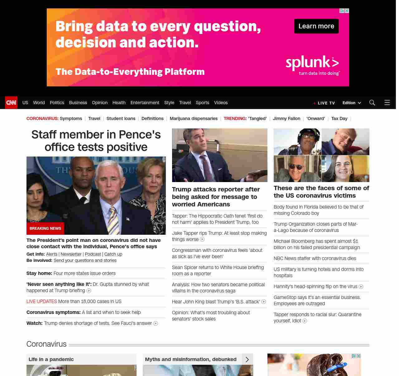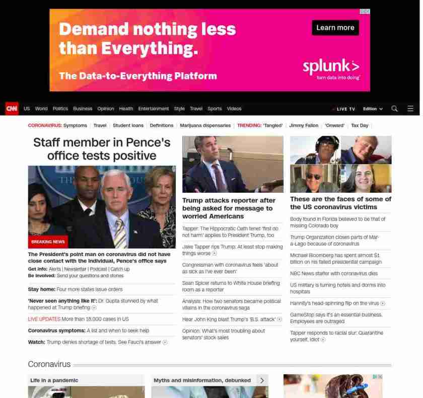 || screaming-banner-text banner-text-size–char-47″ data-analytics=”_list-hierarchical-xs_article_”> Staff member in Pence’s office tests positive ||” , title: “CNN – Breaking News, Latest News and Videos” , siblings: {“articleList”:[{“uri”:”/2020/03/20/politics/staffer-vice-president-office-coronavirus/index.html”,”headline”:”u003cstrong>The President’s point man on coronavirus did not have close contact with the individual, Pence’s office saysu003c/strong>”,”thumbnail”:”//cdn.cnn.com/cnnnext/dam/assets/200314131737-mike-pence-coronavirus-presser-small-11.jpg”,”duration”:””,”description”:”u003cstrong>Get info: u003c/strong>u003ca href=”https://www.cnn.com/specials/mobile-apps” target=”_blank”>Alertsu003c/a> | u003ca href=”https://www.cnn.com/specials/coronavirus-newsletter?utm_source=hp&source=hp” target=”_blank”>Newsletteru003c/a> | u003ca href=”https://www.cnn.com/audio/podcasts/corona-virus”>Podcastu003c/a> | u003ca href=”https://www.cnn.com/2020/03/20/world/coronavirus-newsletter-03-20-20/index.html” target=”_blank”>Catch upu003c/a>u003cbr />u003cstrong>Be involved: u003c/strong>u003ca href=”http://www.cnn.com/2020/03/20/us/coronavirus-healthcare-worker-callout/index.html” target=”_blank”>Send your questions and storiesu003c/a>”,”layout”:””