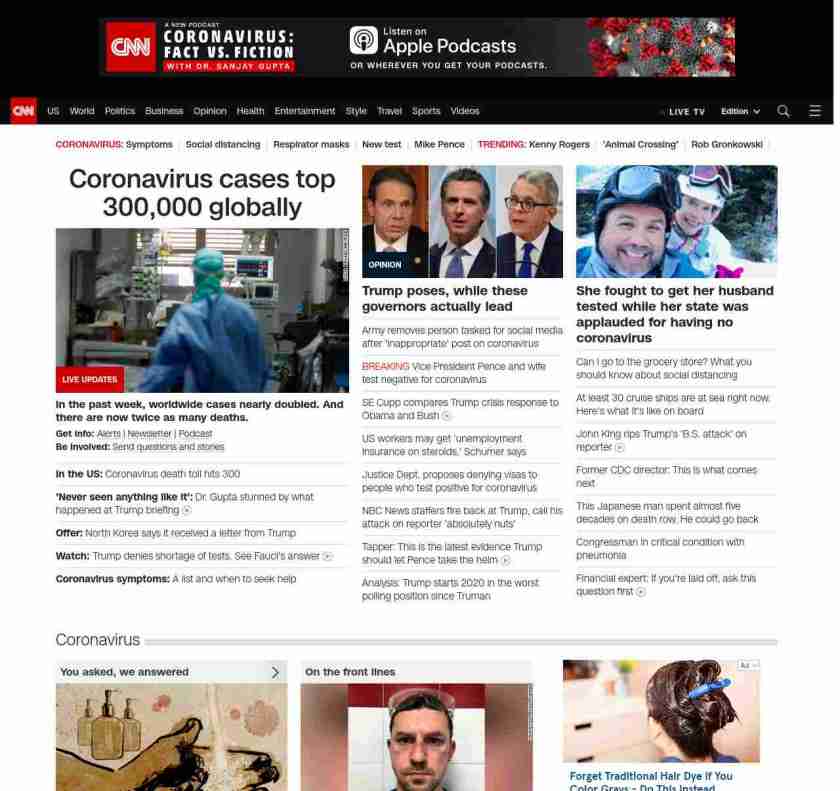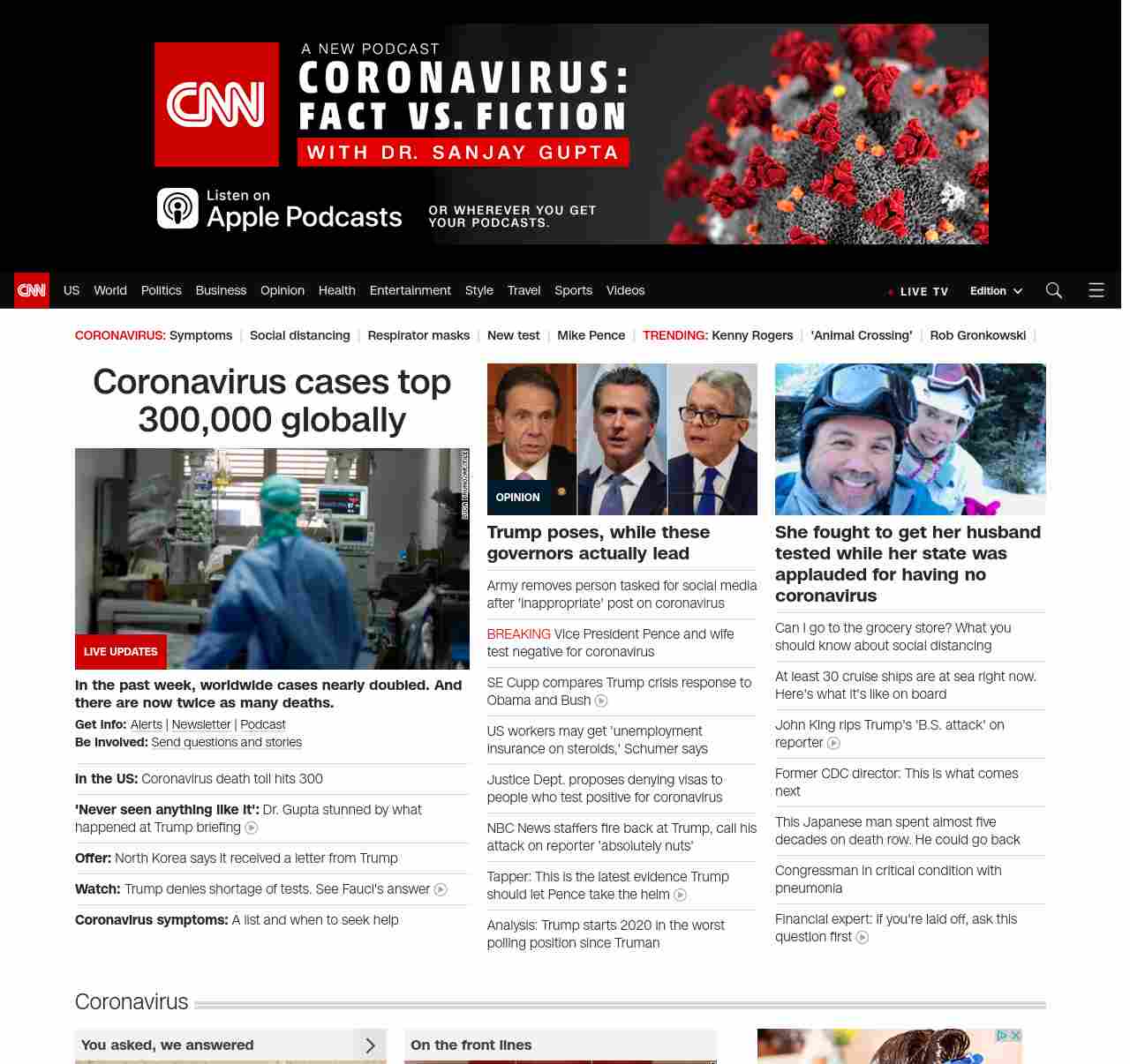 || screaming-banner-text banner-text-size–char-35″ data-analytics=”_list-hierarchical-xs_article_”> US coronavirus death toll hits 300 ||” , title: “CNN – Breaking News, Latest News and Videos” , siblings: {“articleList”:[{“uri”:”/world/live-news/coronavirus-outbreak-03-22-20/index.html”,”headline”:”u003cstrong>In the past week, worldwide cases nearly doubled. And there are now twice as many deaths.u003c/strong>”,”thumbnail”:”//cdn.cnn.com/cnnnext/dam/assets/200319135908-italy-coronavirus-0316-small-11.jpg”,”duration”:””,”description”:”u003cstrong>Get info: u003c/strong>u003ca href=”https://www.cnn.com/specials/mobile-apps” target=”_blank”>Alertsu003c/a> | u003ca href=”https://www.cnn.com/specials/coronavirus-newsletter?utm_source=hp&source=hp” target=”_blank”>Newsletteru003c/a> | u003ca href=”https://www.cnn.com/audio/podcasts/corona-virus”>Podcastu003c/a> u003cbr />u003cstrong>Be involved:u003c/strong> u003ca href=”http://www.cnn.com/2020/03/20/us/coronavirus-healthcare-worker-callout/index.html” target=”_blank”>Send questions and storiesu003c/a>”,”layout”:””
