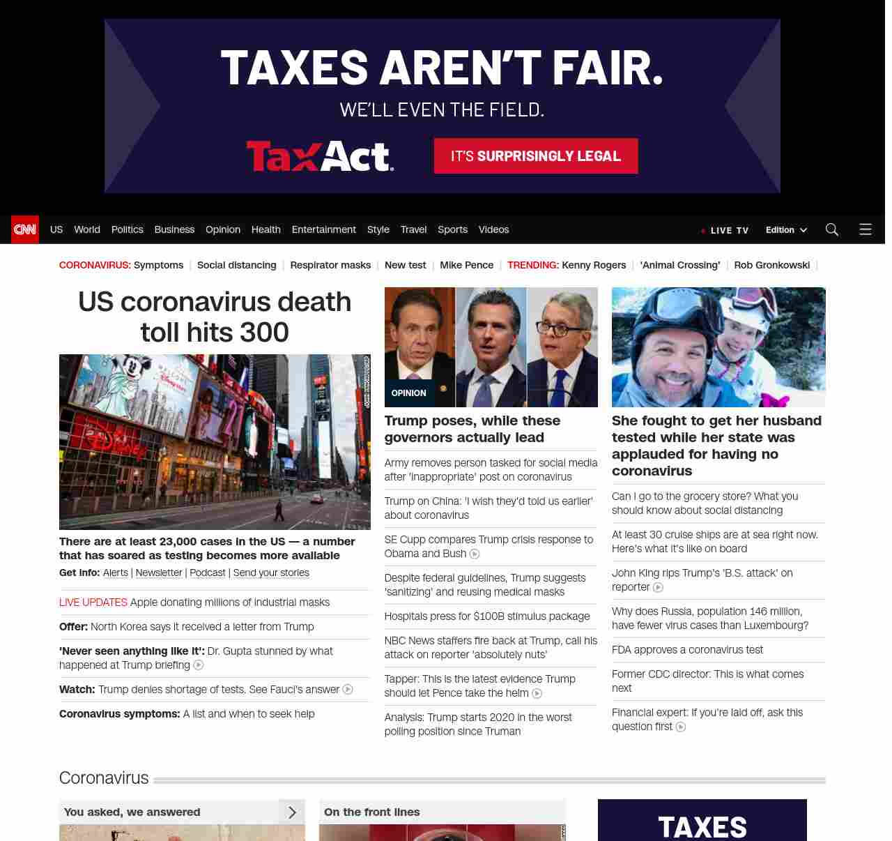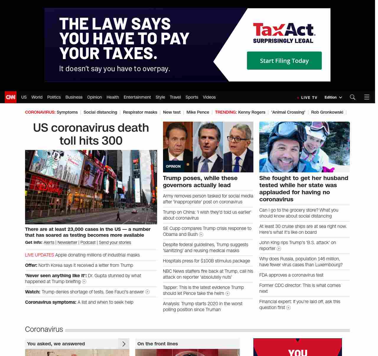 || screaming-banner-text banner-text-size–char-35″ data-analytics=”_list-hierarchical-xs_article_”> US coronavirus death toll hits 300 ||” , title: “CNN – Breaking News, Latest News and Videos” , siblings: {“articleList”:[{“uri”:”/2020/03/21/health/us-coronavirus-wrap-saturday/index.html”,”headline”:”u003cstrong>There are at least 23,000 cases in the US â a number that has soared as testing becomes more availableu003c/strong>”,”thumbnail”:”//cdn.cnn.com/cnnnext/dam/assets/200321030657-01-new-york-coronavirus-0320-small-11.jpg”,”duration”:””,”description”:”u003cstrong>Get info: u003c/strong>u003ca href=”https://www.cnn.com/specials/mobile-apps” target=”_blank”>Alertsu003c/a> | u003ca href=”https://www.cnn.com/specials/coronavirus-newsletter?utm_source=hp&source=hp” target=”_blank”>Newsletteru003c/a> | u003ca href=”https://www.cnn.com/audio/podcasts/corona-virus”>Podcastu003c/a> | u003ca href=”https://www.cnn.com/2020/03/20/us/coronavirus-healthcare-worker-callout/index.html” target=”_blank”>Send your storiesu003c/a>”,”layout”:””