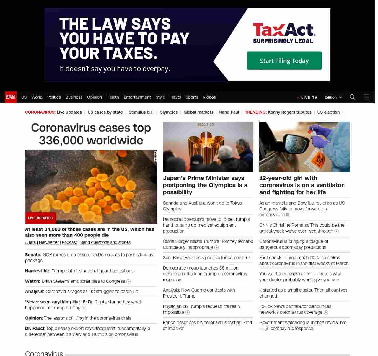 || screaming-banner-text banner-text-size–char-41″ data-analytics=”_list-hierarchical-xs_article_”> Coronavirus cases top 336,000 worldwide ||” , title: “CNN – Breaking News, Latest News and Videos” , siblings: {“articleList”:[{“uri”:”/world/live-news/coronavirus-outbreak-03-23-20-intl-hnk/index.html”,”headline”:”u003cstrong>At least 34,000 of those cases are in the US, which has also seen more than 400 people dieu003c/strong>”,”thumbnail”:”//cdn.cnn.com/cnnnext/dam/assets/200213175739-03-coronavirus-0213-small-11.jpg”,”duration”:””,”description”:”u003ca href=”https://www.cnn.com/specials/mobile-apps” target=”_blank”>Alertsu003c/a> | u003ca href=”https://www.cnn.com/specials/coronavirus-newsletter?utm_source=hp&source=hp” target=”_blank”>Newsletteru003c/a> | u003ca href=”https://www.cnn.com/audio/podcasts/corona-virus”>Podcastu003c/a> | u003ca href=”http://www.cnn.com/2020/03/20/us/coronavirus-healthcare-worker-callout/index.html” target=”_blank”>Send questions and storiesu003c/a>”,”layout”:””