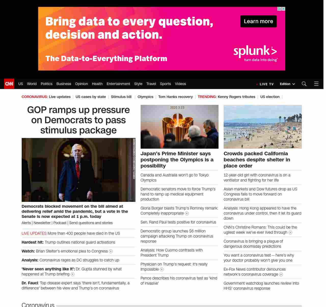 || screaming-banner-text banner-text-size–char-41″ data-analytics=”_list-hierarchical-xs_article_”> Coronavirus cases top 336,000 worldwide ||” , title: “CNN – Breaking News, Latest News and Videos” , siblings: {“articleList”:[{“uri”:”/2020/03/22/politics/stimulus-package-coronavirus-negotiations-congress/index.html”,”headline”:”u003cstrong>Democrats blocked movement on the bill aimed at delivering relief amid the pandemic, but a vote in the Senate is now expected at 1 p.m. Mondayu003c/strong>”,”thumbnail”:”//cdn.cnn.com/cnnnext/dam/assets/200322233657-mitch-mcconnell-0321-small-11.jpg”,”duration”:””,”description”:”u003ca href=”https://www.cnn.com/specials/mobile-apps” target=”_blank”>Alertsu003c/a> | u003ca href=”https://www.cnn.com/specials/coronavirus-newsletter?utm_source=hp&source=hp” target=”_blank”>Newsletteru003c/a> | u003ca href=”https://www.cnn.com/audio/podcasts/corona-virus”>Podcastu003c/a> | u003ca href=”http://www.cnn.com/2020/03/20/us/coronavirus-healthcare-worker-callout/index.html” target=”_blank”>Send questions and storiesu003c/a>”,”layout”:””