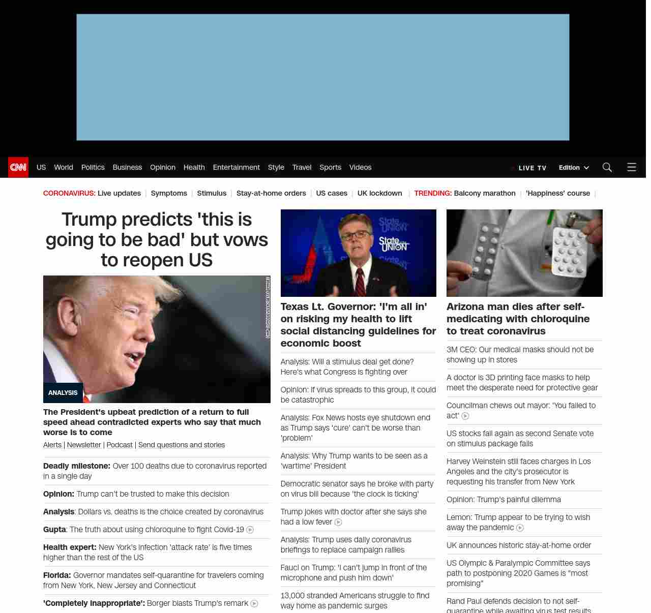 || screaming-banner-text banner-text-size–char-47″ data-analytics=”_list-hierarchical-xs_article_”> Trump predicts ‘this is going to be bad’ but vows to reopen US ||” , title: “CNN – Breaking News, Latest News and Videos” , siblings: {“articleList”:[{“uri”:”/2020/03/24/politics/donald-trump-coronavirus-strategy/index.html”,”headline”:”u003cstrong>The President’s upbeat prediction of a return to full speed ahead contradicted experts who say that much worse is to comeu003c/strong>”,”thumbnail”:”//cdn.cnn.com/cnnnext/dam/assets/200319121026-03-trump-coronoavirus-briefing-0319-small-11.jpg”,”duration”:””,”description”:”u003ca href=”https://www.cnn.com/specials/mobile-apps” target=”_blank”>Alertsu003c/a> | u003ca href=”https://www.cnn.com/specials/coronavirus-newsletter?utm_source=hp&source=hp” target=”_blank”>Newsletteru003c/a> | u003ca href=”https://www.cnn.com/audio/podcasts/corona-virus”>Podcastu003c/a> | u003ca href=”http://www.cnn.com/2020/03/20/us/coronavirus-healthcare-worker-callout/index.html” target=”_blank”>Send questions and storiesu003c/a>”,”layout”:””