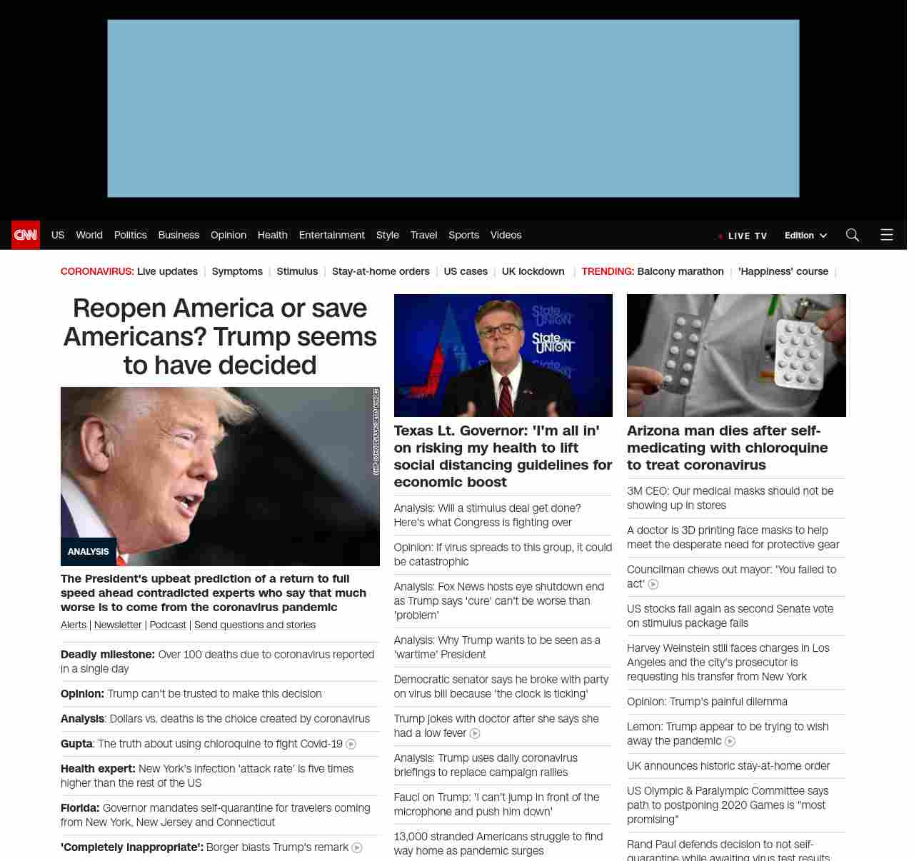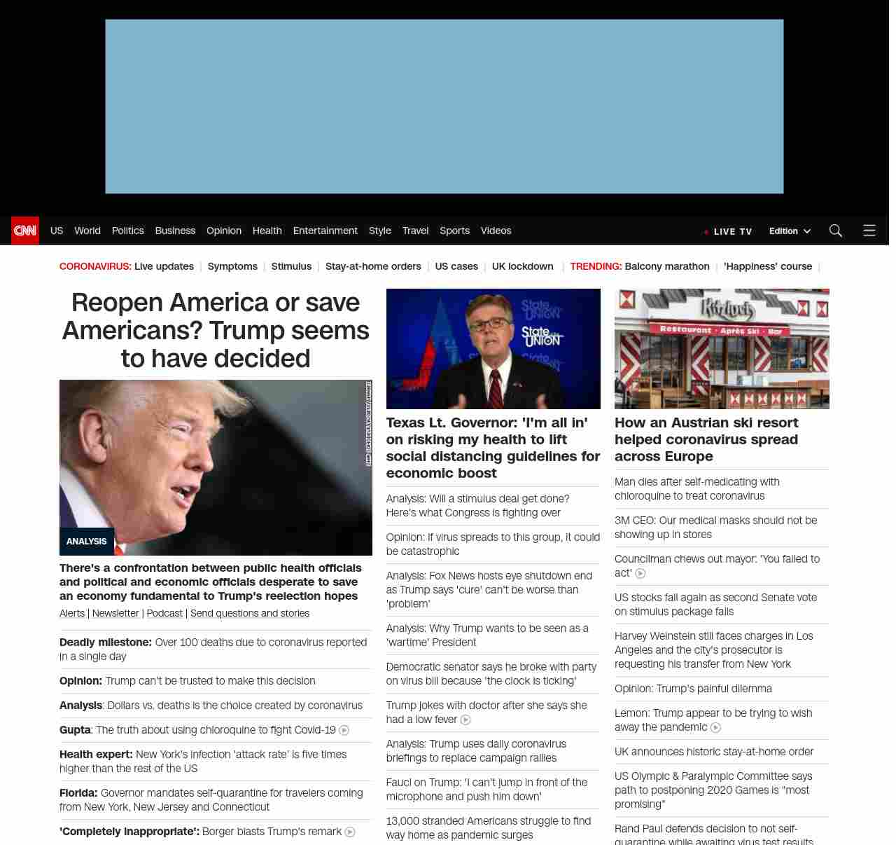 || screaming-banner-text banner-text-size–char-47″ data-analytics=”_list-hierarchical-xs_article_”> Reopen America or save Americans? Trump seems to have decided ||” , title: “CNN – Breaking News, Latest News and Videos” , siblings: {“articleList”:[{“uri”:”/2020/03/24/politics/donald-trump-coronavirus-strategy/index.html”,”headline”:”u003cstrong>There’s a u003c/strong>u003cstrong>confrontation between public health officials and political and economic officials desperate to save an economy fundamental to Trump’s reelection hopesu003c/strong>”,”thumbnail”:”//cdn.cnn.com/cnnnext/dam/assets/200319121026-03-trump-coronoavirus-briefing-0319-small-11.jpg”,”duration”:””,”description”:”u003ca href=”https://www.cnn.com/specials/mobile-apps” target=”_blank”>Alertsu003c/a> | u003ca href=”https://www.cnn.com/specials/coronavirus-newsletter?utm_source=hp&source=hp” target=”_blank”>Newsletteru003c/a> | u003ca href=”https://www.cnn.com/audio/podcasts/corona-virus”>Podcastu003c/a> | u003ca href=”http://www.cnn.com/2020/03/20/us/coronavirus-healthcare-worker-callout/index.html” target=”_blank”>Send questions and storiesu003c/a>”,”layout”:””