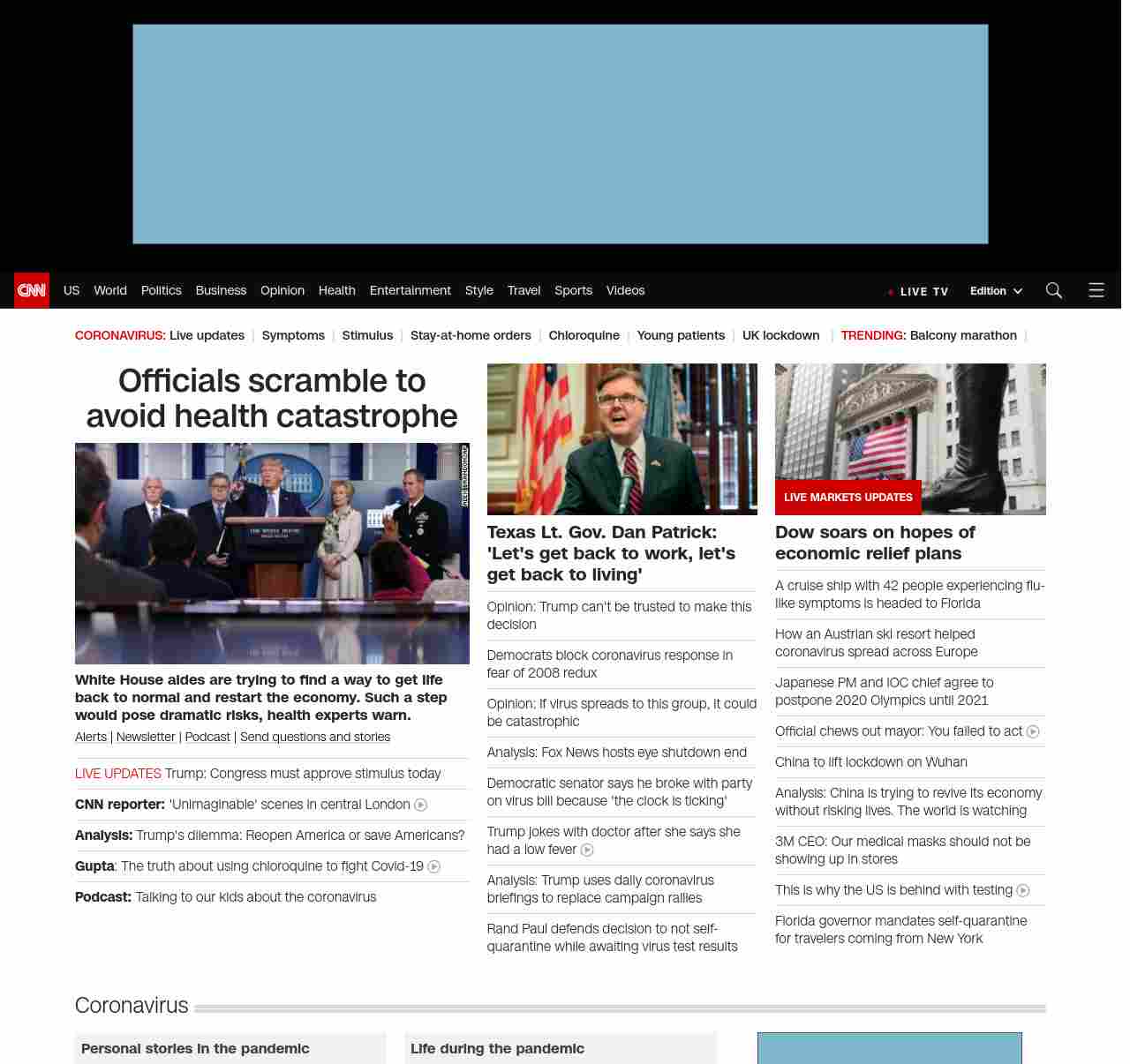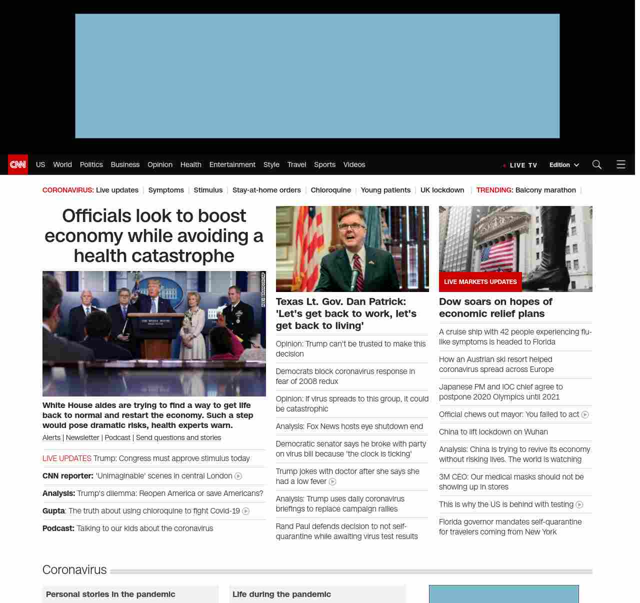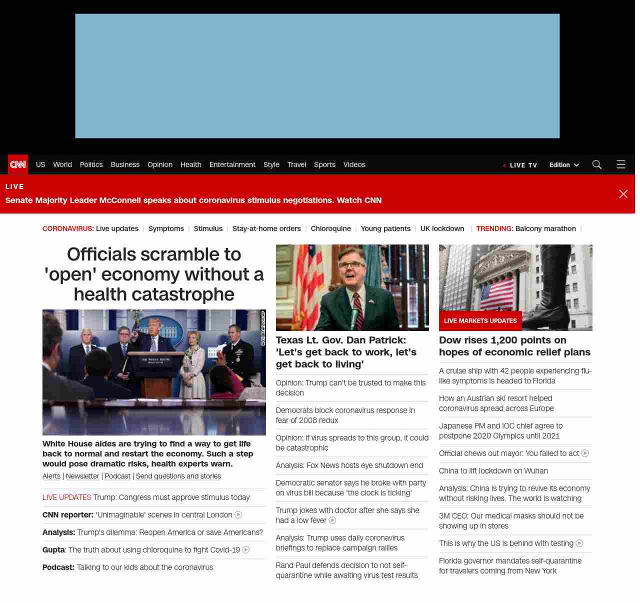 || screaming-banner-text banner-text-size–char-47″ data-analytics=”_list-hierarchical-xs_article_”> Officials scramble to ‘open’ economy without a health catastrophe ||” , title: “CNN – Breaking News, Latest News and Videos” , siblings: {“articleList”:[{“uri”:”/2020/03/24/politics/trump-coronavirus-economy-open-health/index.html”,”headline”:”u003cstrong>White House aides are trying to find a way to get life back to normal and restart the economy. Such a step would pose dramatic risks, health experts warn.u003c/strong>”,”thumbnail”:”//cdn.cnn.com/cnnnext/dam/assets/200323232357-08-coronavirus-presser-0323-trump-small-11.jpg”,”duration”:””,”description”:”u003ca href=”https://www.cnn.com/specials/mobile-apps” target=”_blank”>Alertsu003c/a> | u003ca href=”https://www.cnn.com/specials/coronavirus-newsletter?utm_source=hp&source=hp” target=”_blank”>Newsletteru003c/a> | u003ca href=”https://www.cnn.com/audio/podcasts/corona-virus”>Podcastu003c/a> | u003ca href=”http://www.cnn.com/2020/03/20/us/coronavirus-healthcare-worker-callout/index.html” target=”_blank”>Send questions and storiesu003c/a>”,”layout”:””