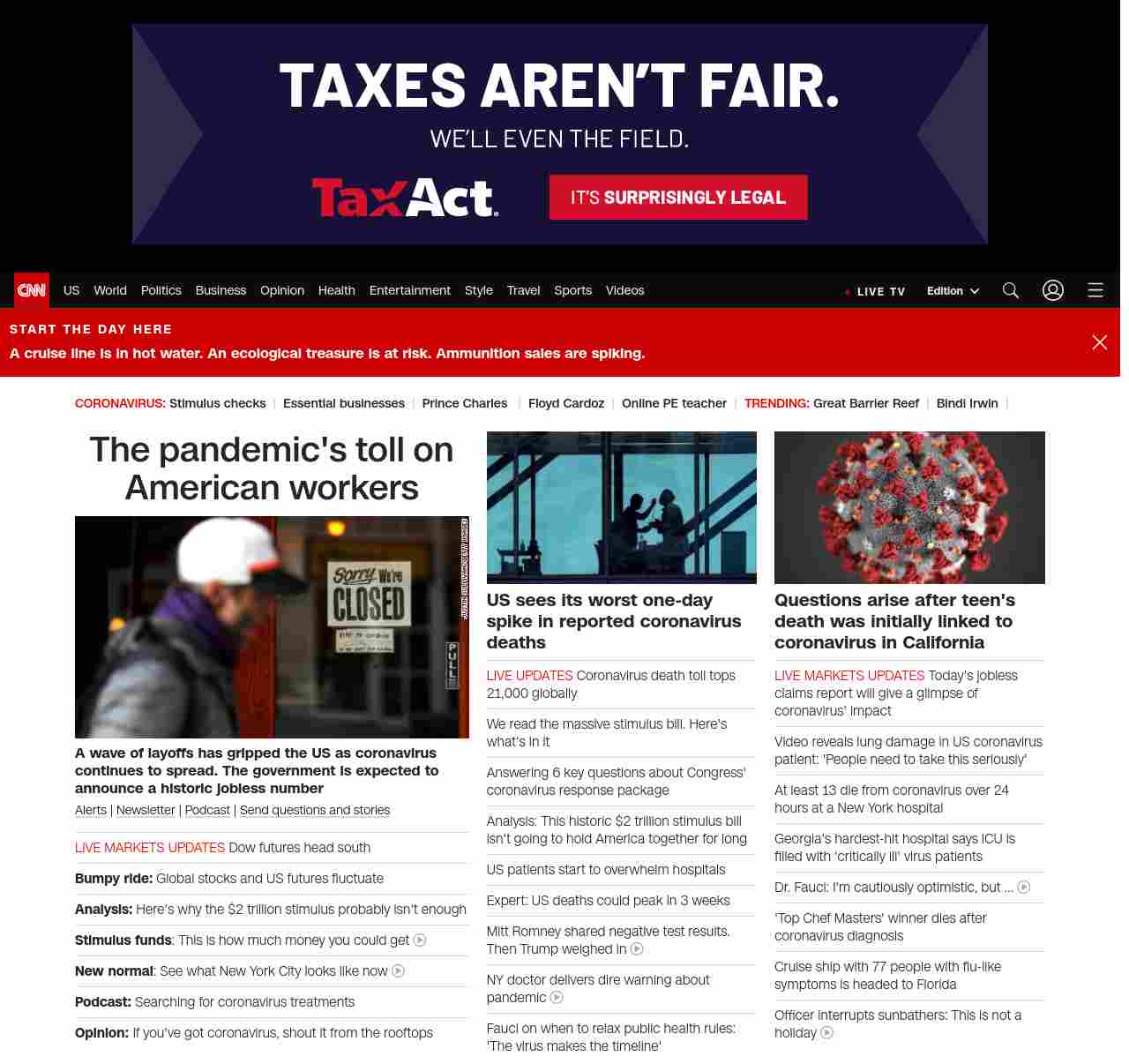 || screaming-banner-text banner-text-size–char-44″ data-analytics=”_list-hierarchical-xs_article_”> Here’s what’s in the massive stimulus bill ||” , title: “CNN – Breaking News, Latest News and Videos” , siblings: {“articleList”:[{“uri”:”/2020/03/26/investing/premarket-stocks-trading/index.html”,”headline”:”u003cstrong>A wave of layoffs has gripped the US as coronavirus continues to spread. The government is expected to announce a historic jobless numberu003c/strong>”,”thumbnail”:”//cdn.cnn.com/cnnnext/dam/assets/200326065452-01-closed-restaurant-san-francisco-0317-small-11.jpg”,”duration”:””,”description”:”u003ca href=”https://www.cnn.com/specials/mobile-apps” target=”_blank”>Alertsu003c/a> | u003ca href=”https://www.cnn.com/specials/coronavirus-newsletter?utm_source=hp&source=hp” target=”_blank”>Newsletteru003c/a> | u003ca href=”https://www.cnn.com/audio/podcasts/corona-virus”>Podcastu003c/a> | u003ca href=”http://www.cnn.com/2020/03/20/us/coronavirus-healthcare-worker-callout/index.html” target=”_blank”>Send questions and storiesu003c/a>”,”layout”:””