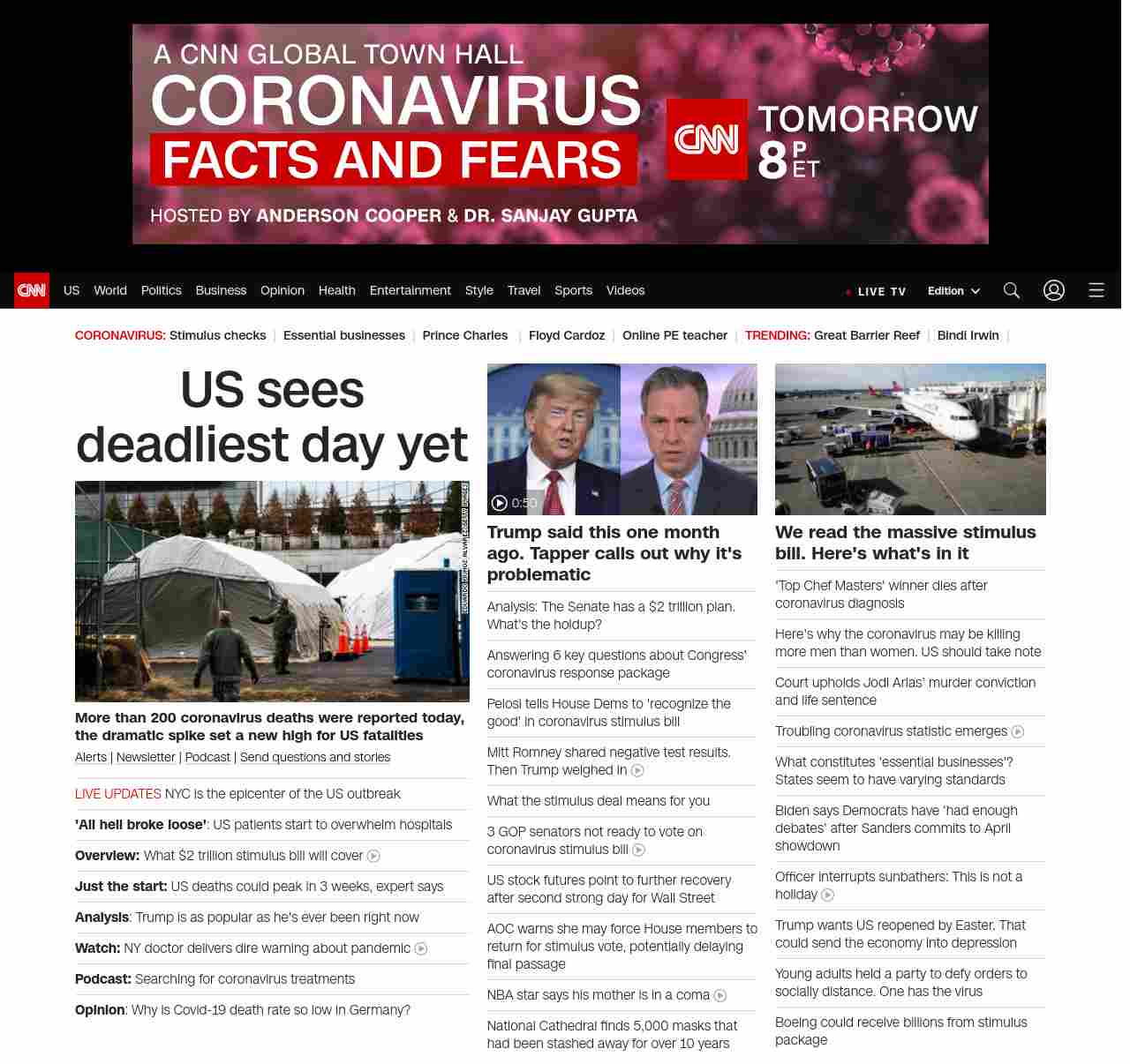 || screaming-banner-text banner-text-size–char-26″ data-analytics=”_list-hierarchical-xs_article_”> US sees deadliest day yet ||” , title: “CNN – Breaking News, Latest News and Videos” , siblings: {“articleList”:[{“uri”:”/2020/03/25/health/coronavirus-state-actions-wednesday/index.html”,”headline”:”u003cstrong>More than 200 coronavirus deaths were reported today, the dramatic spike set a new high for US fatalitiesu003c/strong>”,”thumbnail”:”//cdn.cnn.com/cnnnext/dam/assets/200325194721-coronavirus-makeshift-morgue-bellevue-0325-small-11.jpg”,”duration”:””,”description”:”u003ca href=”https://www.cnn.com/specials/mobile-apps” target=”_blank”>Alertsu003c/a> | u003ca href=”https://www.cnn.com/specials/coronavirus-newsletter?utm_source=hp&source=hp” target=”_blank”>Newsletteru003c/a> | u003ca href=”https://www.cnn.com/audio/podcasts/corona-virus”>Podcastu003c/a> | u003ca href=”http://www.cnn.com/2020/03/20/us/coronavirus-healthcare-worker-callout/index.html” target=”_blank”>Send questions and storiesu003c/a>”,”layout”:””
