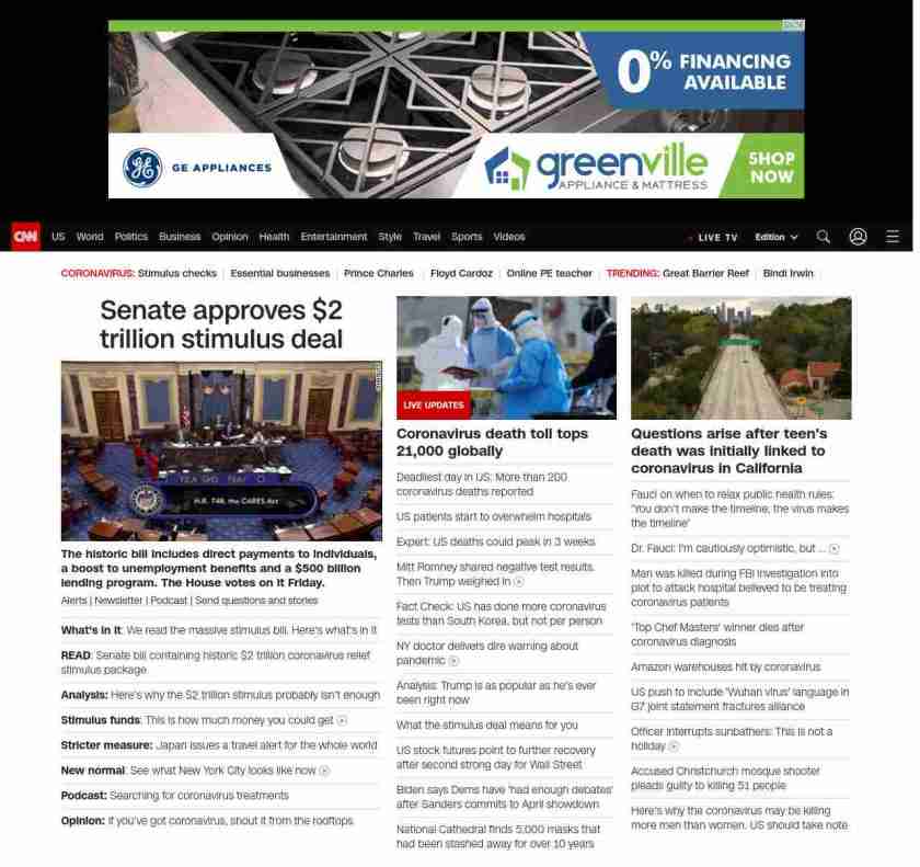 || screaming-banner-text banner-text-size–char-44″ data-analytics=”_list-hierarchical-xs_article_”> Senate approves $2 trillion stimulus deal ||” , title: “CNN – Breaking News, Latest News and Videos” , siblings: {“articleList”:[{“uri”:”/2020/03/25/politics/stimulus-senate-action-coronavirus/index.html”,”headline”:”u003cstrong>The historic bill includes direct payments to individuals, a boost to unemployment benefits and a $500 billion lending program. The House votes on it Friday.u003c/strong>”,”thumbnail”:”//cdn.cnn.com/cnnnext/dam/assets/200325235149-02-senate-floor-0325-small-11.jpg”,”duration”:””,”description”:”u003ca href=”https://www.cnn.com/specials/mobile-apps” target=”_blank”>Alertsu003c/a> | u003ca href=”https://www.cnn.com/specials/coronavirus-newsletter?utm_source=hp&source=hp” target=”_blank”>Newsletteru003c/a> | u003ca href=”https://www.cnn.com/audio/podcasts/corona-virus”>Podcastu003c/a> | u003ca href=”http://www.cnn.com/2020/03/20/us/coronavirus-healthcare-worker-callout/index.html” target=”_blank”>Send questions and storiesu003c/a>”,”layout”:””