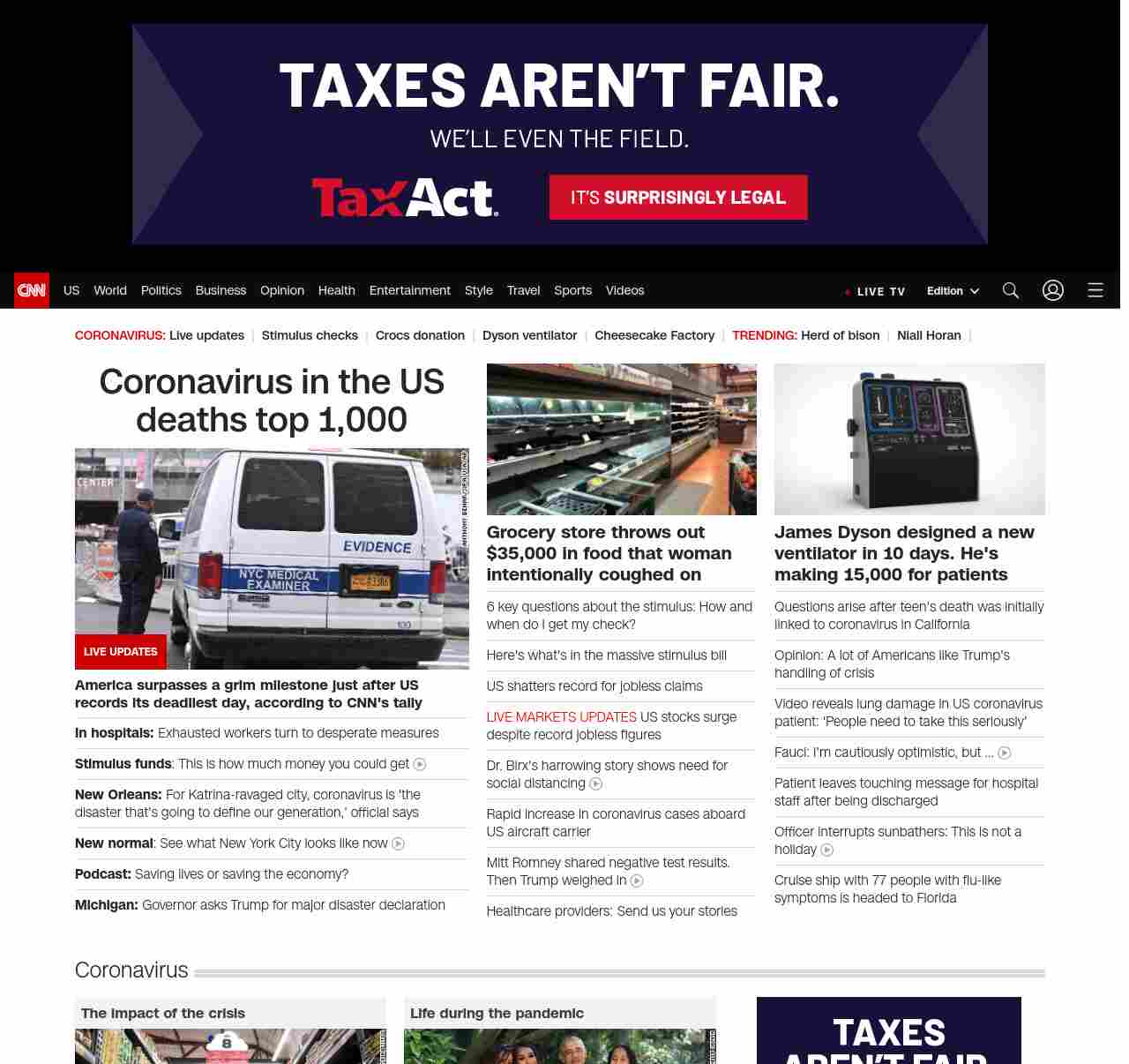 || screaming-banner-text banner-text-size–char-41″ data-analytics=”_list-hierarchical-xs_article_”> Coronavirus in the US deaths top 1,000 ||” , title: “CNN – Breaking News, Latest News and Videos” , siblings: {“articleList”:[{“uri”:”/world/live-news/coronavirus-outbreak-03-26-20-intl-hnk/index.html”,”headline”:”u003cstrong>America surpasses a grim milestone just after US records its deadliest day, according to CNN’s tallyu003c/strong>”,”thumbnail”:”//cdn.cnn.com/cnnnext/dam/assets/200326120556-nyc-makeshift-morgue-small-11.jpg”,”duration”:””,”description”:””,”layout”:””