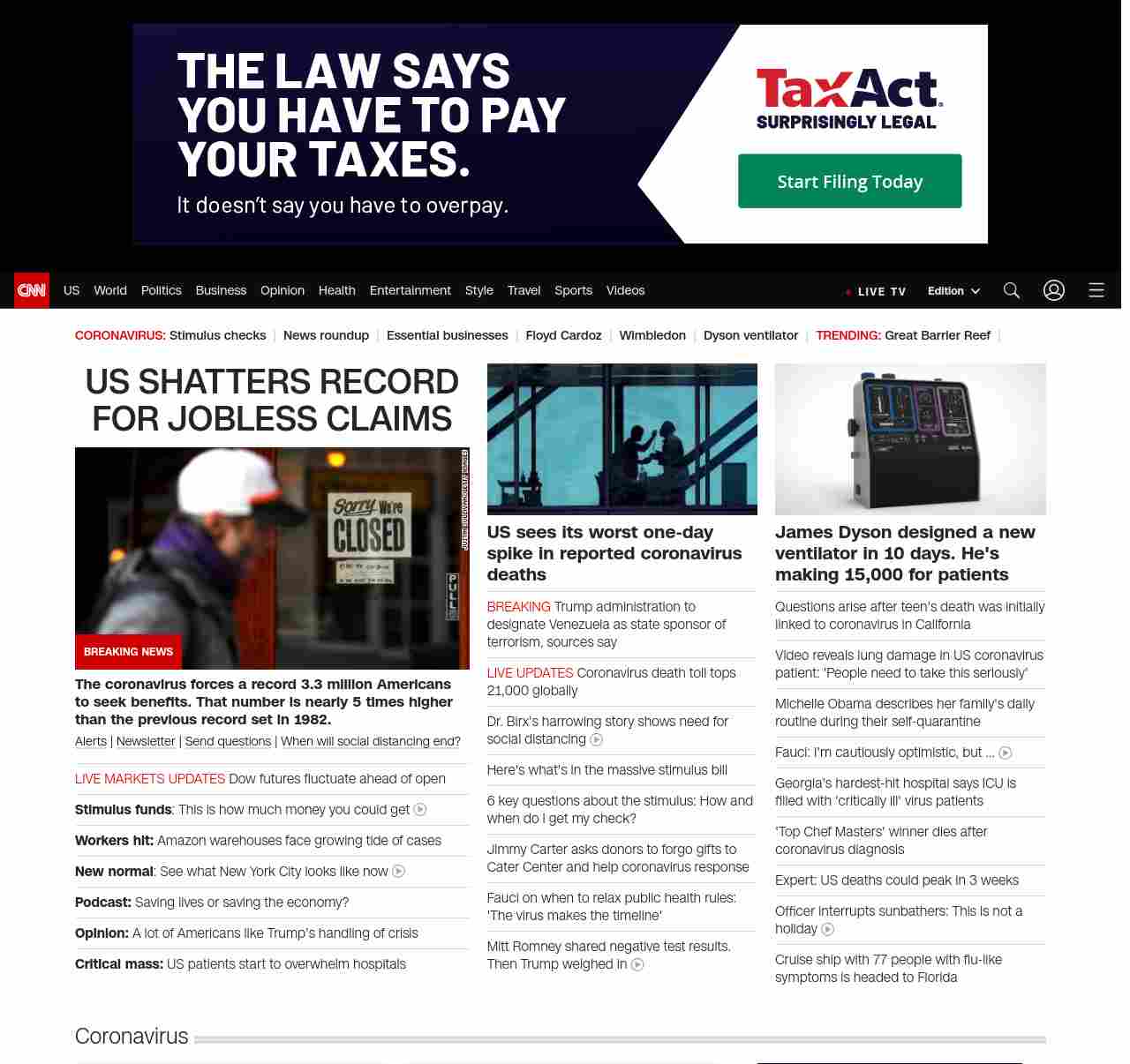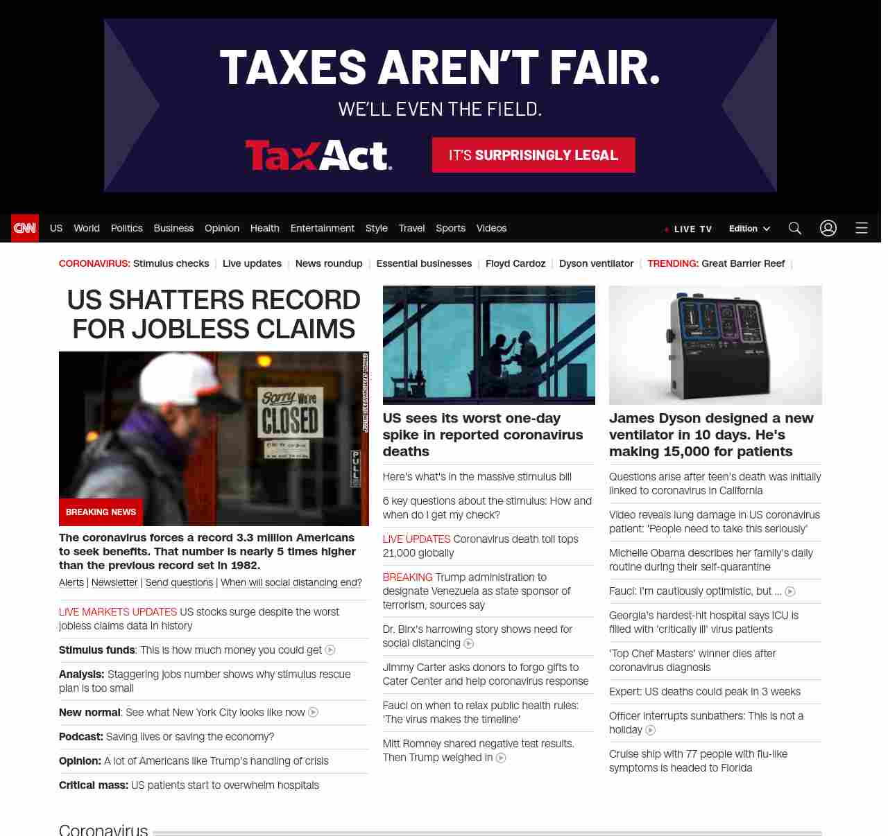 || screaming-banner-text banner-text-size–char-38-uc” data-analytics=”_list-hierarchical-xs_hyperlink_”> US SHATTERS RECORD FOR JOBLESS CLAIMS ||” , title: “CNN – Breaking News, Latest News and Videos” , siblings: {“articleList”:[{“uri”:”/business/live-news/stock-market-news-today-032620/index.html”,”headline”:”US stocks surge despite the worst jobless claims data in history”,”thumbnail”:”//cdn.cnn.com/cnnnext/dam/assets/200326065452-01-closed-restaurant-san-francisco-0317-small-11.jpg”,”duration”:””,”description”:””,”layout”:””