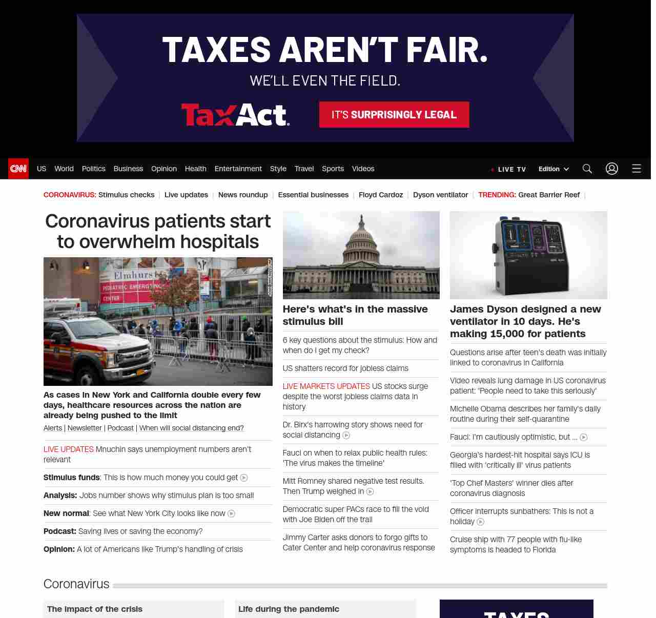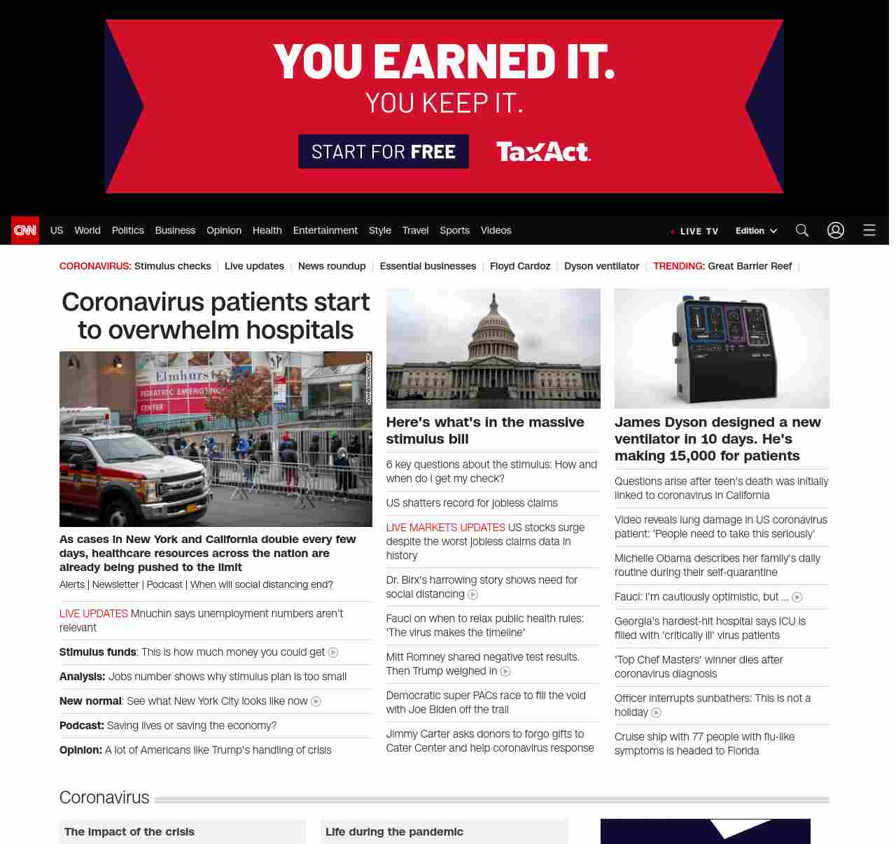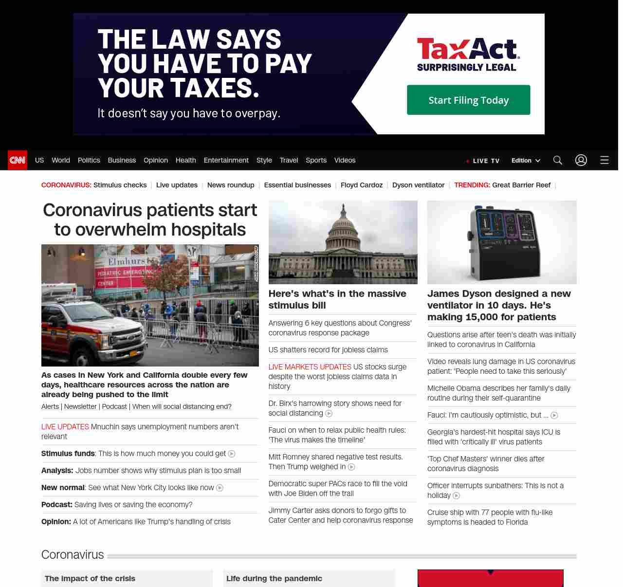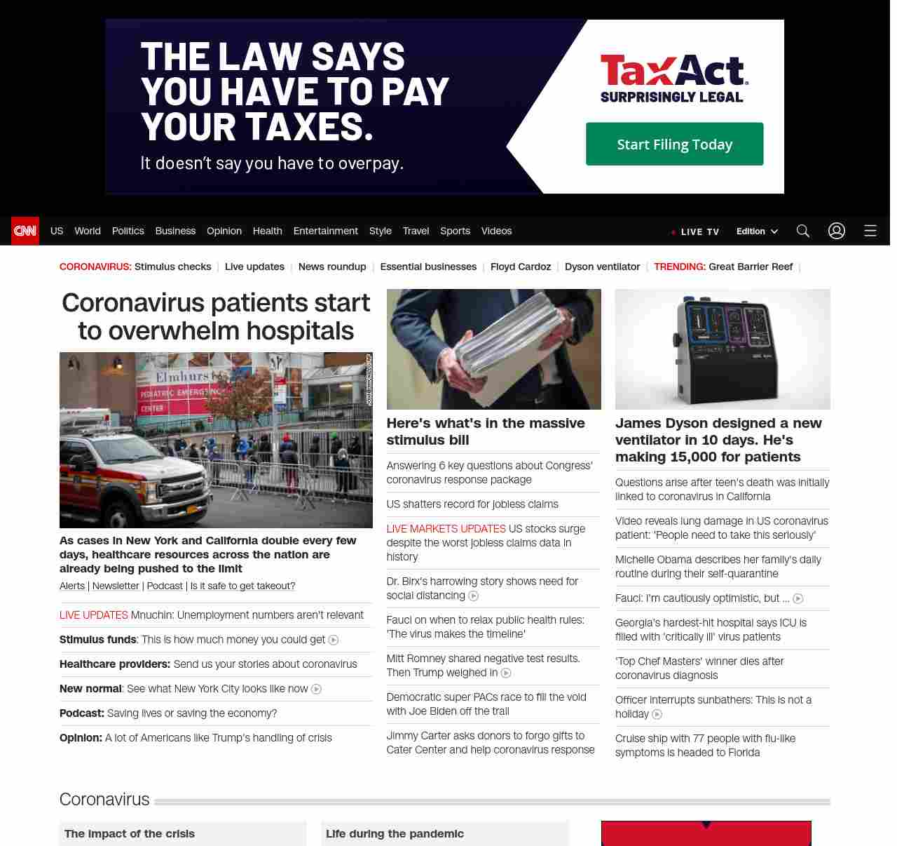 || screaming-banner-text banner-text-size–char-47″ data-analytics=”_list-hierarchical-xs_hyperlink_”> Coronavirus patients start to overwhelm hospitals ||” , title: “CNN – Breaking News, Latest News and Videos” , siblings: {“articleList”:[{“uri”:”/world/live-news/coronavirus-outbreak-03-26-20-intl-hnk/index.html”,”headline”:”Mnuchin says unemployment numbers aren’t relevant”,”thumbnail”:”//cdn.cnn.com/cnnnext/dam/assets/200325201859-01-coronavirus-0325-illinois-small-11.jpg”,”duration”:””,”description”:””,”layout”:””