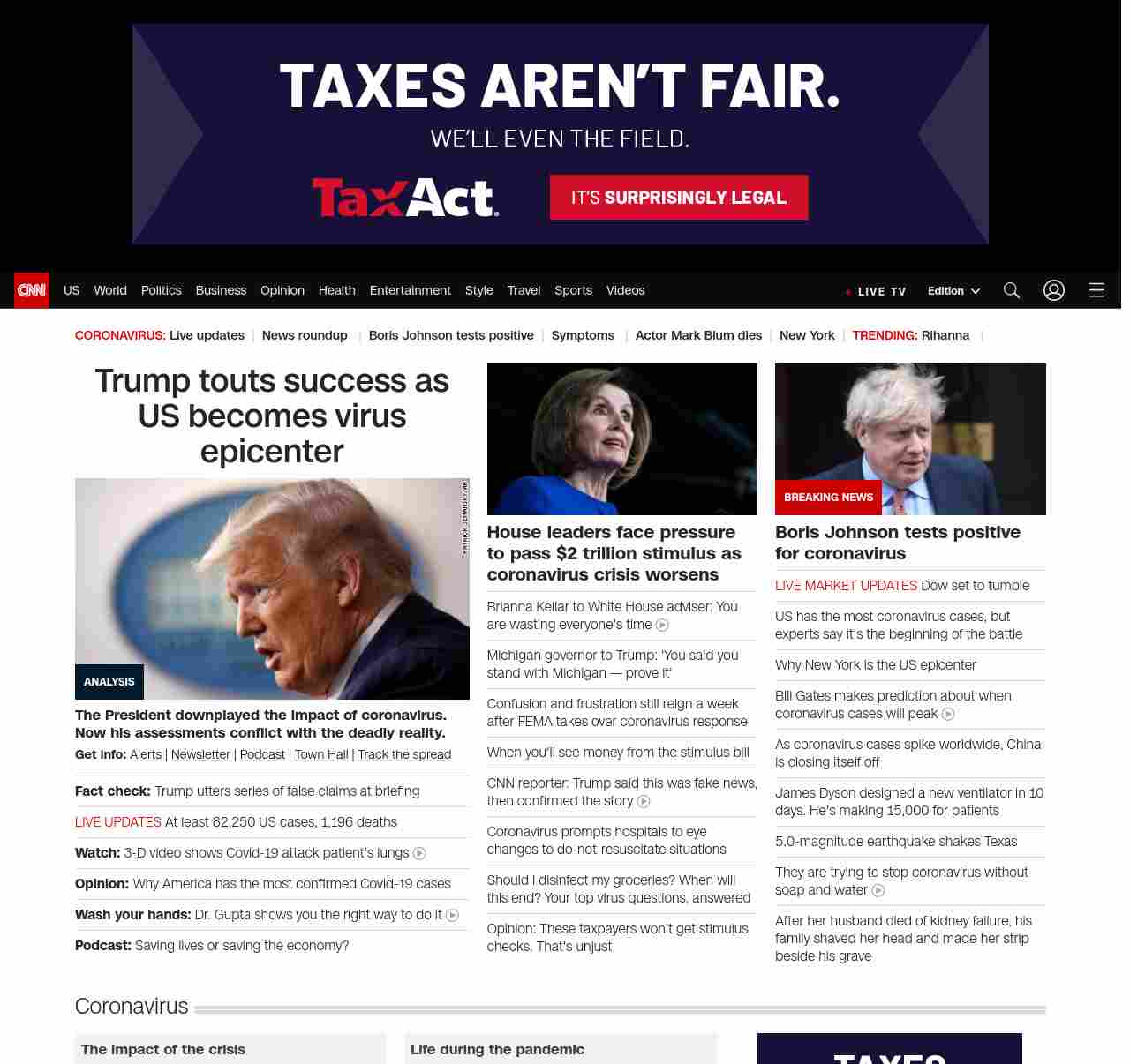 || screaming-banner-text banner-text-size–char-47″ data-analytics=”_list-hierarchical-xs_article_”> Trump touts success as US becomes virus epicenter ||” , title: “CNN – Breaking News, Latest News and Videos” , siblings: {“articleList”:[{“uri”:”/2020/03/27/politics/donald-trump-coronavirus-response/index.html”,”headline”:”u003cstrong>The President downplayed the impact of coronavirus. Now his assessments conflict with the deadly reality.u003c/strong>”,”thumbnail”:”//cdn.cnn.com/cnnnext/dam/assets/200323102839-01-donald-trump-0322-lead-small-11.jpg”,”duration”:””,”description”:”u003cstrong>Get info:u003c/strong> u003ca href=”https://www.cnn.com/specials/mobile-apps” target=”_blank”>Alertsu003c/a> | u003ca href=”https://www.cnn.com/specials/coronavirus-newsletter?utm_source=hp&source=hp” target=”_blank”>Newsletteru003c/a> | u003ca href=”https://www.cnn.com/audio/podcasts/corona-virus”>Podcastu003c/a> | u003ca href=”http://www.cnn.com/2020/03/26/app-news-section/full-coronavirus-town-hall-march-26-2020-app/index.html” target=”_blank”>Town Hallu003c/a> | u003ca href=”https://www.cnn.com/interactive/2020/health/coronavirus-maps-and-cases/” target=”_blank”>Track the spreadu003c/a>”,”layout”:””