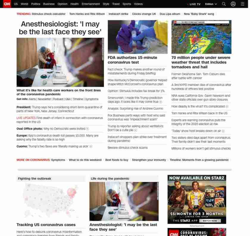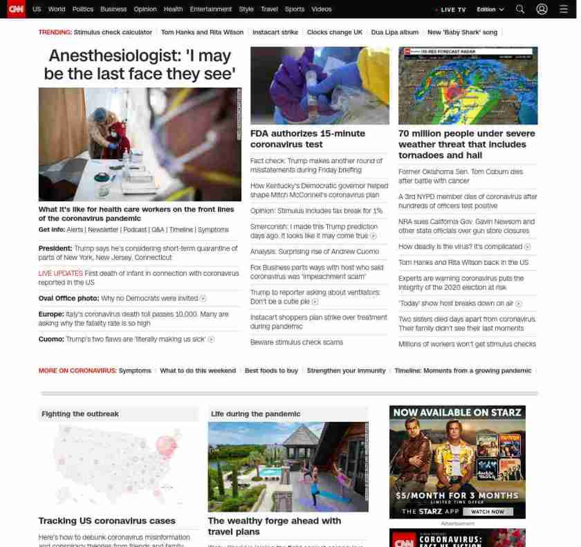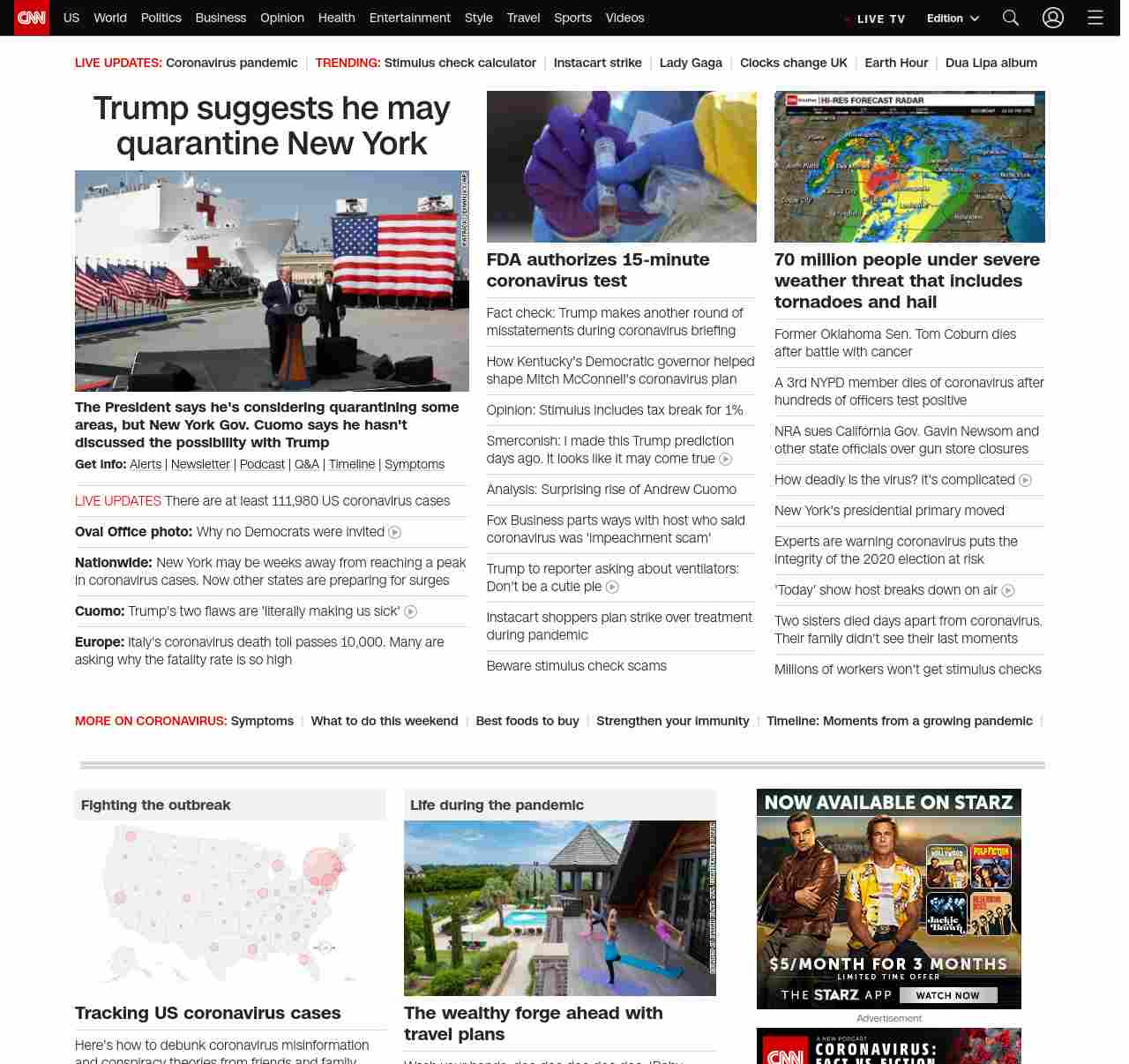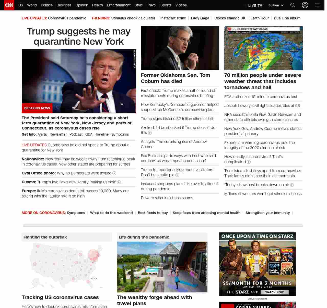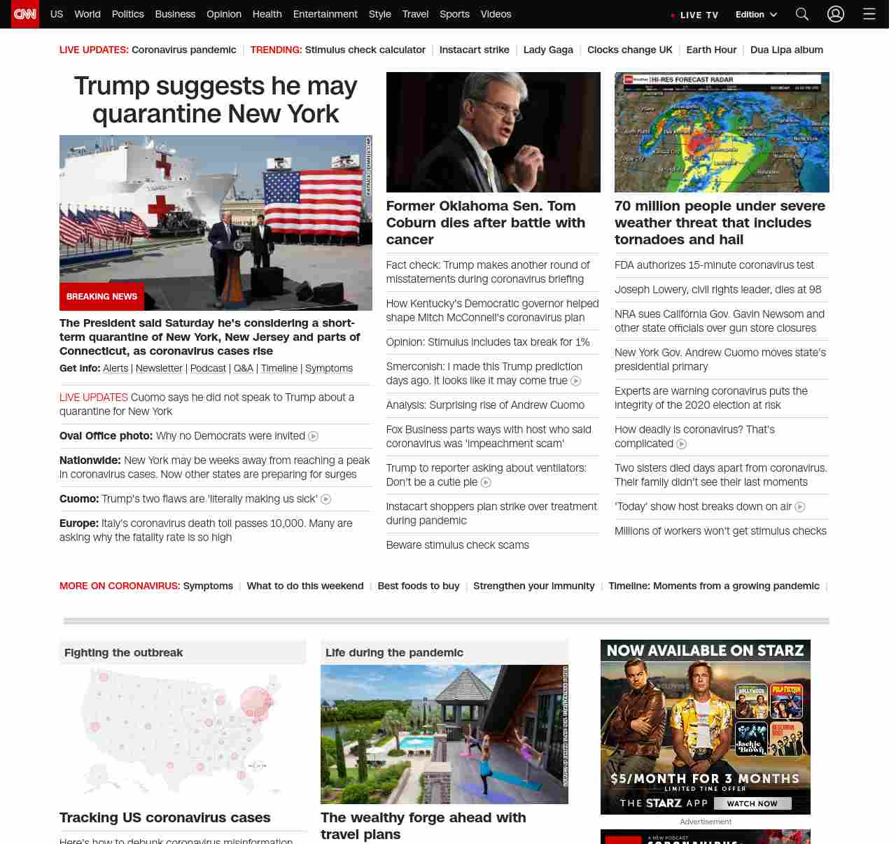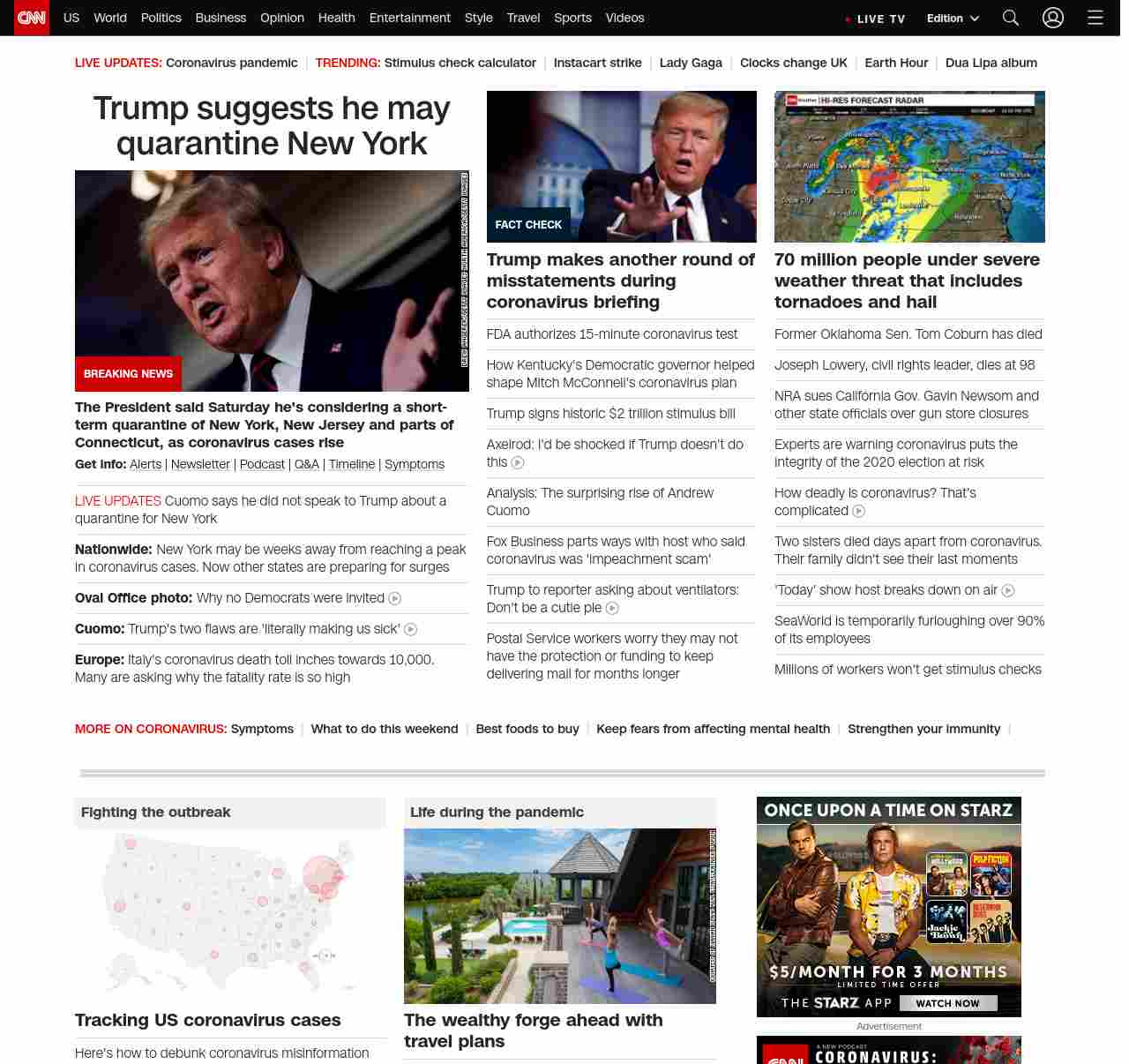 || screaming-banner-text banner-text-size–char-44″ data-analytics=”_list-hierarchical-xs_article_”> Trump suggests he may quarantine New York ||” , title: “CNN – Breaking News, Latest News and Videos” , siblings: {“articleList”:[{“uri”:”/2020/03/28/politics/trump-new-york-new-jersey-quarantine-coronavirus/index.html”,”headline”:”u003cstrong>The President said Saturday he’s considering a short-term quarantine of New York, New Jersey and parts of Connecticut, as coronavirus cases riseu003c/strong>”,”thumbnail”:”//cdn.cnn.com/cnnnext/dam/assets/200328141115-01-trump-usns-comfort-0328-small-11.jpg”,”duration”:””,”description”:”u003cstrong>Get info:u003c/strong> u003ca href=”https://www.cnn.com/specials/mobile-apps” target=”_blank”>Alertsu003c/a> | u003ca href=”https://www.cnn.com/specials/coronavirus-newsletter?utm_source=hp&source=hp” target=”_blank”>Newsletteru003c/a> | u003ca href=”https://www.cnn.com/audio/podcasts/corona-virus”>Podcastu003c/a> | u003ca href=”https://www.cnn.com/interactive/2020/health/coronavirus-questions-answers/” target=”_blank”>Q&Au003c/a> | u003ca href=”https://www.cnn.com/2020/02/06/health/wuhan-coronavirus-timeline-fast-facts/index.html” target=”_blank”>Timelineu003c/a> | u003ca href=”https://www.cnn.com/2020/03/28/health/coronavirus-symptoms-list-what-to-do-wellness/index.html” target=”_blank”>Symptomsu003c/a>”,”layout”:””