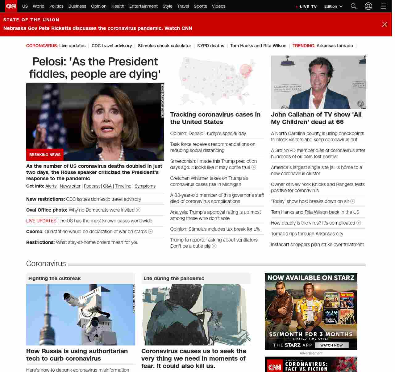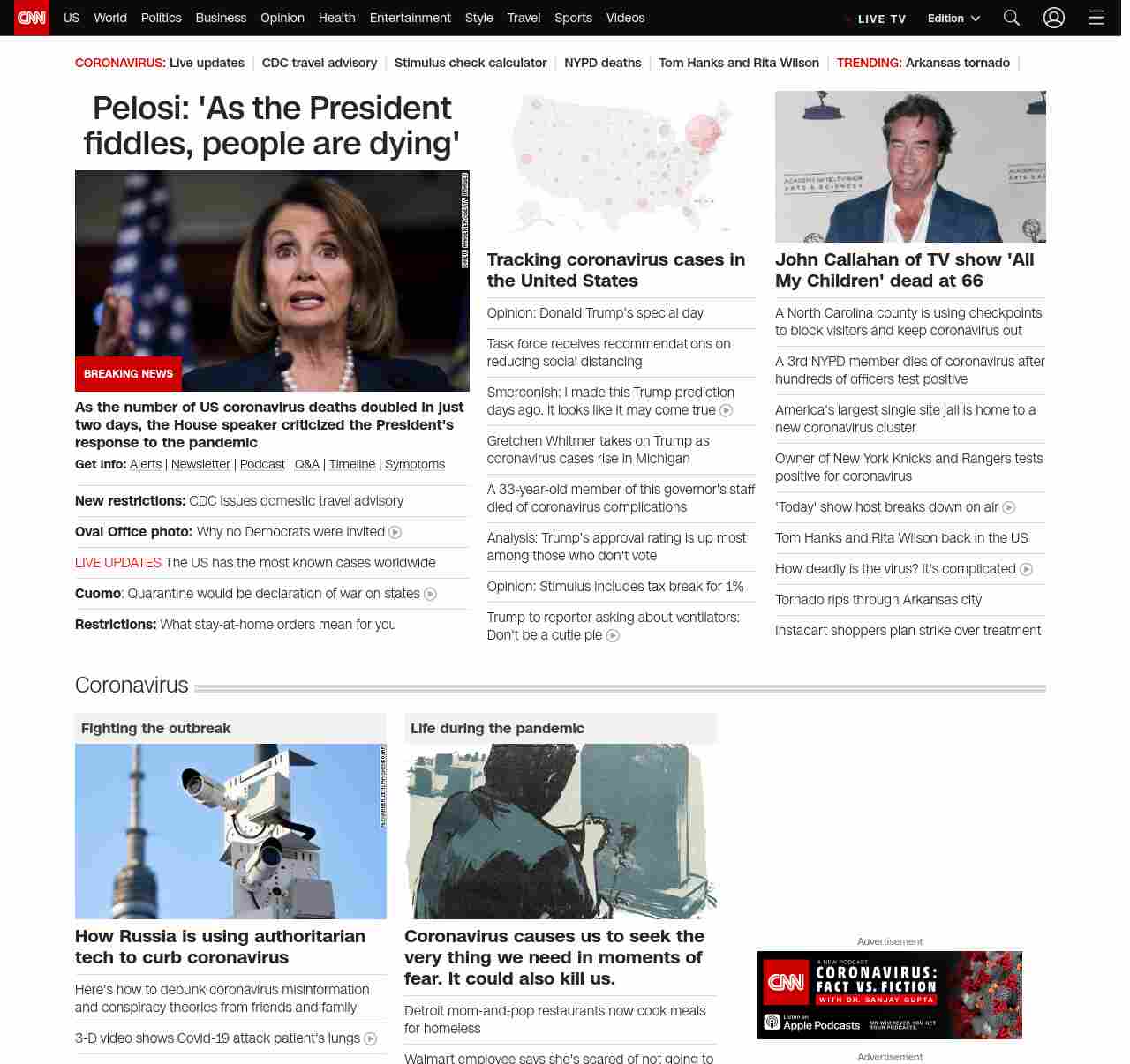 || screaming-banner-text banner-text-size–char-47″ data-analytics=”_list-hierarchical-xs_article_”> CDC issues travel advisory as deaths double within two days ||” , title: “CNN – Breaking News, Latest News and Videos” , siblings: {“articleList”:[{“uri”:”/2020/03/29/politics/nancy-pelosi-coronavirus-cnntv/index.html”,”headline”:”u003cstrong>As the number of US coronavirus deaths doubled in just two days, the House speaker criticized the President’s response to the pandemicu003c/strong>”,”thumbnail”:”//cdn.cnn.com/cnnnext/dam/assets/181105180156-01-nancy-pelosi-house-speaker-race-110518-small-11.jpg”,”duration”:””,”description”:”u003cstrong>Get info:u003c/strong> u003ca href=”https://www.cnn.com/specials/mobile-apps” target=”_blank”>Alertsu003c/a> | u003ca href=”https://www.cnn.com/specials/coronavirus-newsletter?utm_source=hp&source=hp” target=”_blank”>Newsletteru003c/a> | u003ca href=”https://www.cnn.com/audio/podcasts/corona-virus”>Podcastu003c/a> | u003ca href=”https://www.cnn.com/interactive/2020/health/coronavirus-questions-answers/” target=”_blank”>Q&Au003c/a> | u003ca href=”https://www.cnn.com/2020/02/06/health/wuhan-coronavirus-timeline-fast-facts/index.html” target=”_blank”>Timelineu003c/a> | u003ca href=”https://www.cnn.com/2020/03/28/health/coronavirus-symptoms-list-what-to-do-wellness/index.html” target=”_blank”>Symptomsu003c/a>”,”layout”:””