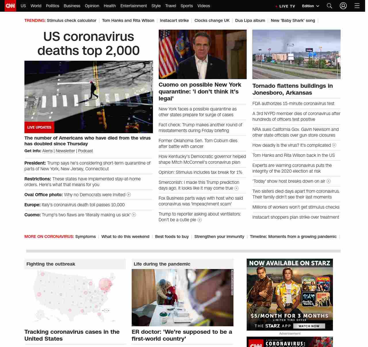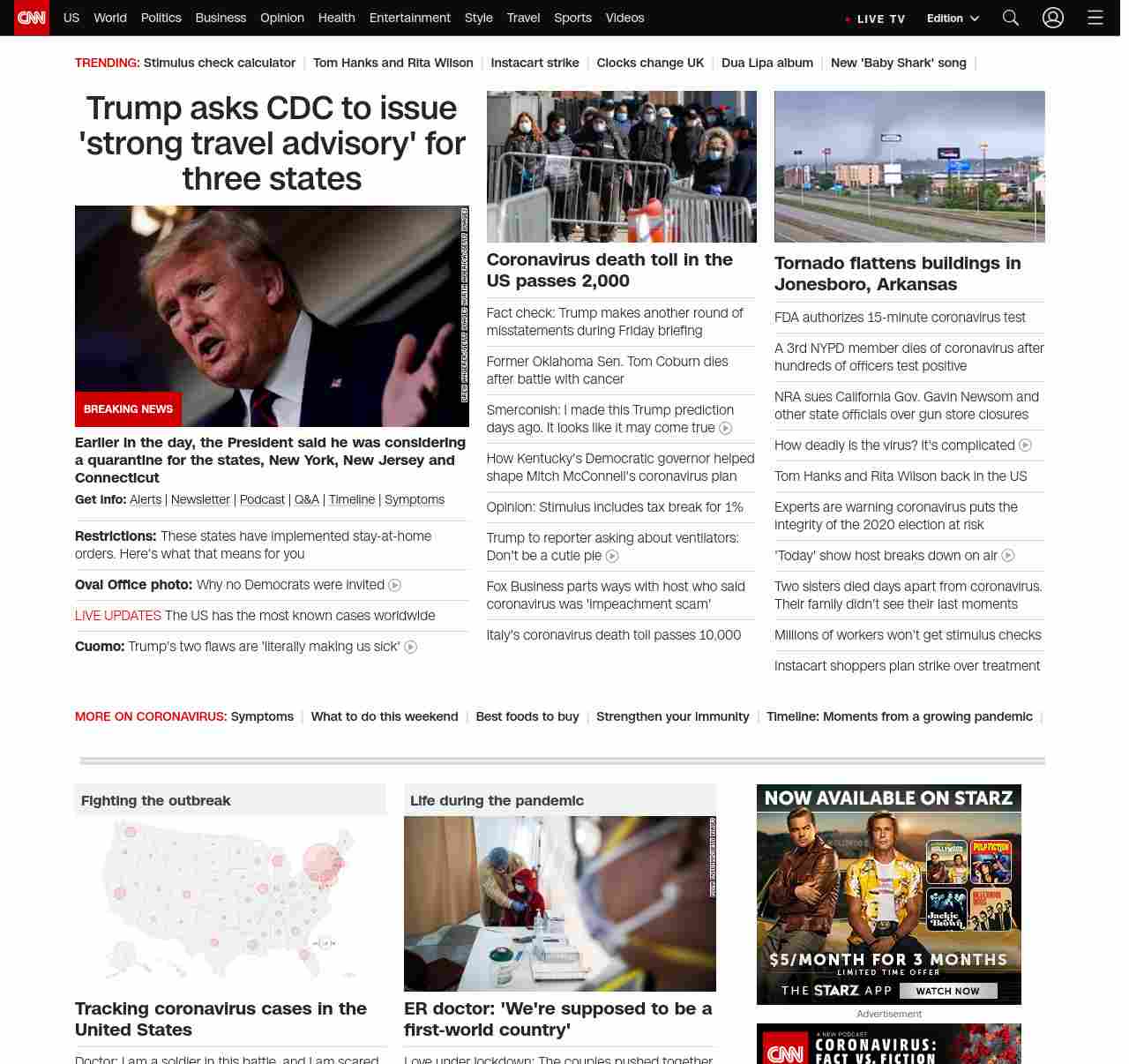|| screaming-banner-text banner-text-size–char-32″ data-analytics=”_list-hierarchical-xs_hyperlink_”> US coronavirus deaths top 2,000 ||” , title: “CNN – Breaking News, Latest News and Videos” , siblings: {“articleList”:[{“uri”:”/2020/03/23/us/coronavirus-which-states-stay-at-home-order-trnd/index.html”,”headline”:”u003cstrong>Restrictions: u003c/strong>These states have implemented stay-at-home orders. Here’s what that means for you “,”thumbnail”:”//cdn.cnn.com/cnnnext/dam/assets/200323103821-01-new-york-coronavirus-empty-streets-0322-small-11.jpg”,”duration”:””,”description”:”As the US grapples with the u003ca href=”https://www.cnn.com/specials/world/coronavirus-outbreak-intl-hnk” target=”_blank”>rapid spread of the novel coronavirus u003c/a>that has the u003ca href=”https://www.cnn.com/2020/03/23/health/us-coronavirus-updates-monday/index.html” target=”_blank”>health care system at a tipping pointu003c/a>, a growing number of states are ordering their residents to u003ca href=”https://www.cnn.com/2020/03/19/health/shelter-in-place-isolation-quarantine-definition/index.html” target=”_blank”>stay at home.u003c/a> “,”layout”:””